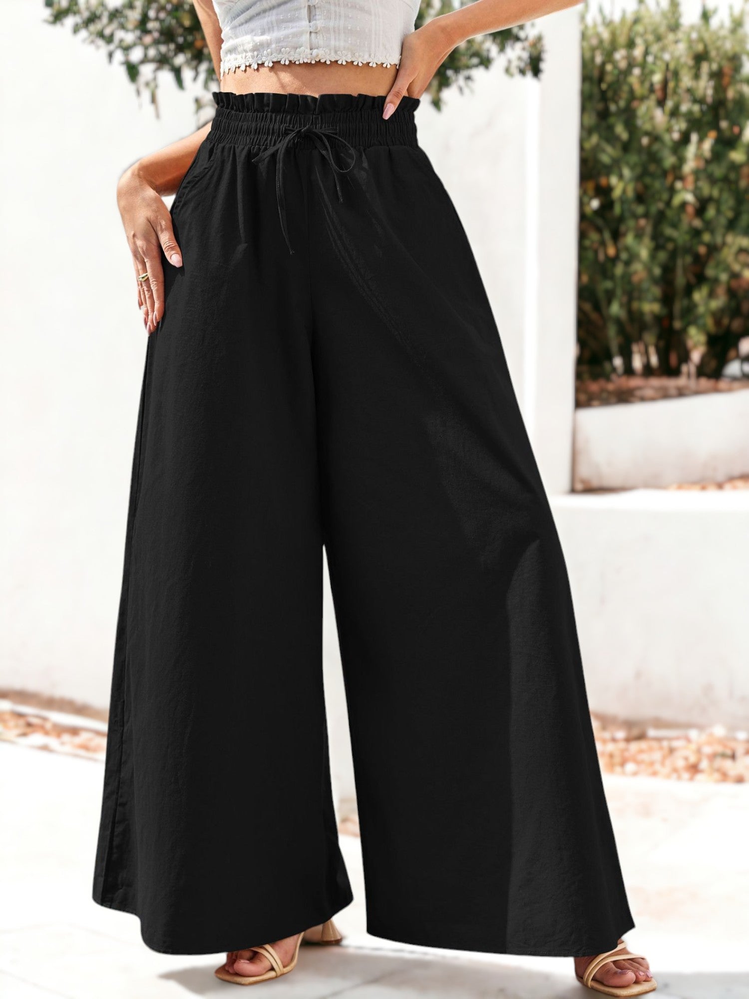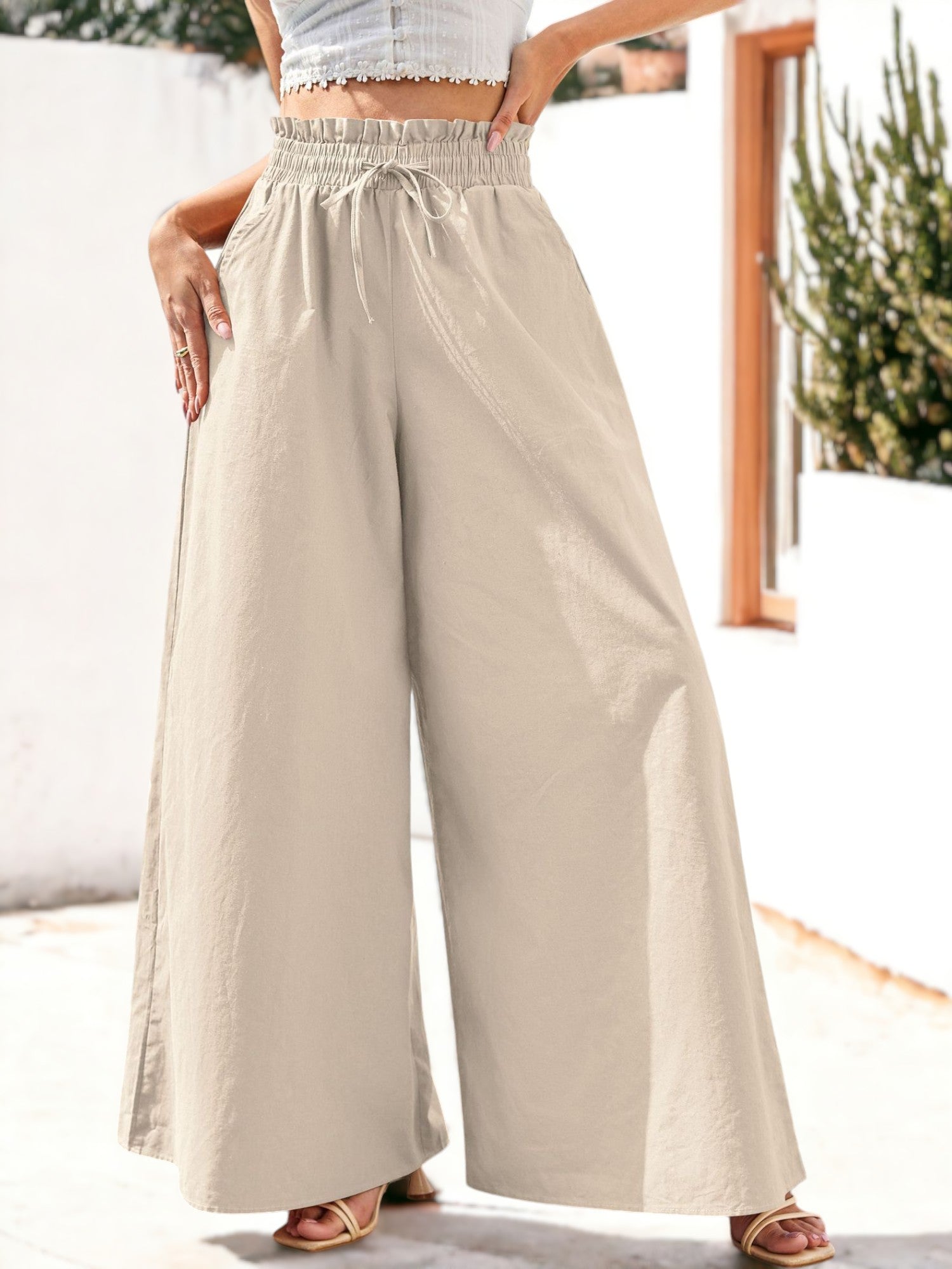 Adopte un estilo desenfadado con nuestros pantalones bohemios holgados de tiro alto y pernera ancha. Estos elegantes pantalones cuentan con una cómoda cintura alta fruncida que acentúa su silueta y garantiza un ajuste perfecto. El diseño holgado y de pernera ancha ofrece libertad de movimiento y un estilo bohemio relajado. Perfectos para salidas informales, días de playa o festivales, estos pantalones versátiles se pueden combinar con un top corto o una blusa suelta para lograr un look relajado pero a la moda. Agregue un toque de encanto bohemio a su guardarropa con estos pantalones imprescindibles.