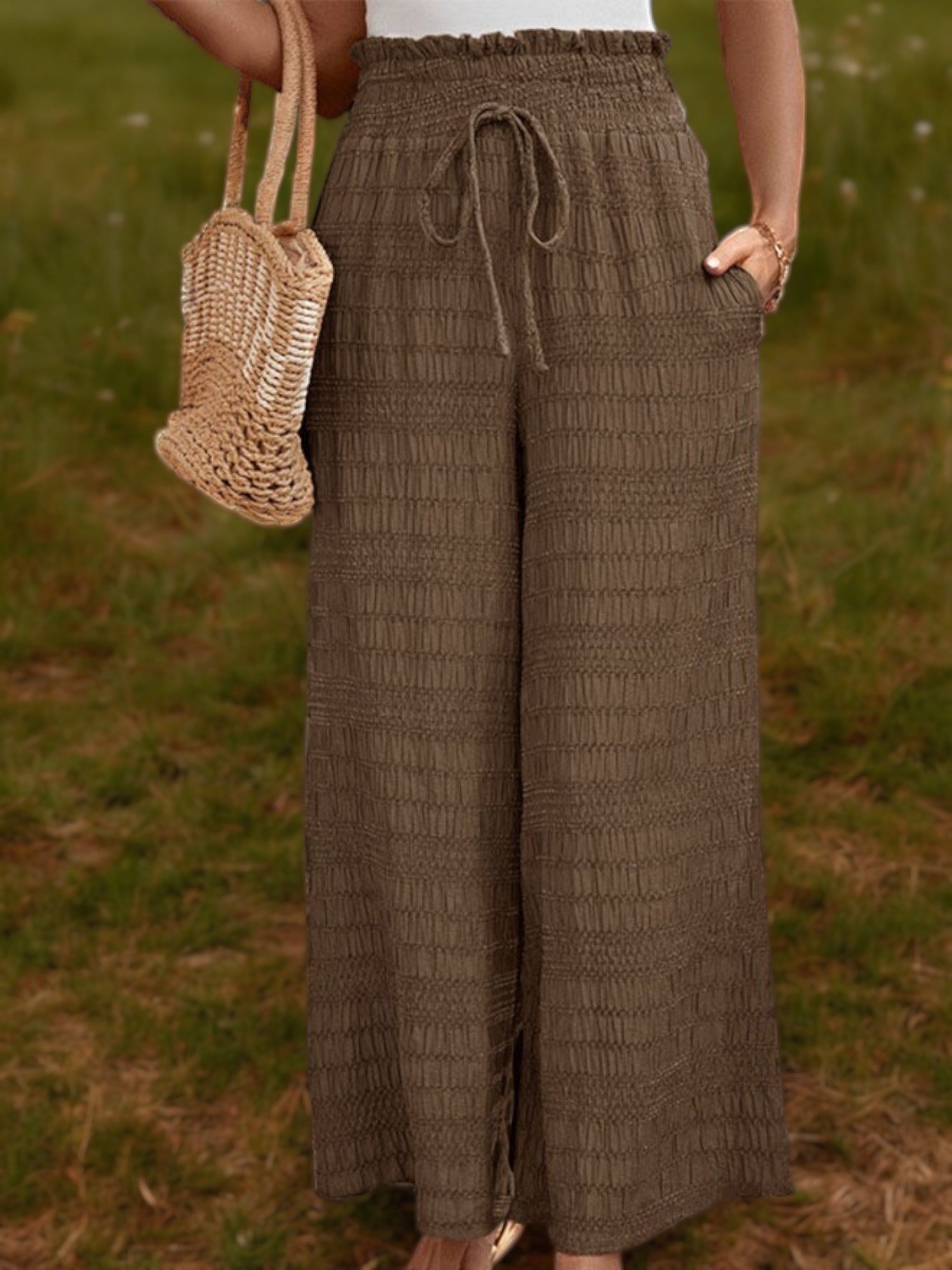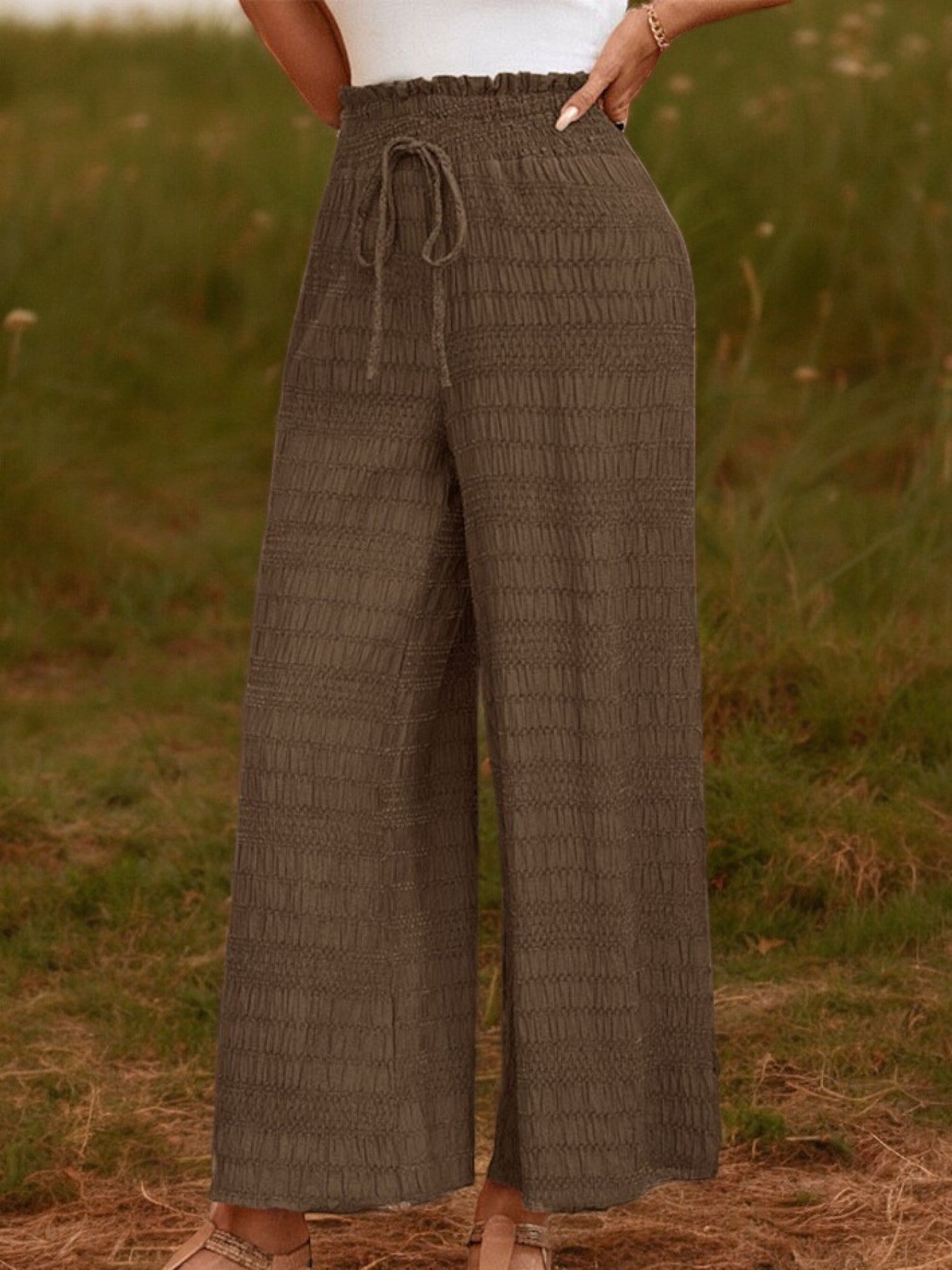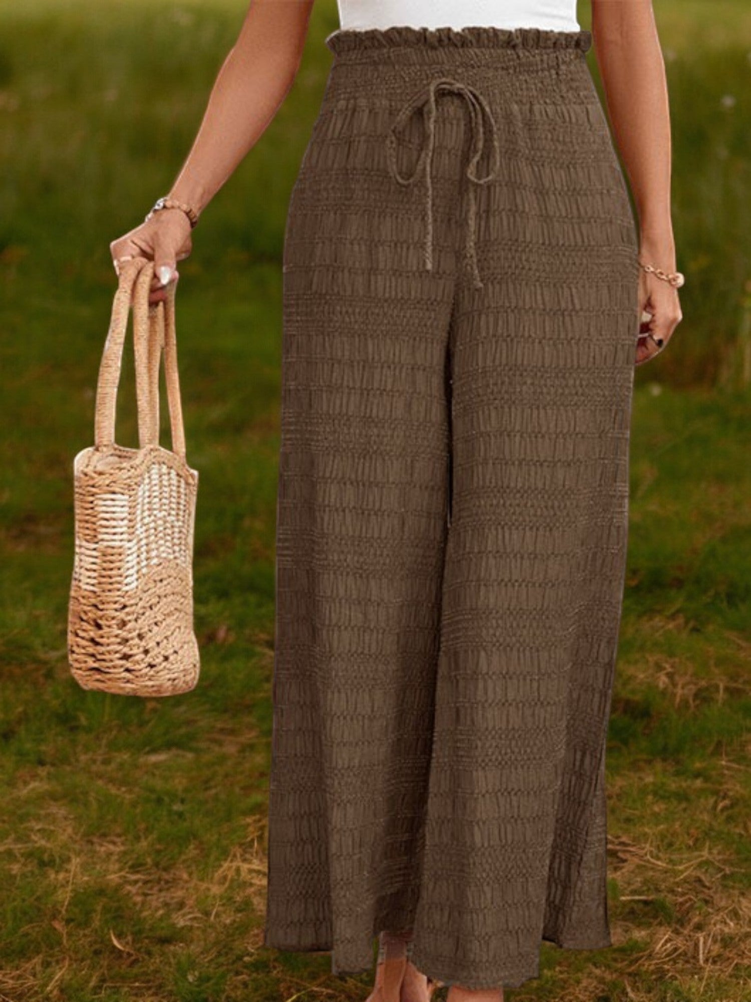 Estos elegantes pantalones tienen cintura alta y un diseño fruncido para un ajuste cómodo y ceñido. La silueta de pierna ancha brinda una sensación relajada y aireada, perfecta para salidas informales o para relajarse. La cintura con cordón permite una comodidad ajustable, lo que hace que estos pantalones sean elegantes y prácticos. Combínalos con una blusa sencilla y sandalias para lograr un estilo moderno y desenfadado.