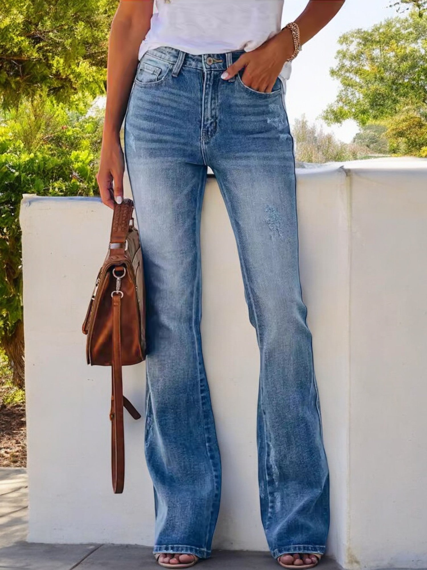 Vaqueros acampanados de cintura alta para mujer de Anna-Kaci con ligeros efectos desgastados y corte clásico