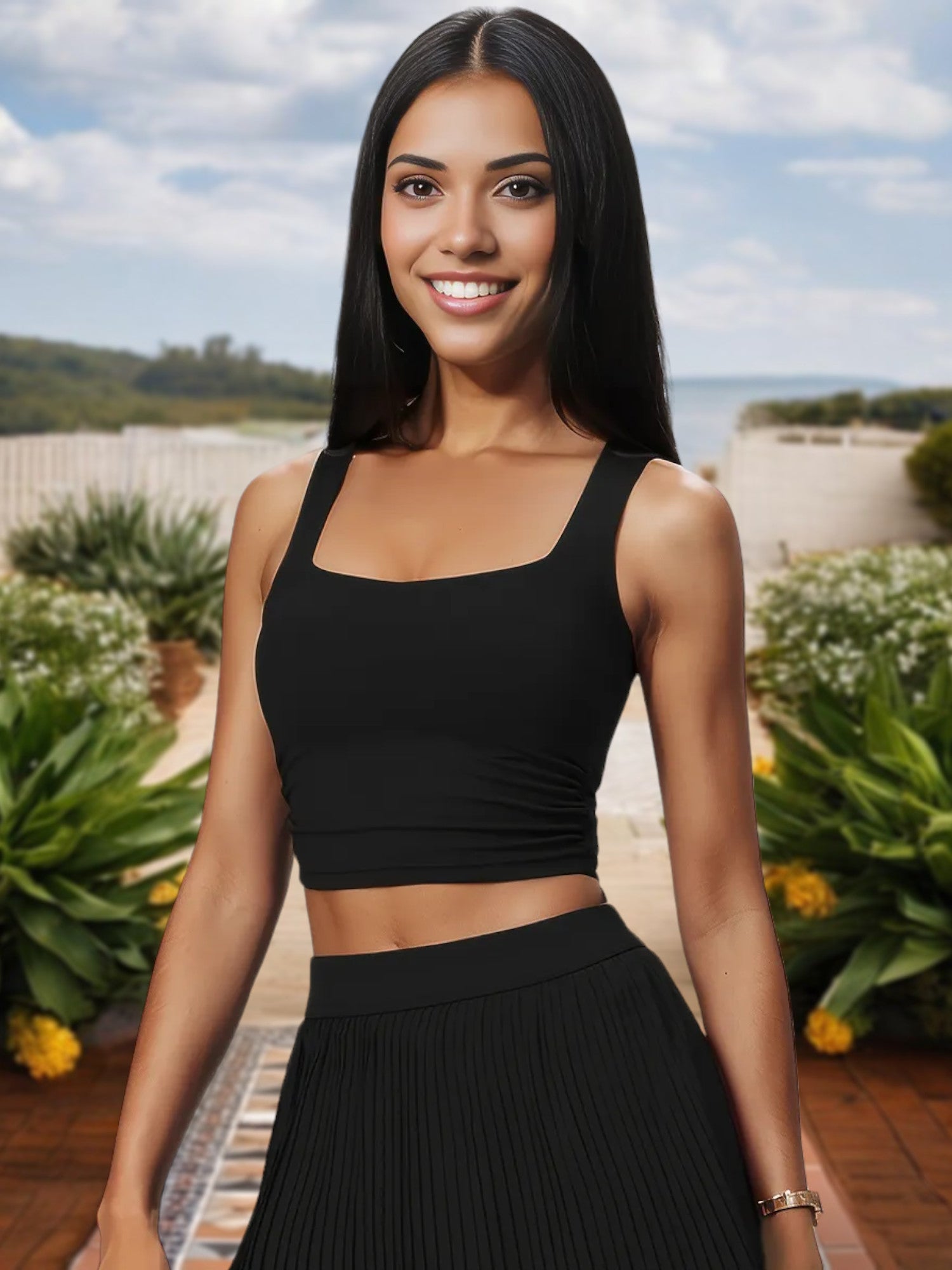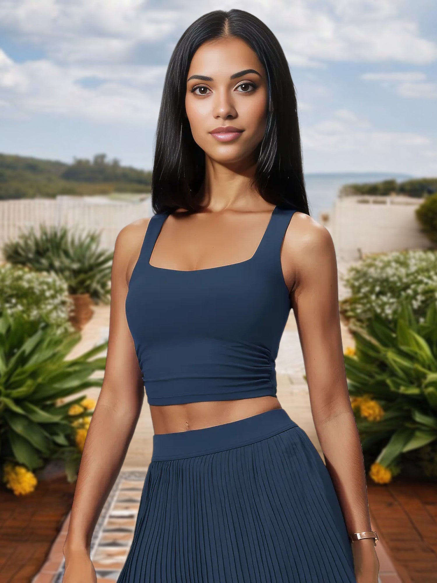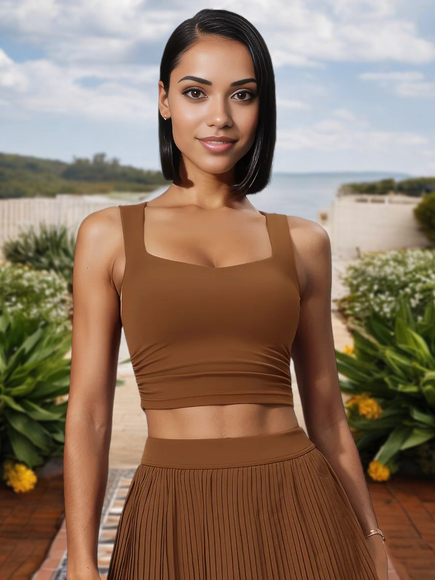 El top corto de escote cuadrado para mujer con corte elástico y laterales fruncidos ofrece un look elegante y contemporáneo perfecto para cualquier ocasión. Con un favorecedor escote cuadrado, este top corto acentúa tu clavícula y añade un toque elegante a tu atuendo. Los laterales fruncidos proporcionan un elemento de diseño único al tiempo que garantizan un ajuste cómodo y ajustable. Fabricado con tejido elástico de alta calidad, este top ofrece máxima comodidad y libertad de movimiento, lo que lo hace ideal tanto para uso informal como para sesiones de entrenamiento. Combínalo con vaqueros de cintura alta, faldas o leggings para una incorporación versátil y moderna a tu guardarropa.