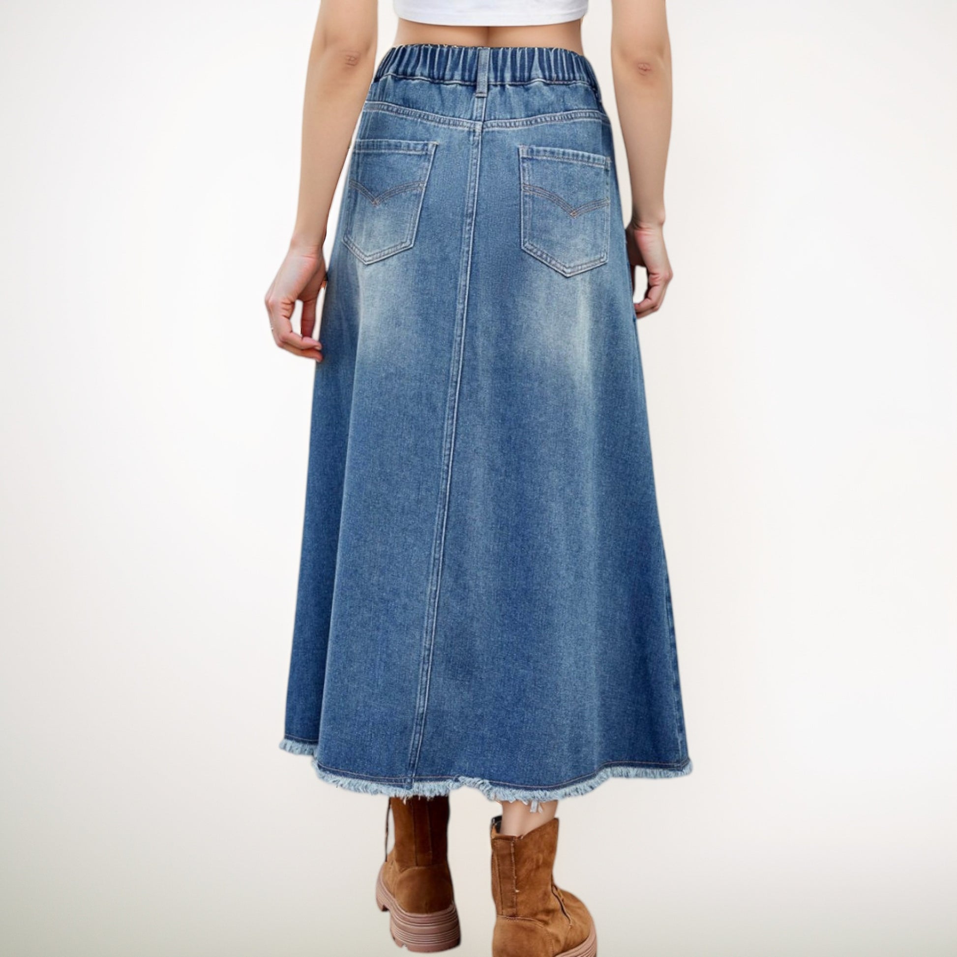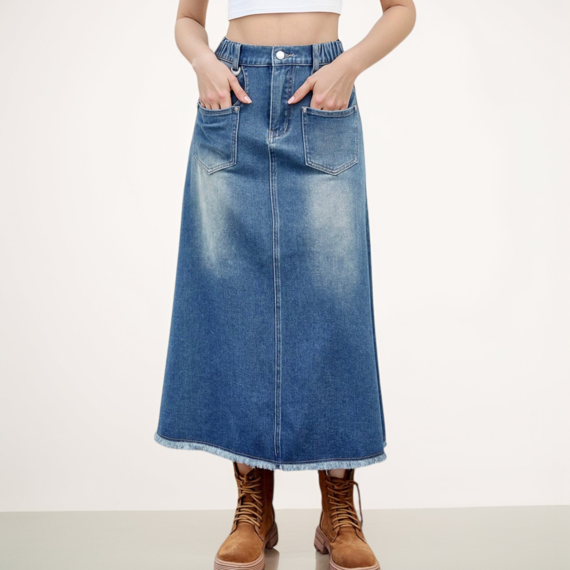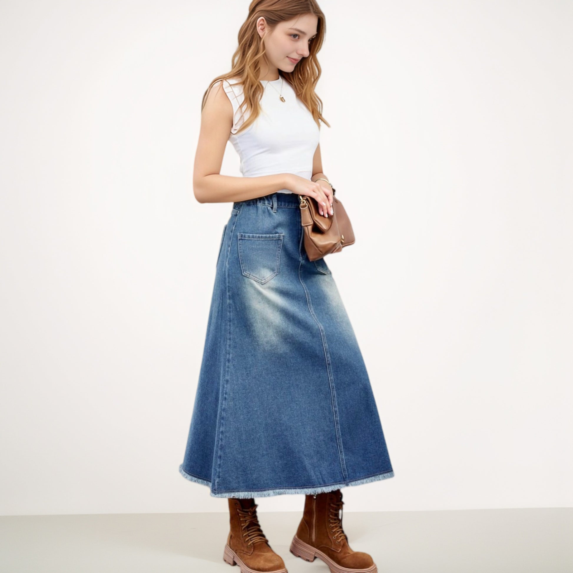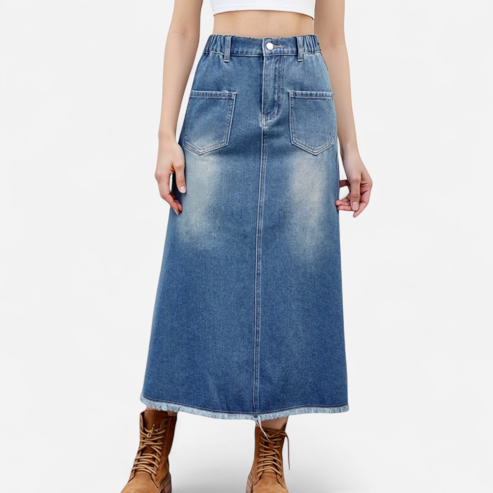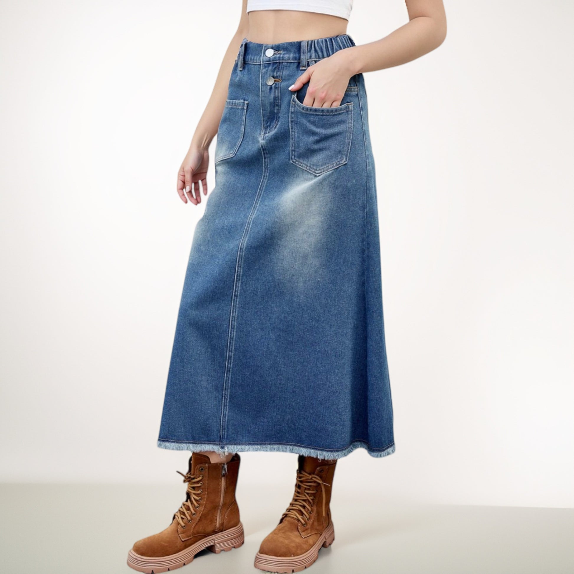 Anna-Kaci Women's High Waist A-Line Denim Maxi Skirt with Front Patch Pockets and Raw Hem Detail