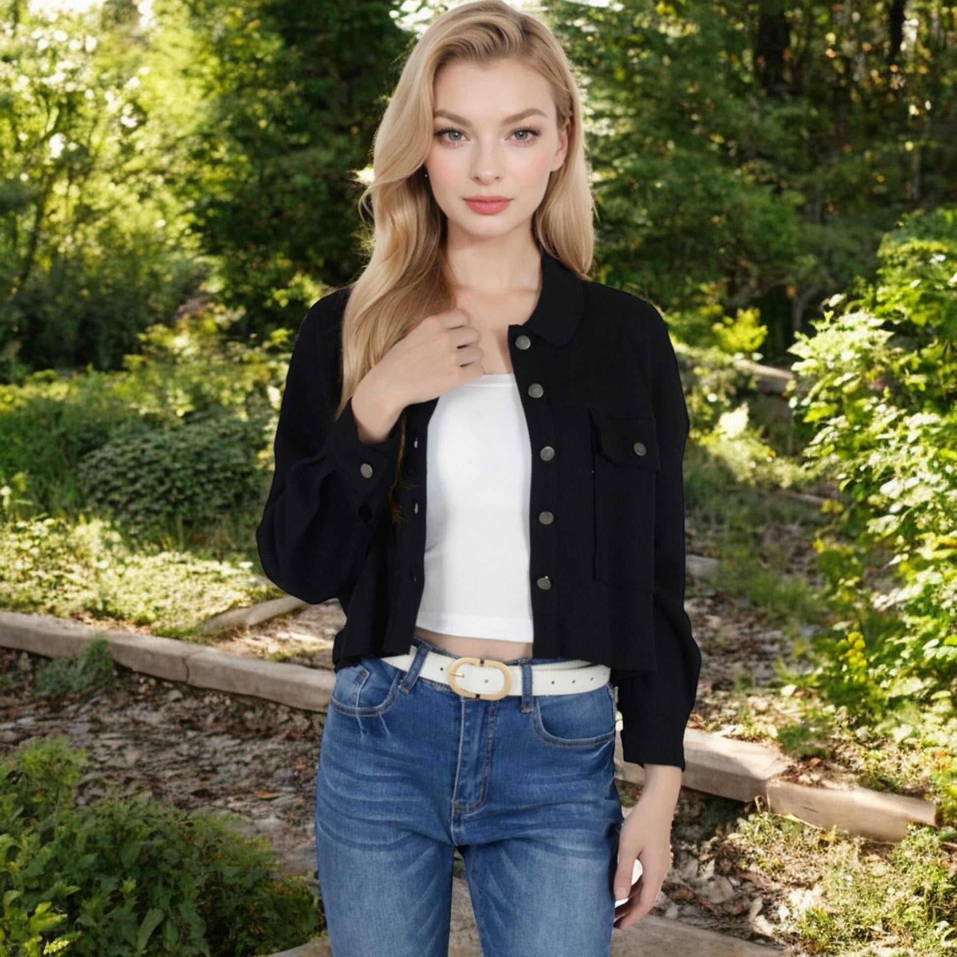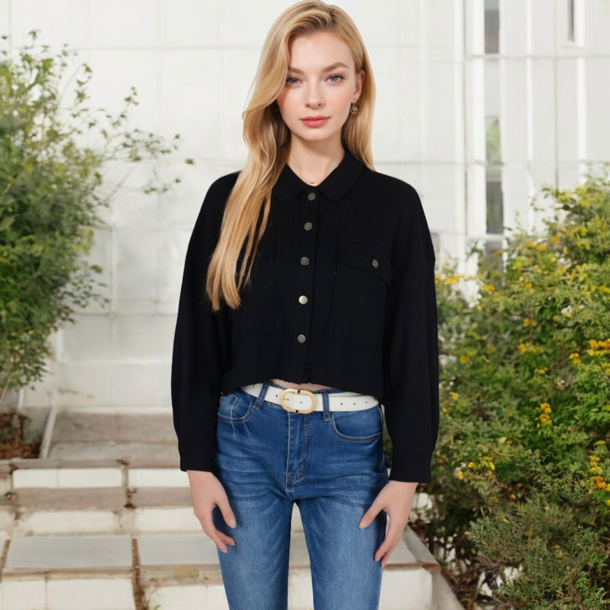 Anna-Kaci Women's Cropped Button-Up Jacket with Chest Pockets and Collared Neckline
