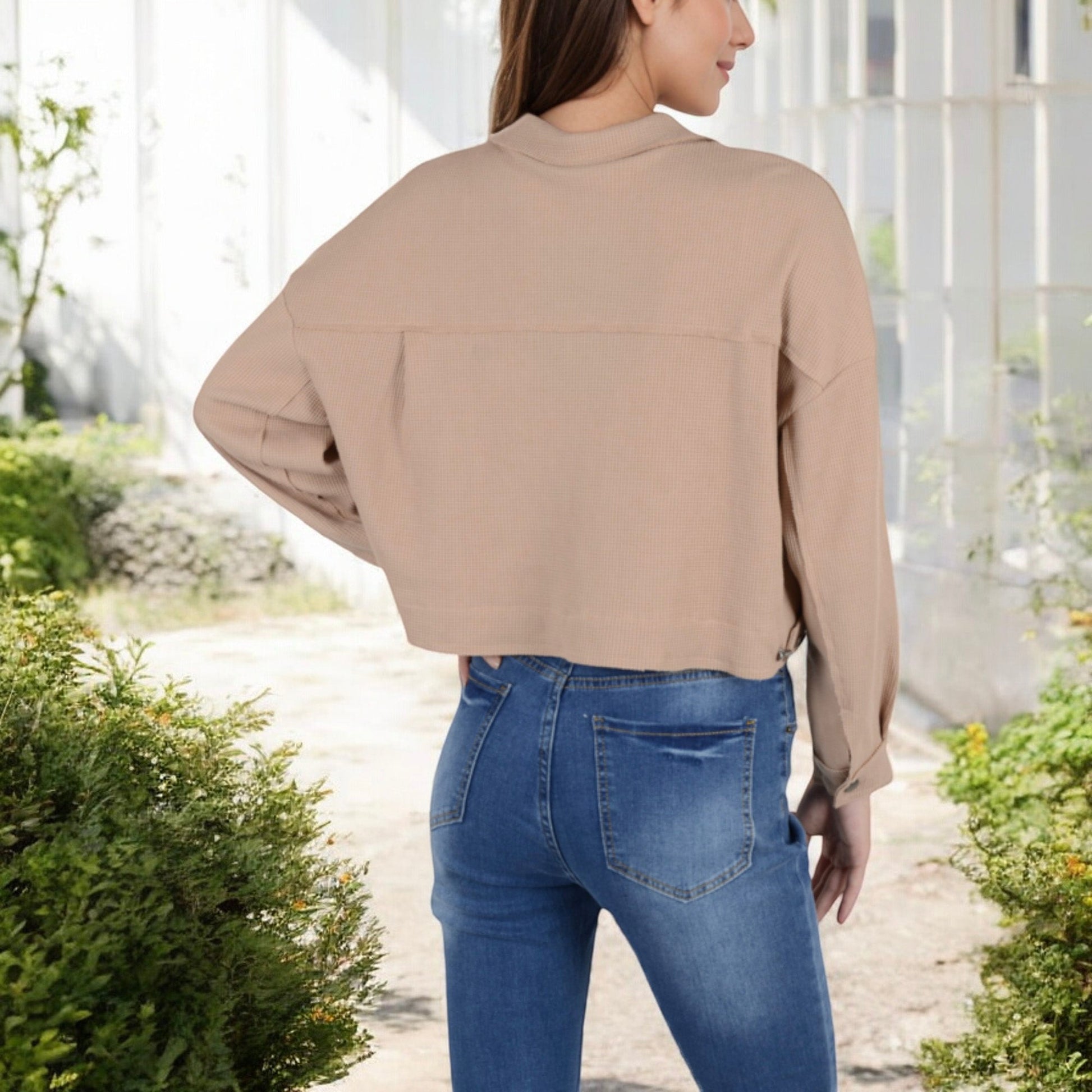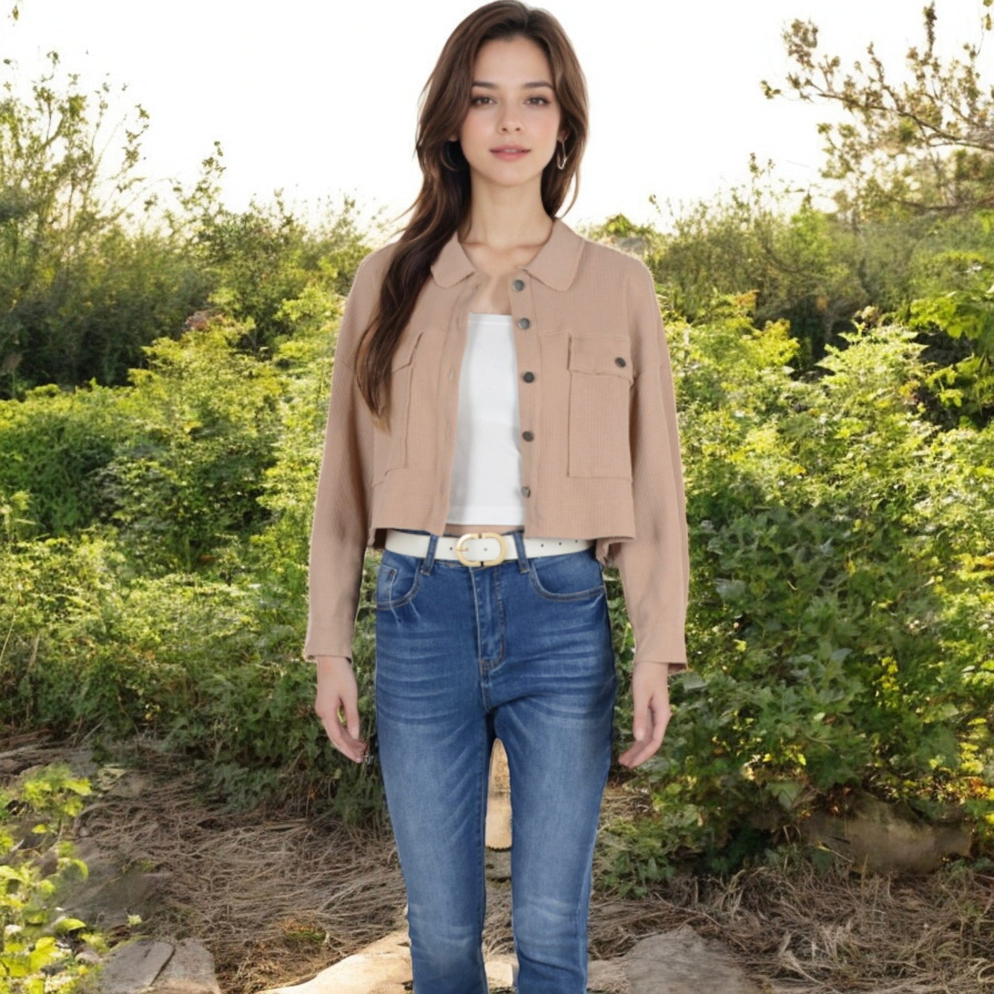 This Anna-Kaci Women's Cropped Button-Up Jacket features a classic collared neckline and dual chest pockets, offering a versatile and stylish layer for your wardrobe. The lightweight fabric and relaxed fit make it perfect for transitional weather, pairing effortlessly with casual and semi-formal outfits. Whether layered over a tank top or styled with your favorite high-waisted jeans, this jacket adds a chic and polished touch to any look.