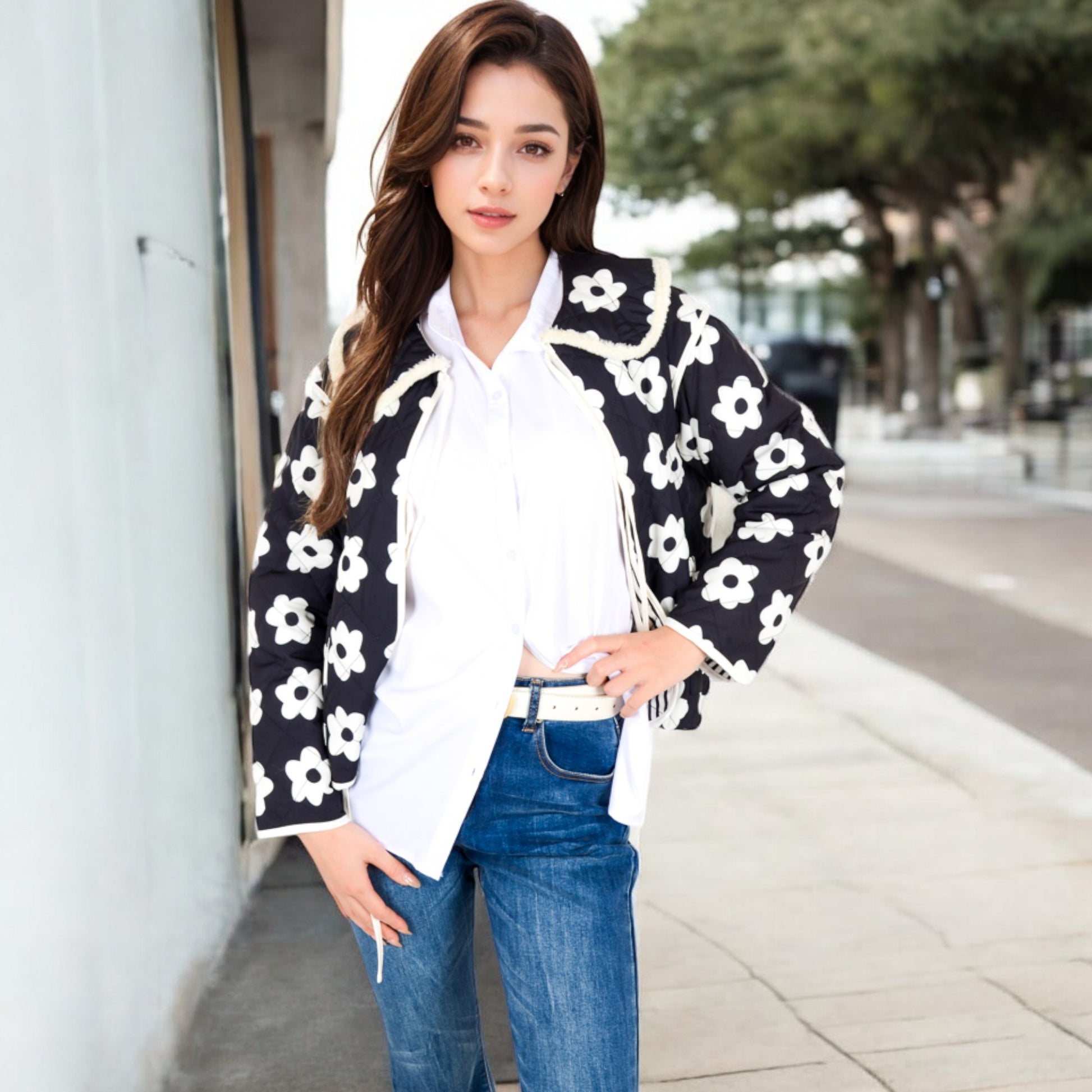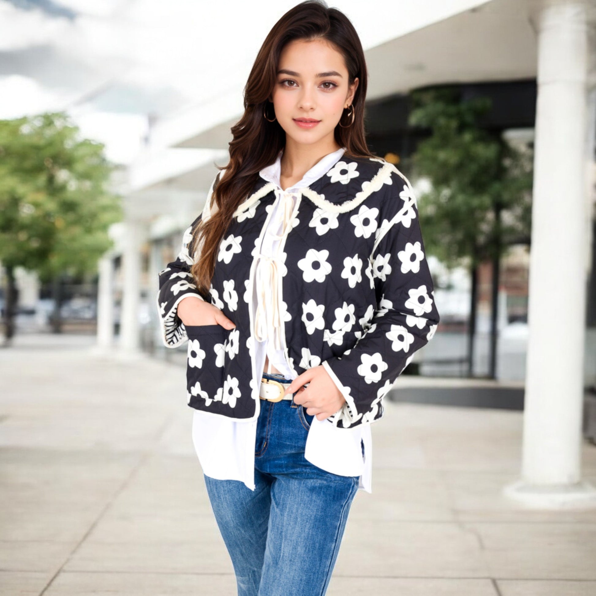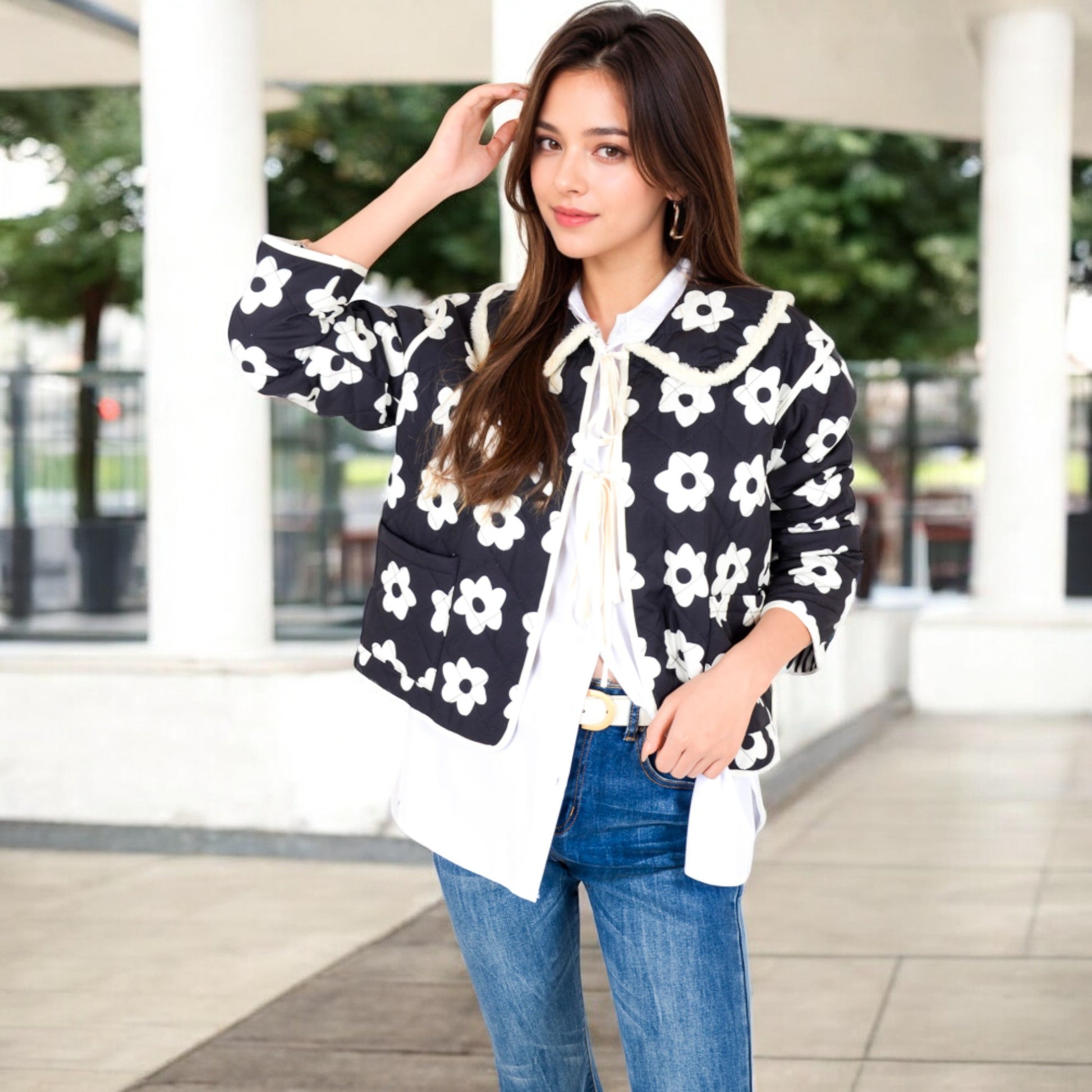 This floral quilted jacket features a charming Peter Pan collar and a tie closure for a whimsical touch. The soft, lightweight quilting provides warmth and comfort without compromising on style. Perfect for layering over casual or dressy outfits, this jacket adds a playful, retro-inspired vibe to your wardrobe. Elevate your outerwear collection with this statement piece that combines classic charm with modern flair.