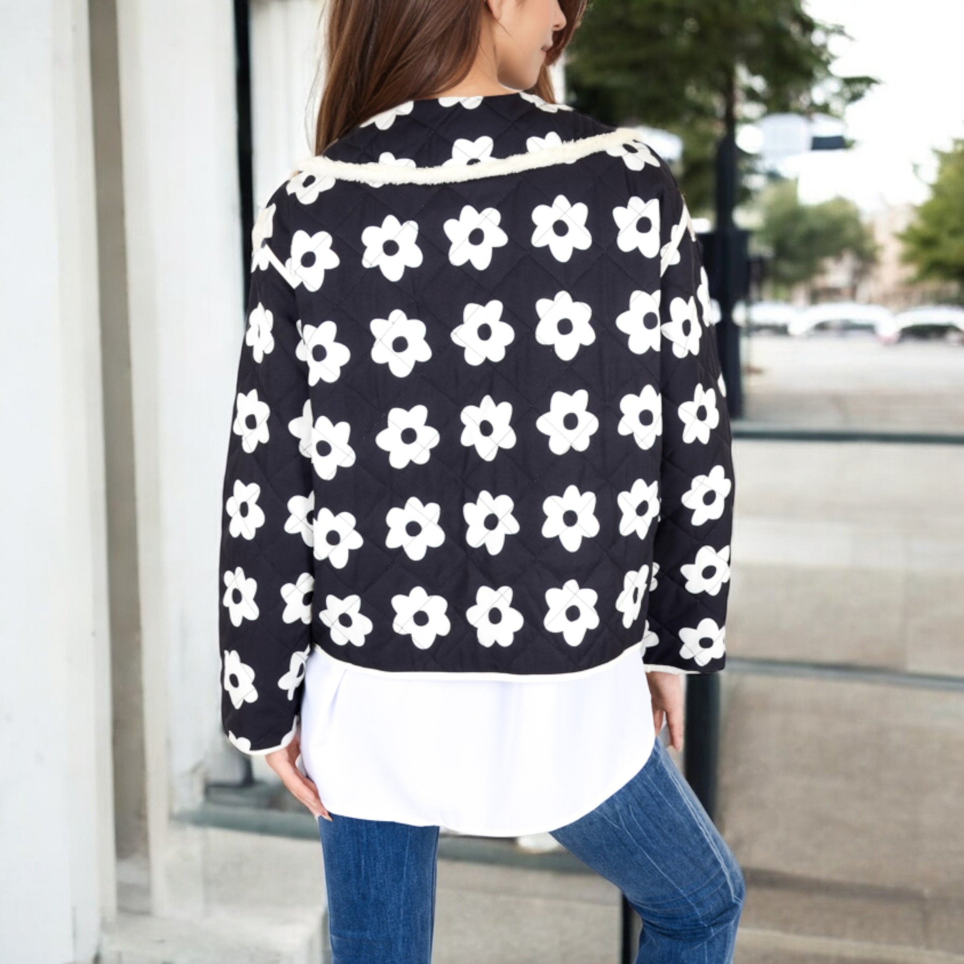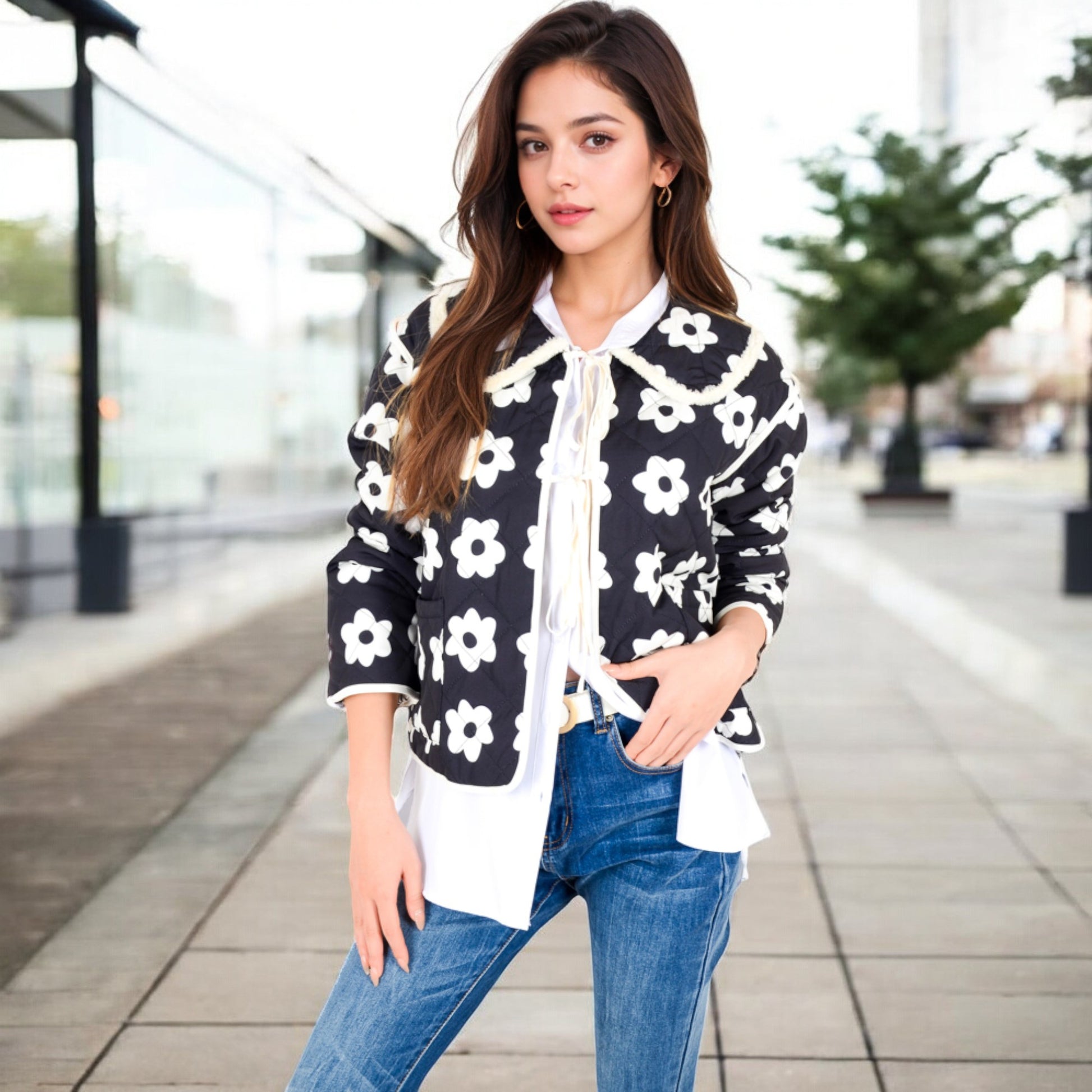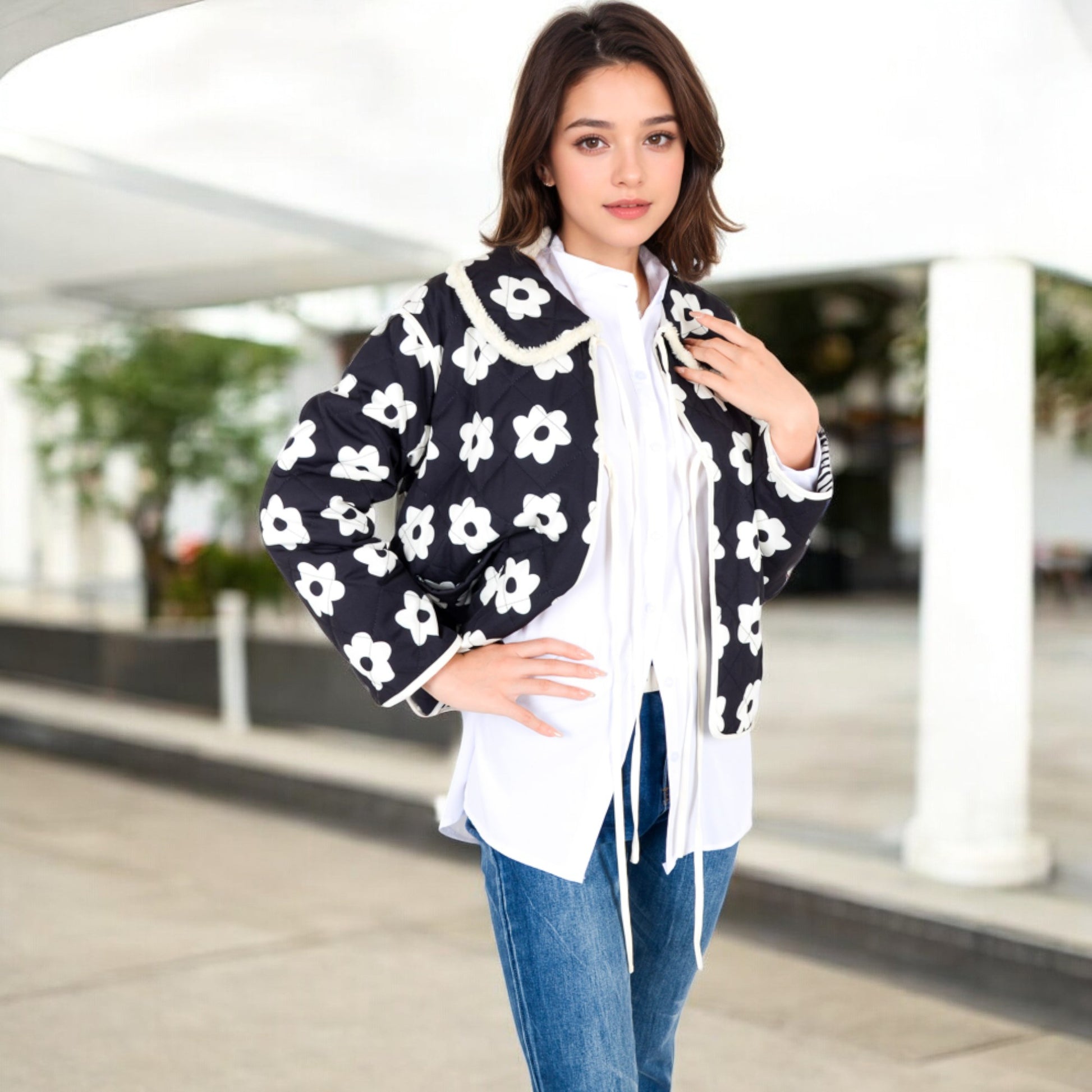 This floral quilted jacket features a charming Peter Pan collar and a tie closure for a whimsical touch. The soft, lightweight quilting provides warmth and comfort without compromising on style. Perfect for layering over casual or dressy outfits, this jacket adds a playful, retro-inspired vibe to your wardrobe. Elevate your outerwear collection with this statement piece that combines classic charm with modern flair.