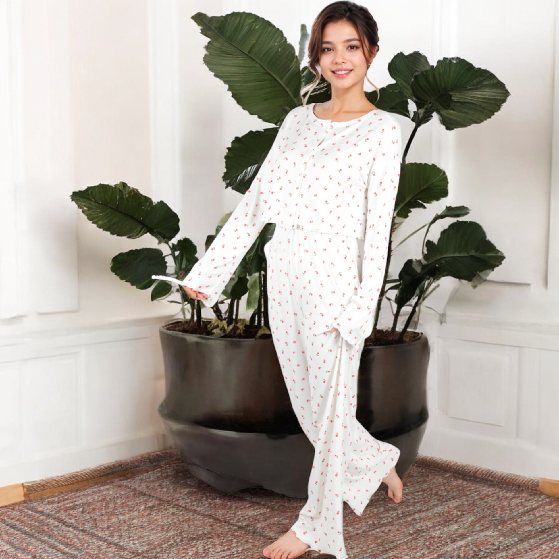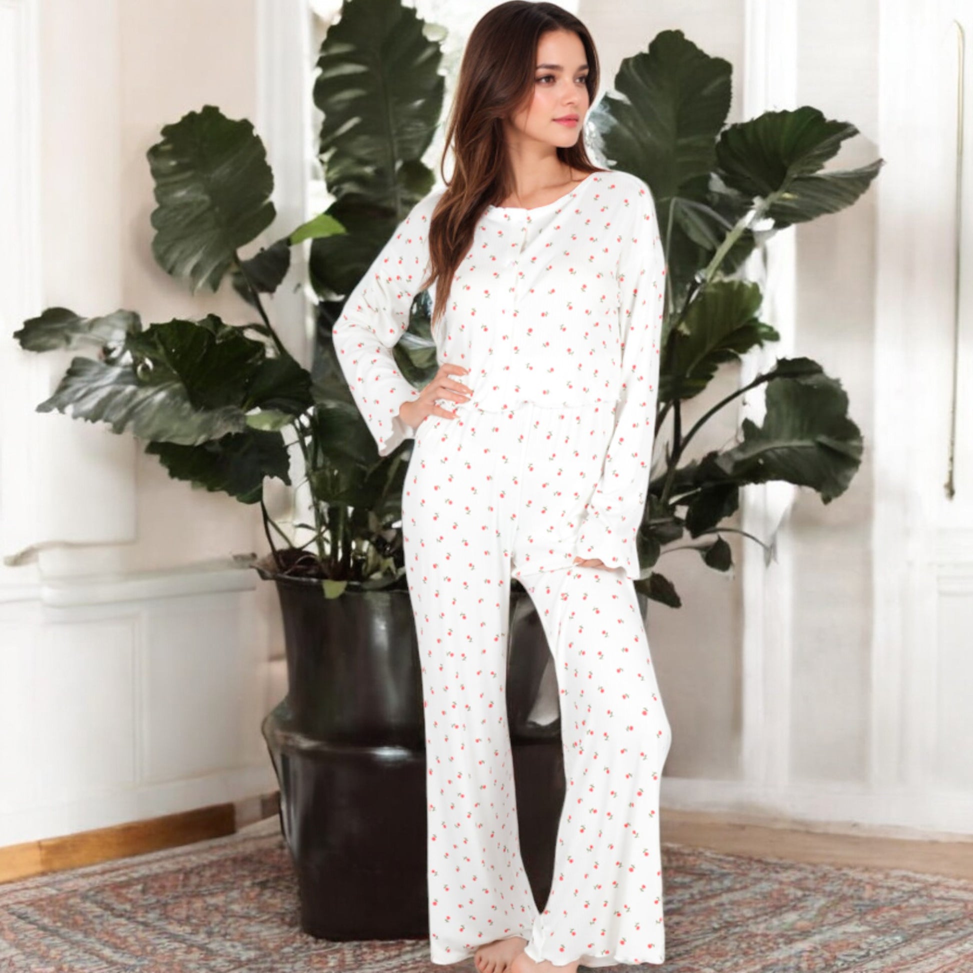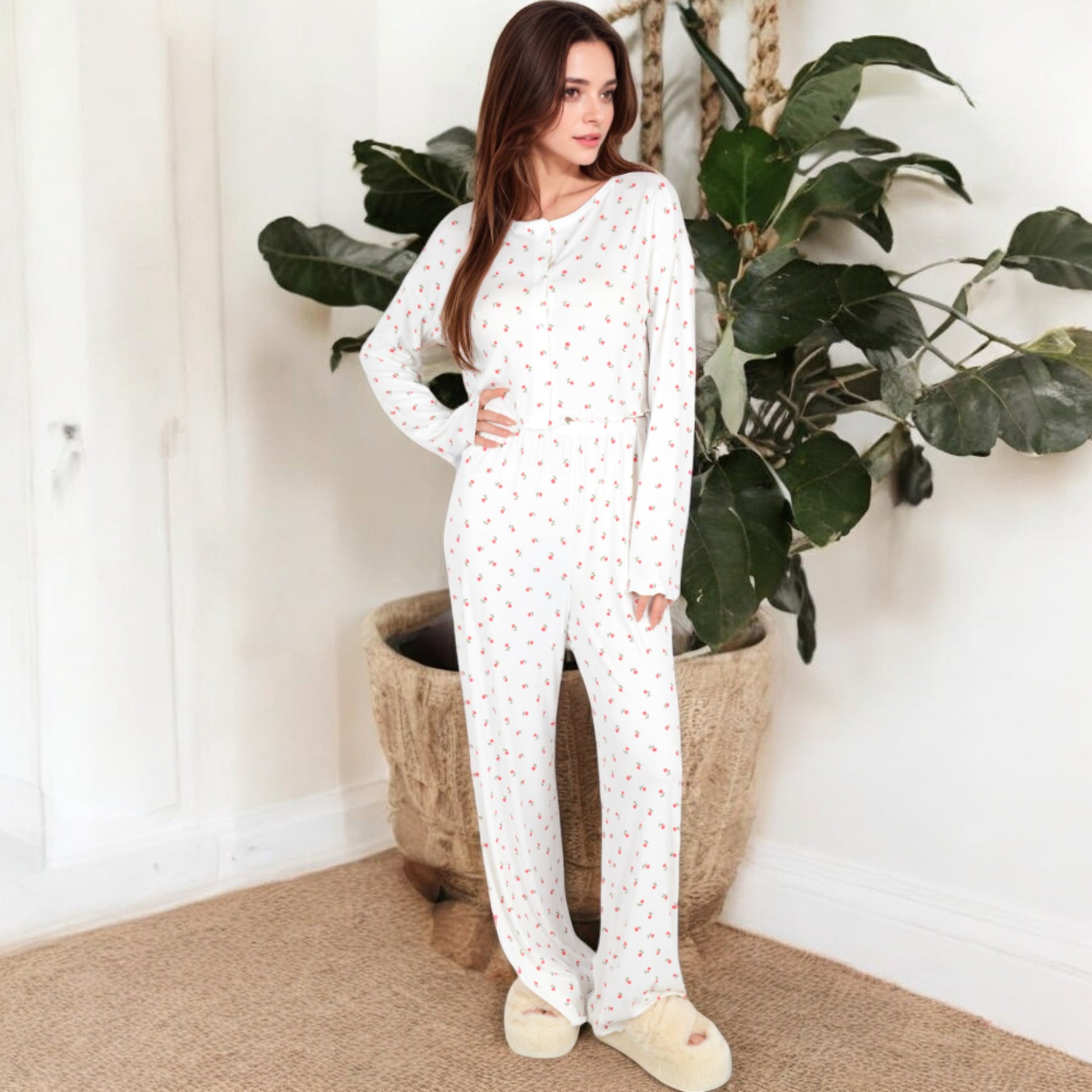 Anna-Kaci Women's 2-piece pajama set features a soft long-sleeve top paired with relaxed-fit elastic waist pants for ultimate comfort. Adorned with a delicate floral print, this set offers a charming and feminine touch. Made from lightweight, breathable fabric, it feels soft against the skin, perfect for lounging or resting. The versatile design combines style and relaxation, making it a must-have for any loungewear collection.