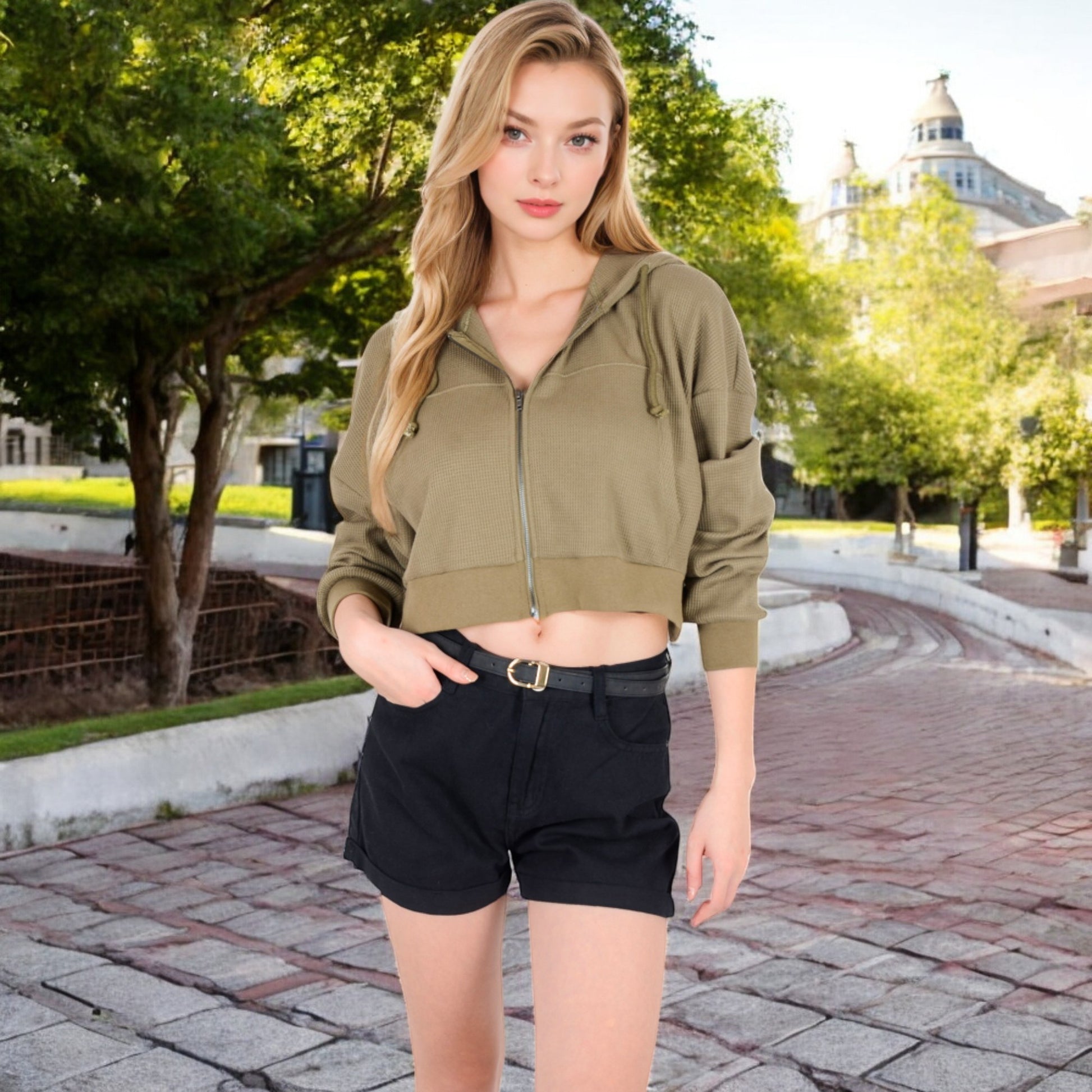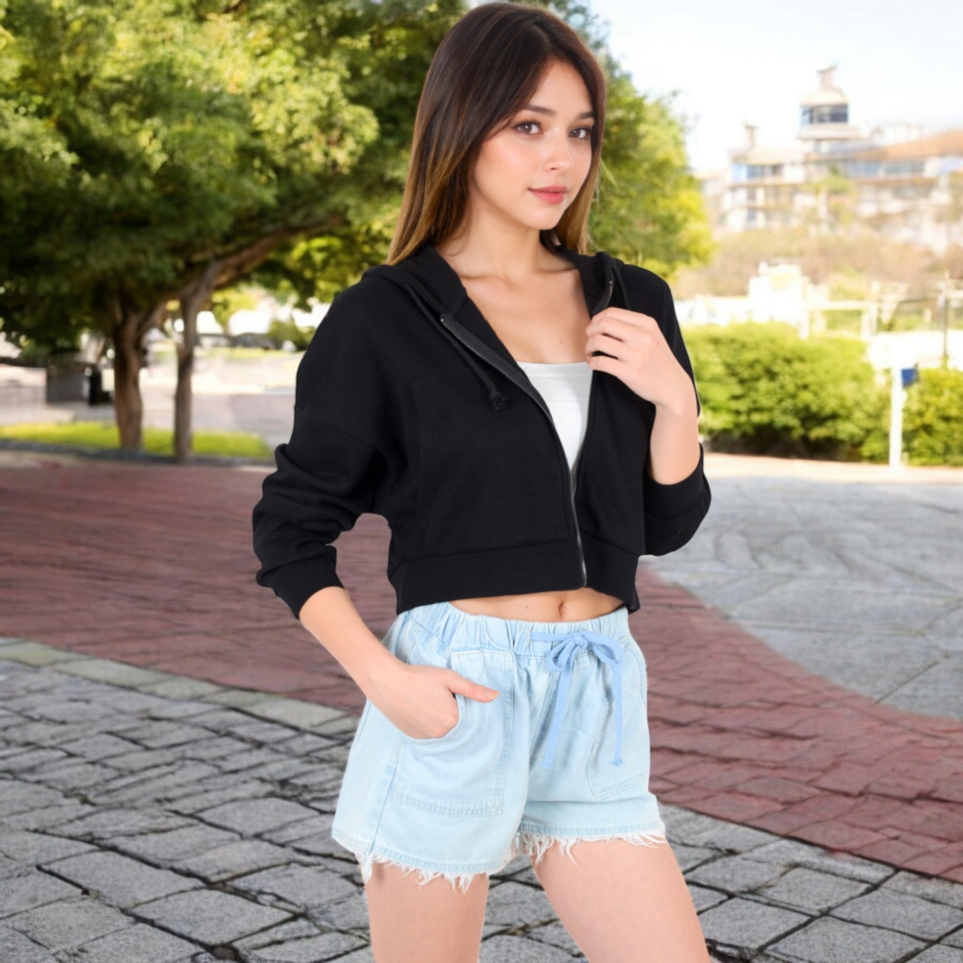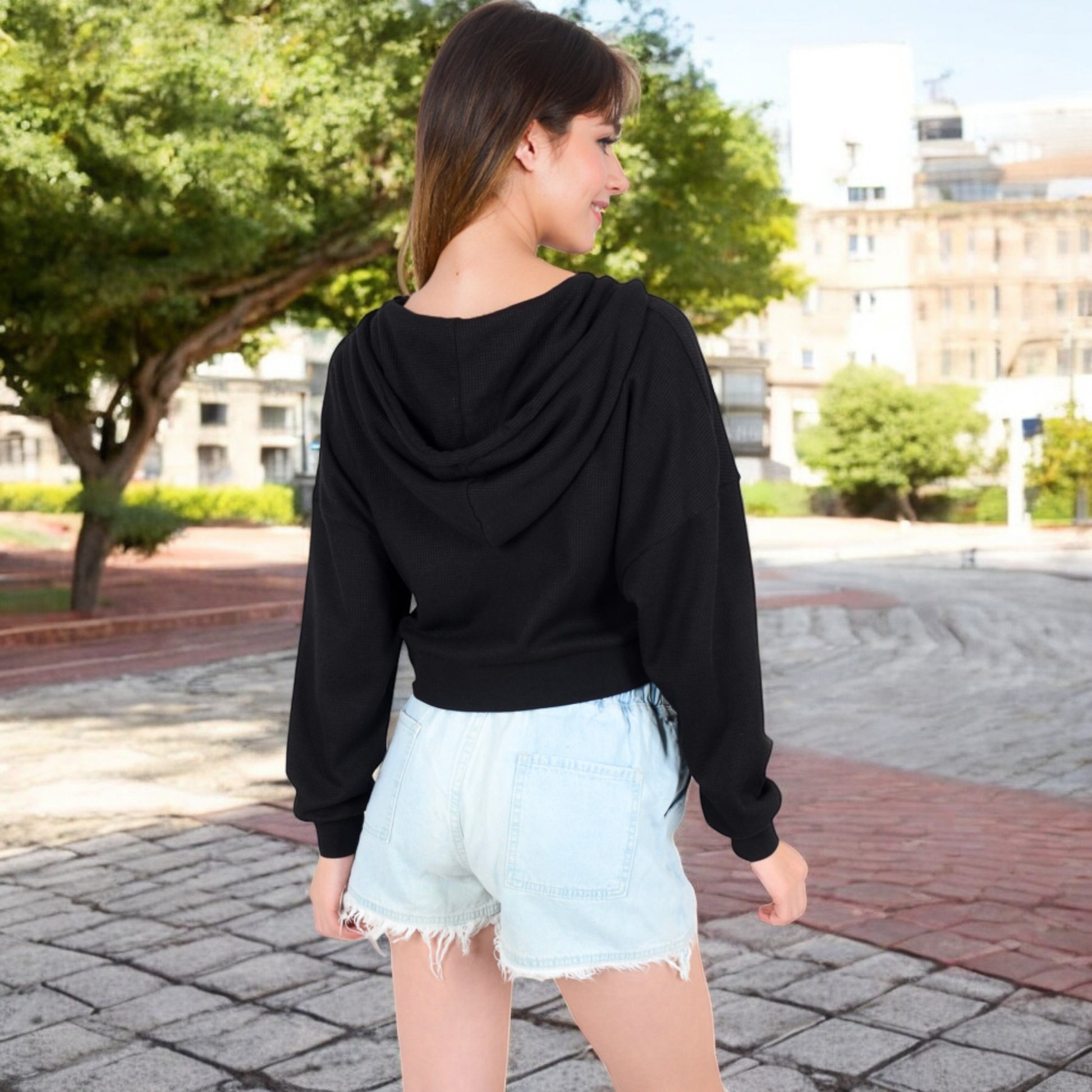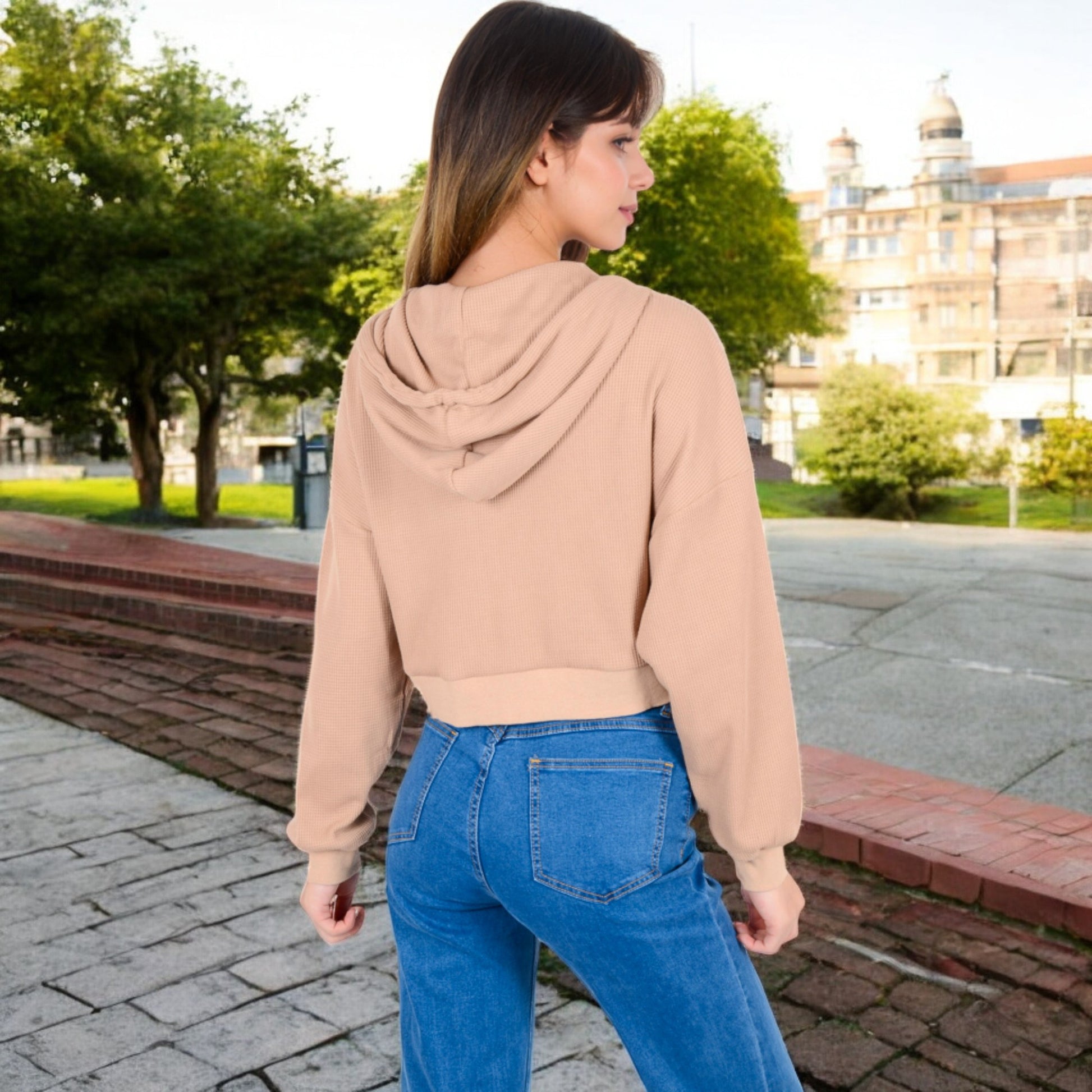 Anna-Kaci Women's Cropped Waffle Knit Zip-Up Hoodie with Drawstring