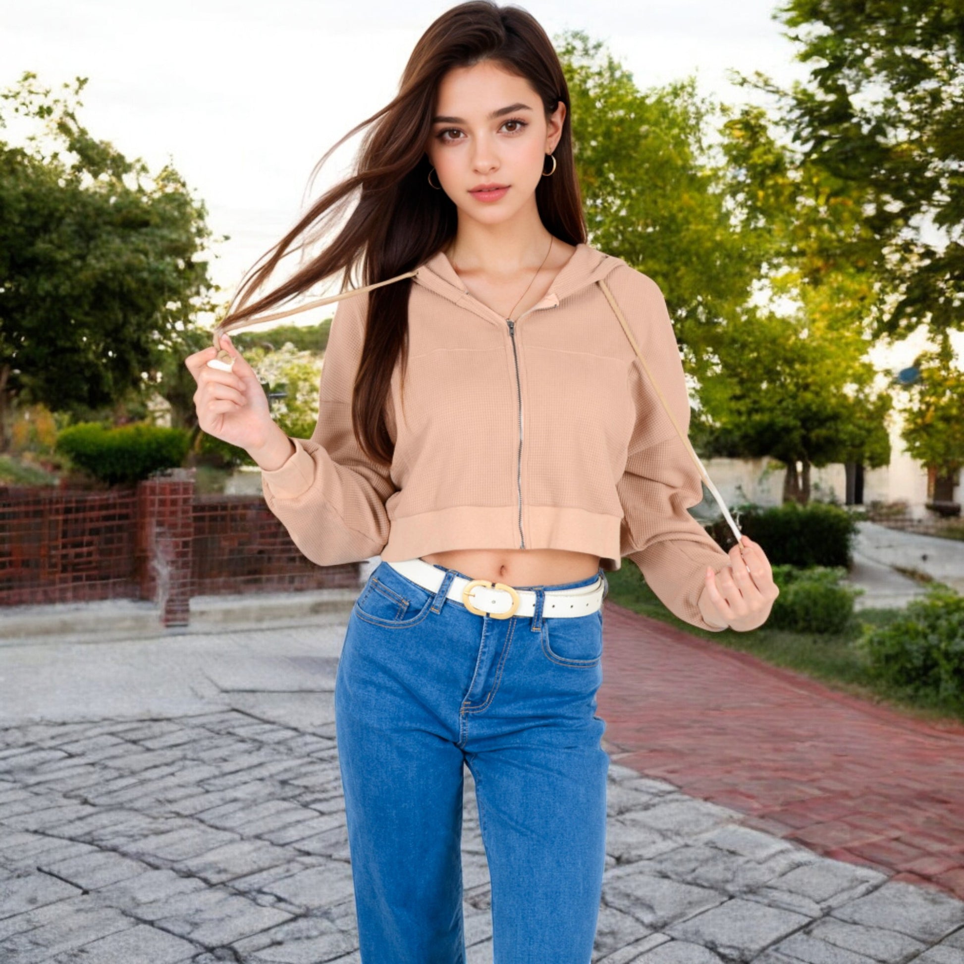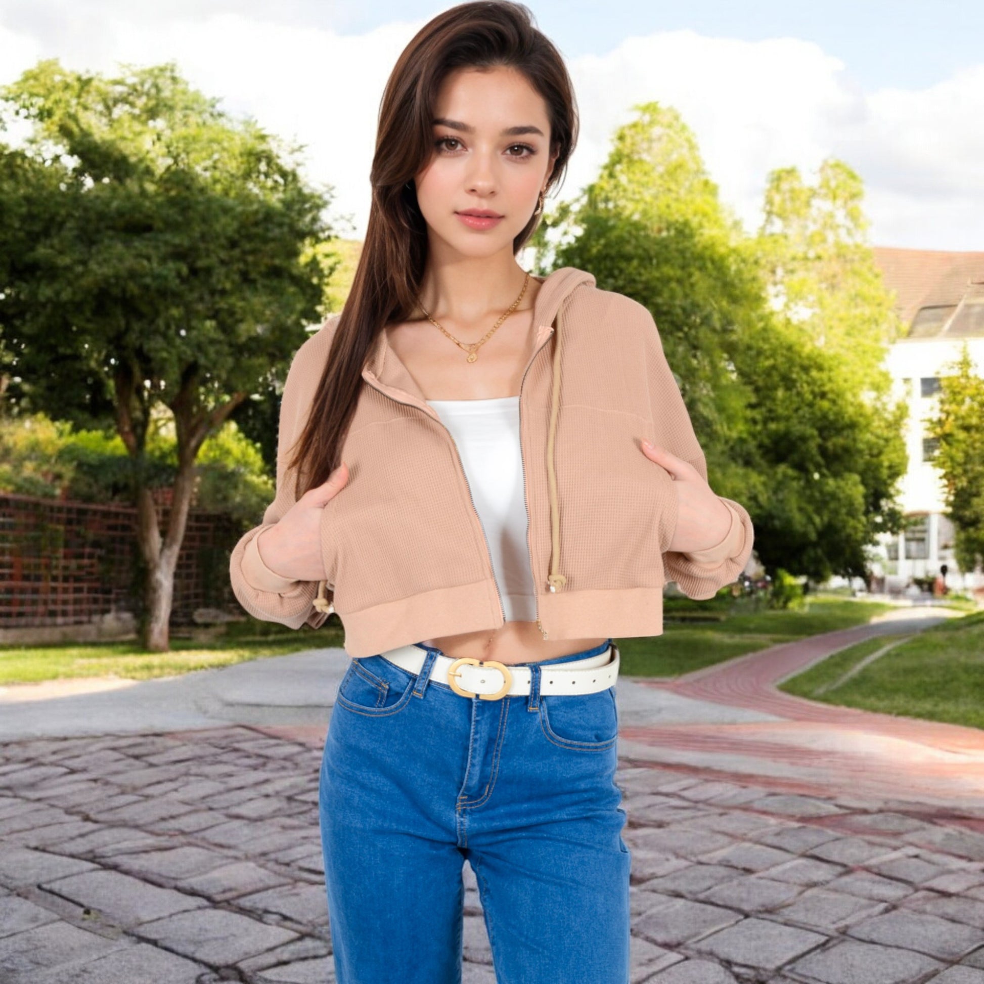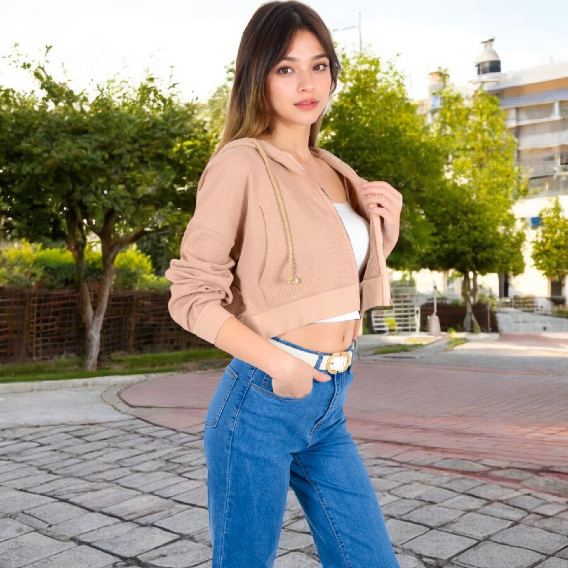 The Anna-Kaci Women's cropped waffle knit zip-up hoodie combines casual comfort with a stylish edge. Designed with a relaxed cropped silhouette, this hoodie features a soft waffle knit texture for added dimension. The zip-up front and adjustable drawstring hood add practicality, while the long sleeves offer lightweight coverage. Perfect for pairing with high-waisted jeans, leggings, or activewear for an effortlessly chic look.