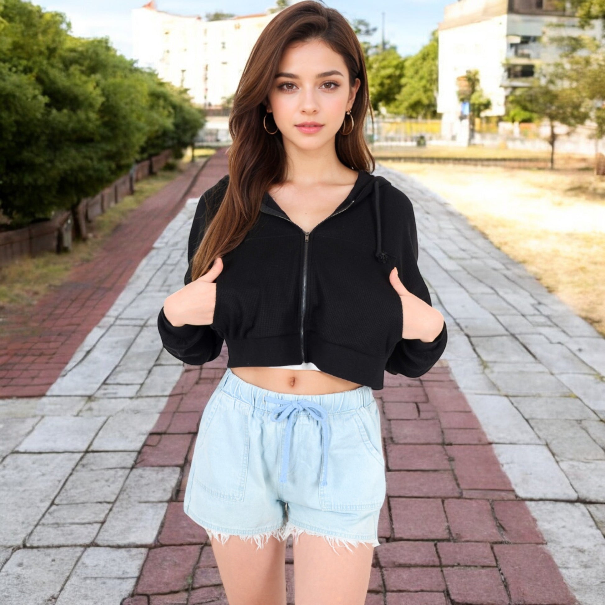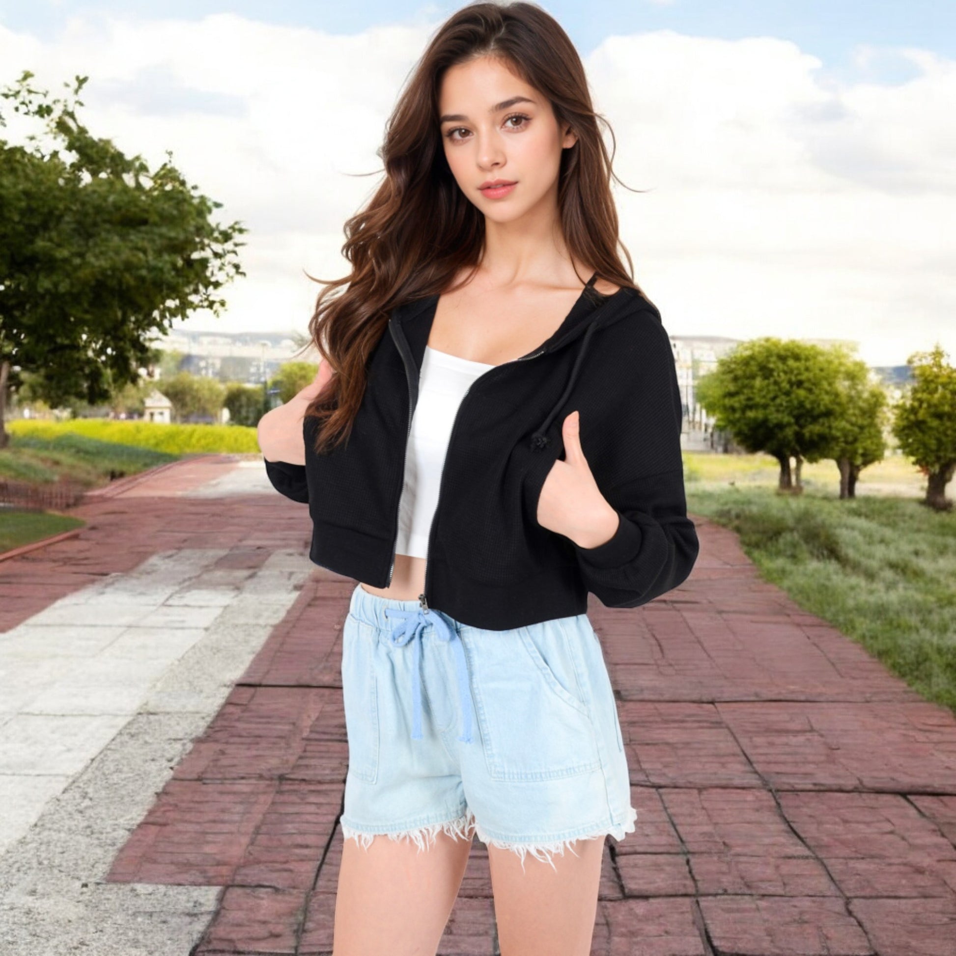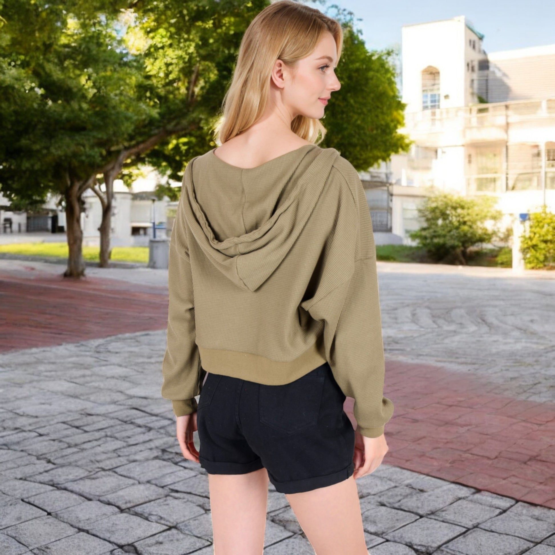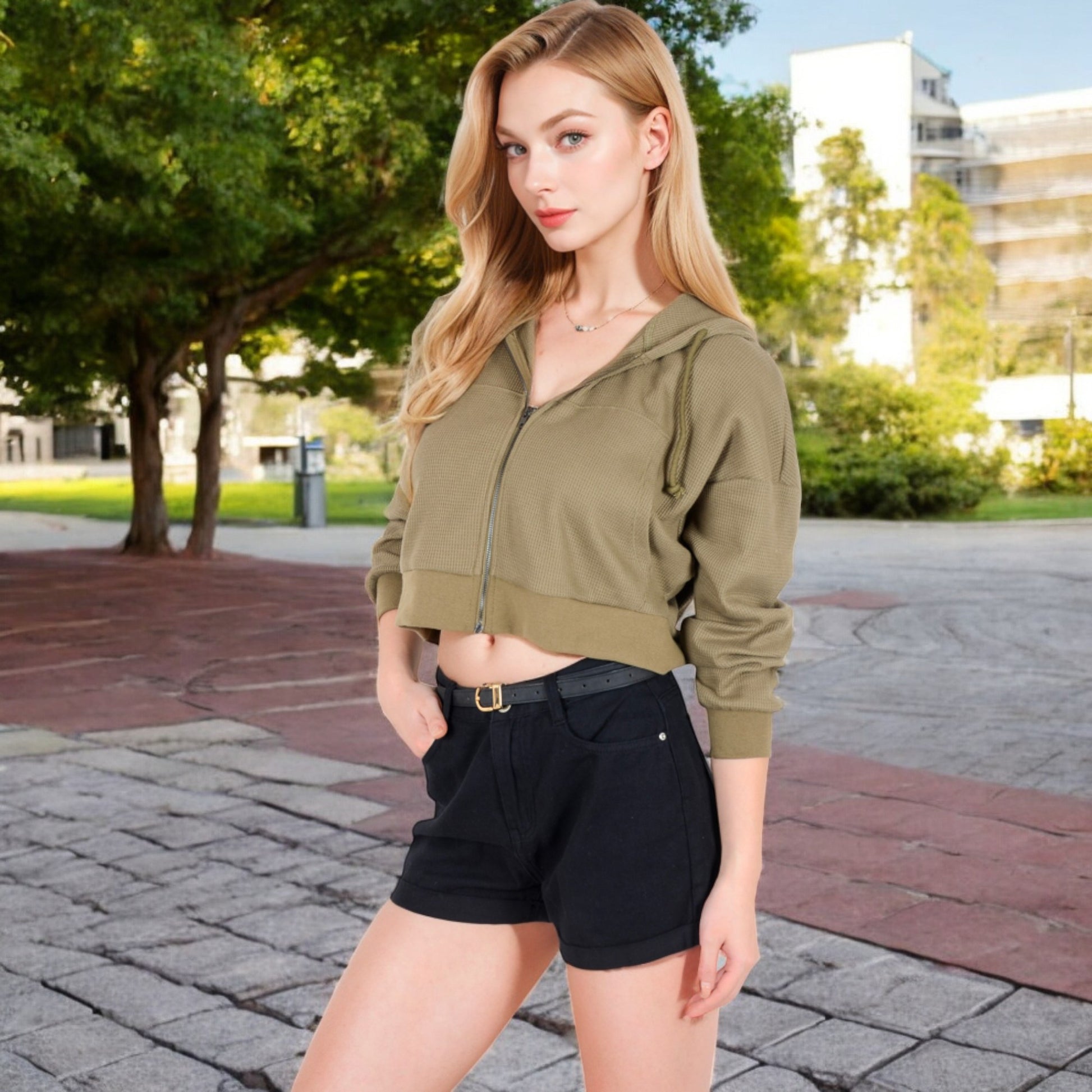 The Anna-Kaci Women's cropped waffle knit zip-up hoodie combines casual comfort with a stylish edge. Designed with a relaxed cropped silhouette, this hoodie features a soft waffle knit texture for added dimension. The zip-up front and adjustable drawstring hood add practicality, while the long sleeves offer lightweight coverage. Perfect for pairing with high-waisted jeans, leggings, or activewear for an effortlessly chic look.