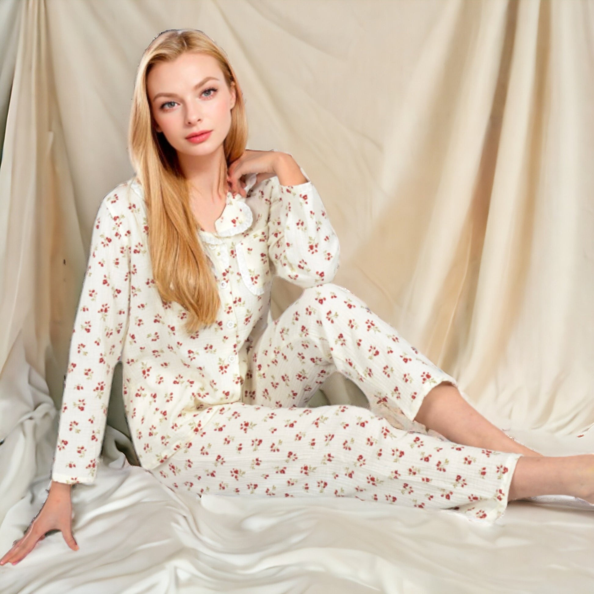 Relax in style with the Anna-Kaci Women's Floral Print Pajama Set. This charming set features a delicate floral pattern, a button-up long sleeve top with ruffle details, and matching pants for a cohesive look. Crafted from lightweight, breathable fabric, it ensures maximum comfort for restful nights or lounging at home. Perfect for adding a touch of elegance to your nighttime wardrobe.