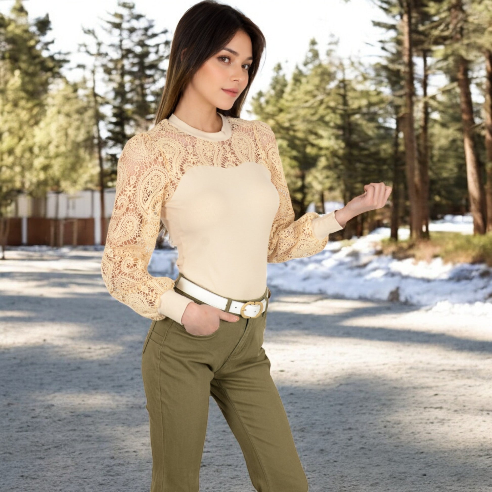 Anna-Kaci Women's Long Sleeve Lace Detail Top offers a perfect blend of elegance and comfort. Featuring intricately designed lace sleeves and a soft stretch knit bodice, this top is both stylish and functional. The lightweight fabric provides a flattering fit, making it ideal for layering or wearing on its own. Pair it with tailored pants or skirts for an effortlessly chic outfit suitable for day or evening wear.