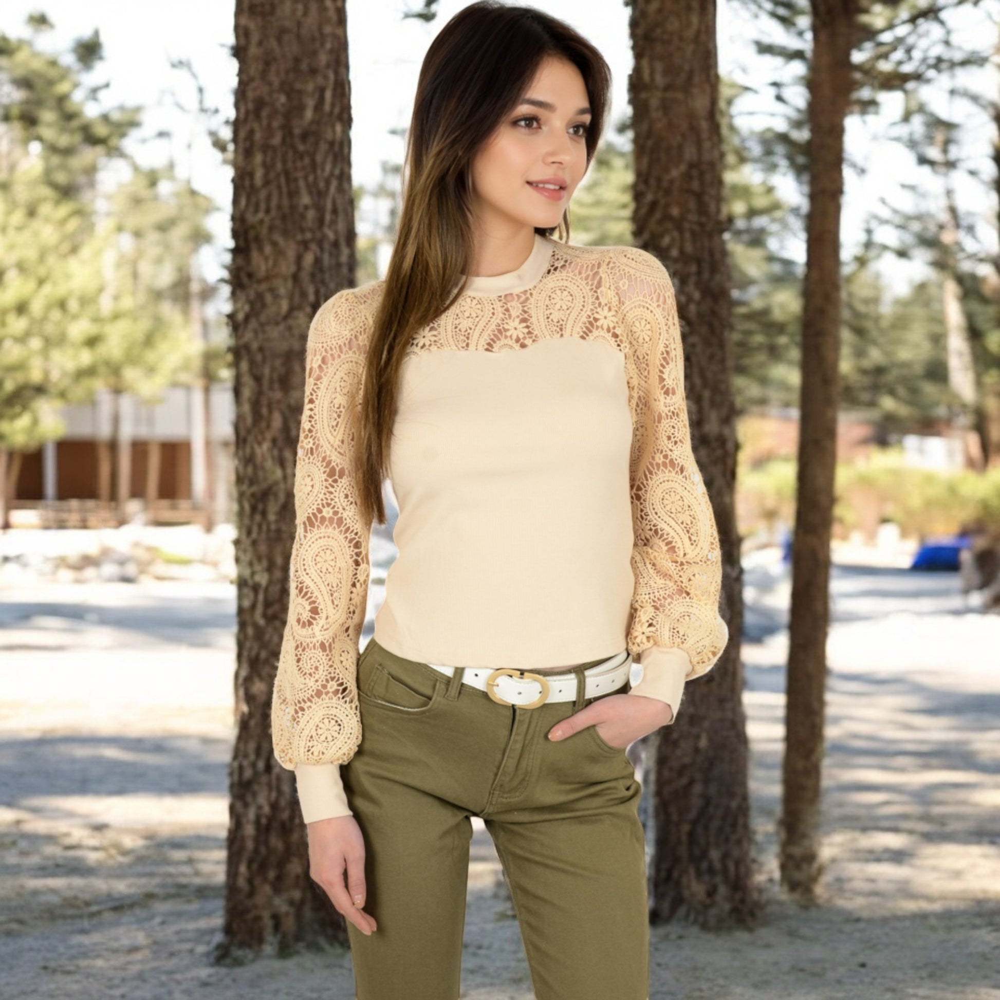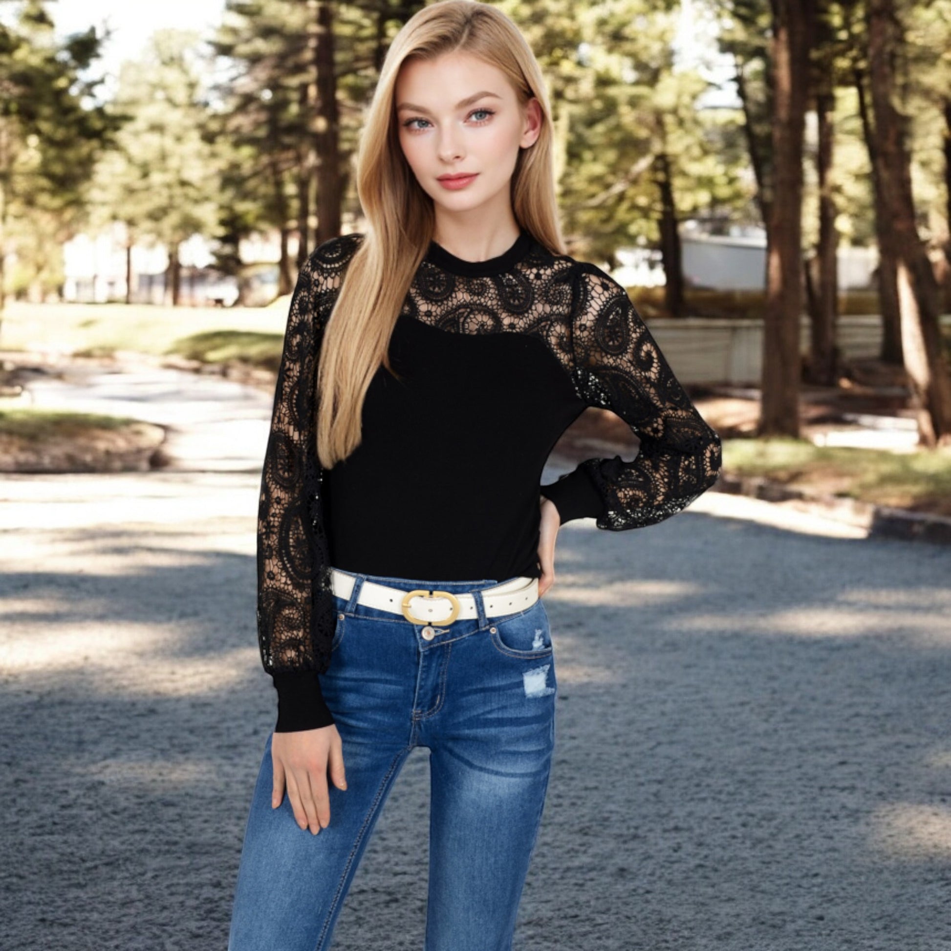 Anna-Kaci Women's Long Sleeve Lace Detail Top with Stretch Knit Bodice