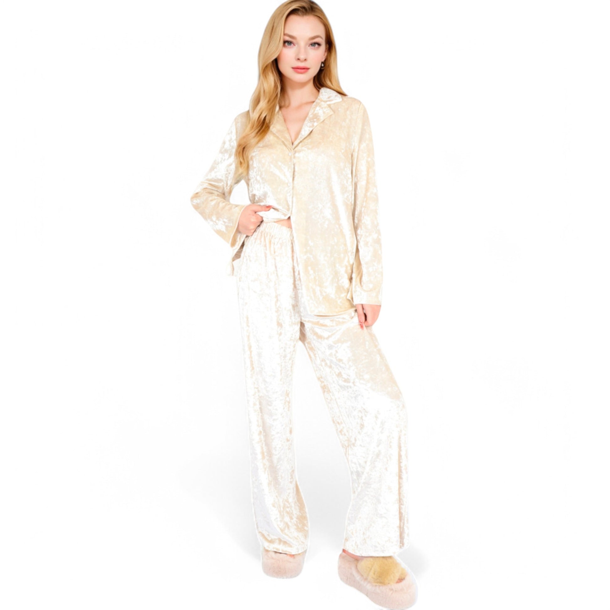 Anna-Kaci Women's crushed velvet lounge set exudes elegance and luxury with its soft, textured fabric and timeless design. The set includes a button-up long sleeve top with a notched collar and relaxed wide-leg pants for ultimate comfort. Crafted from lightweight, smooth velvet, its perfect for lounging in style or making a statement at home. Elevate your loungewear with this sophisticated and versatile set.