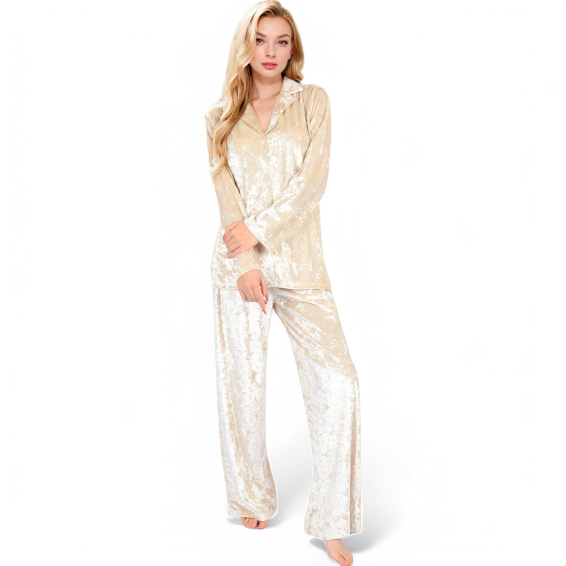 Anna-Kaci Women's Crushed Velvet Lounge Set with Button-Up Long Sleeve Top and Wide-Leg Pants