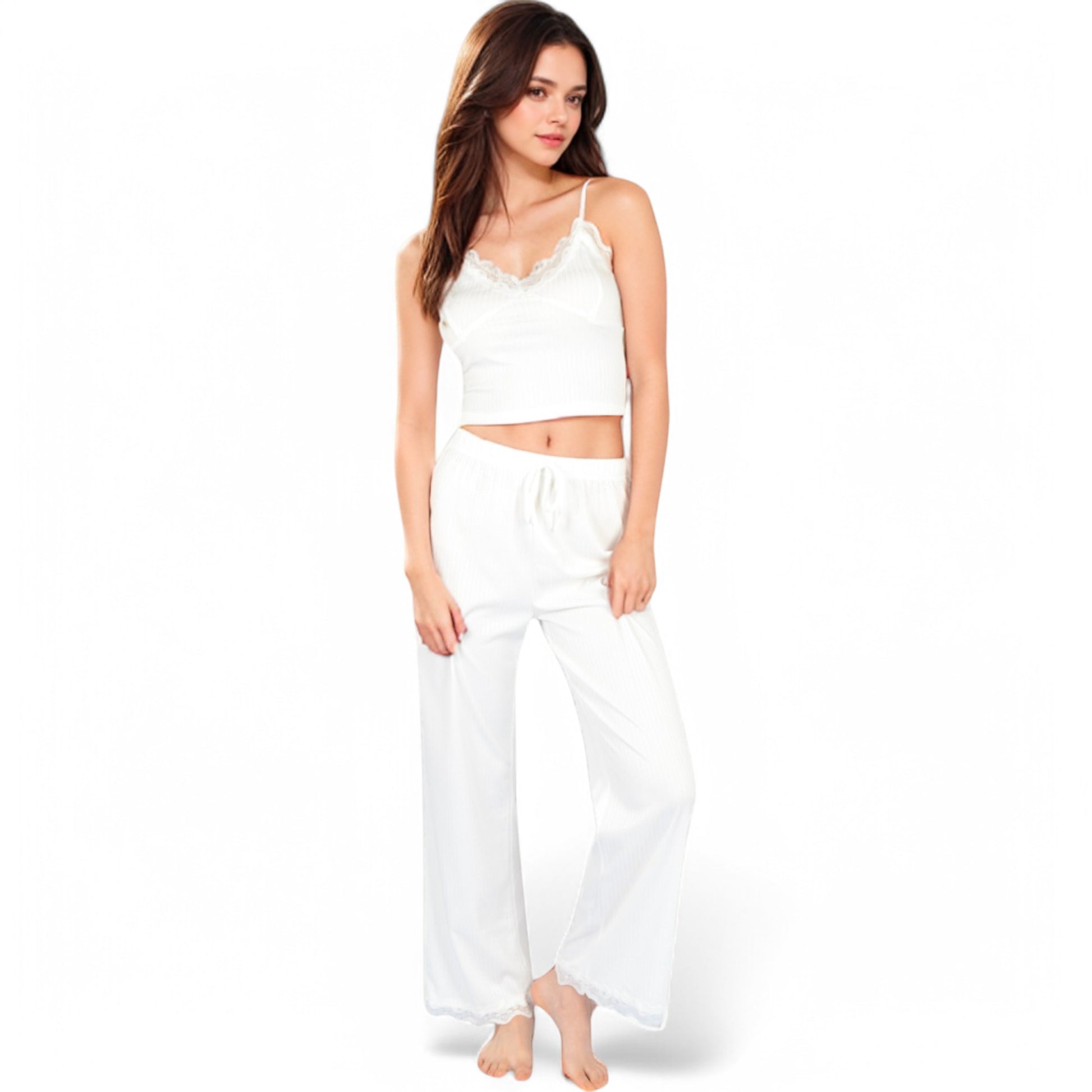 Anna-Kaci Women's Lace Trim Ribbed Knit Pajama Set with Adjustable Drawstring