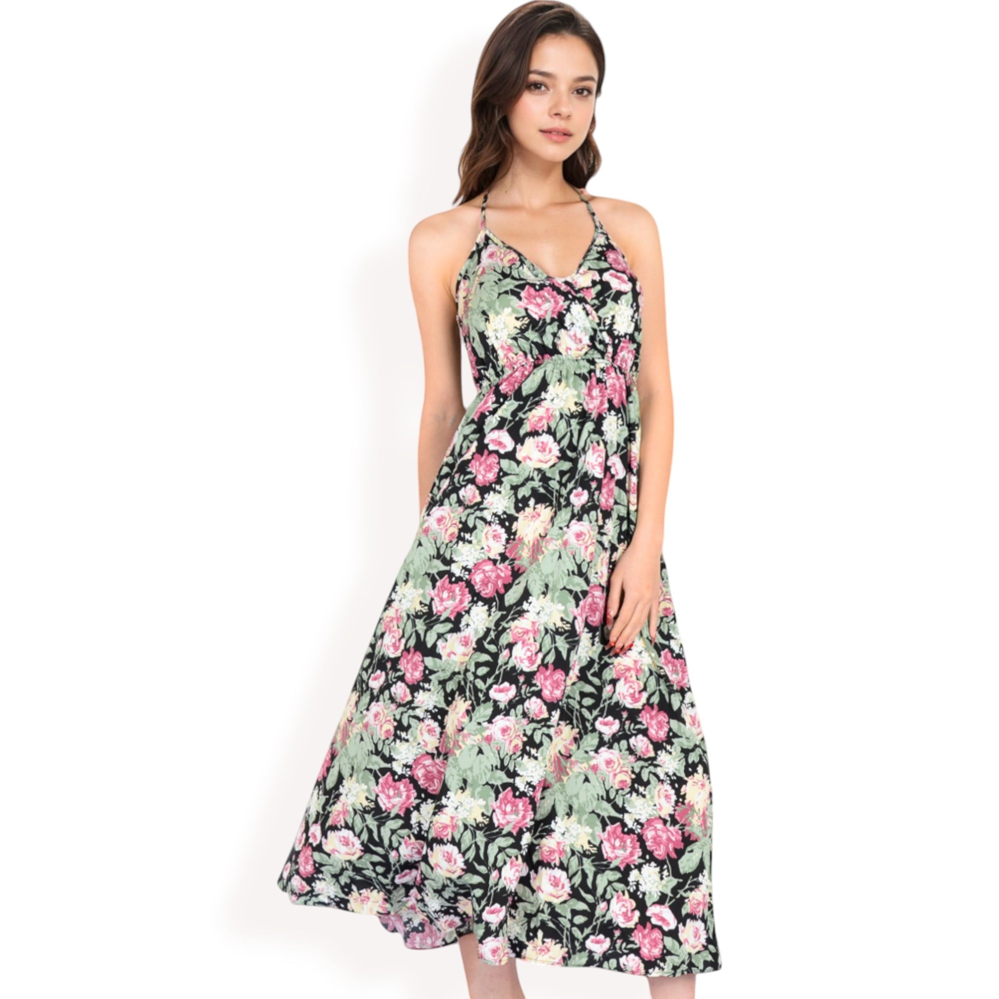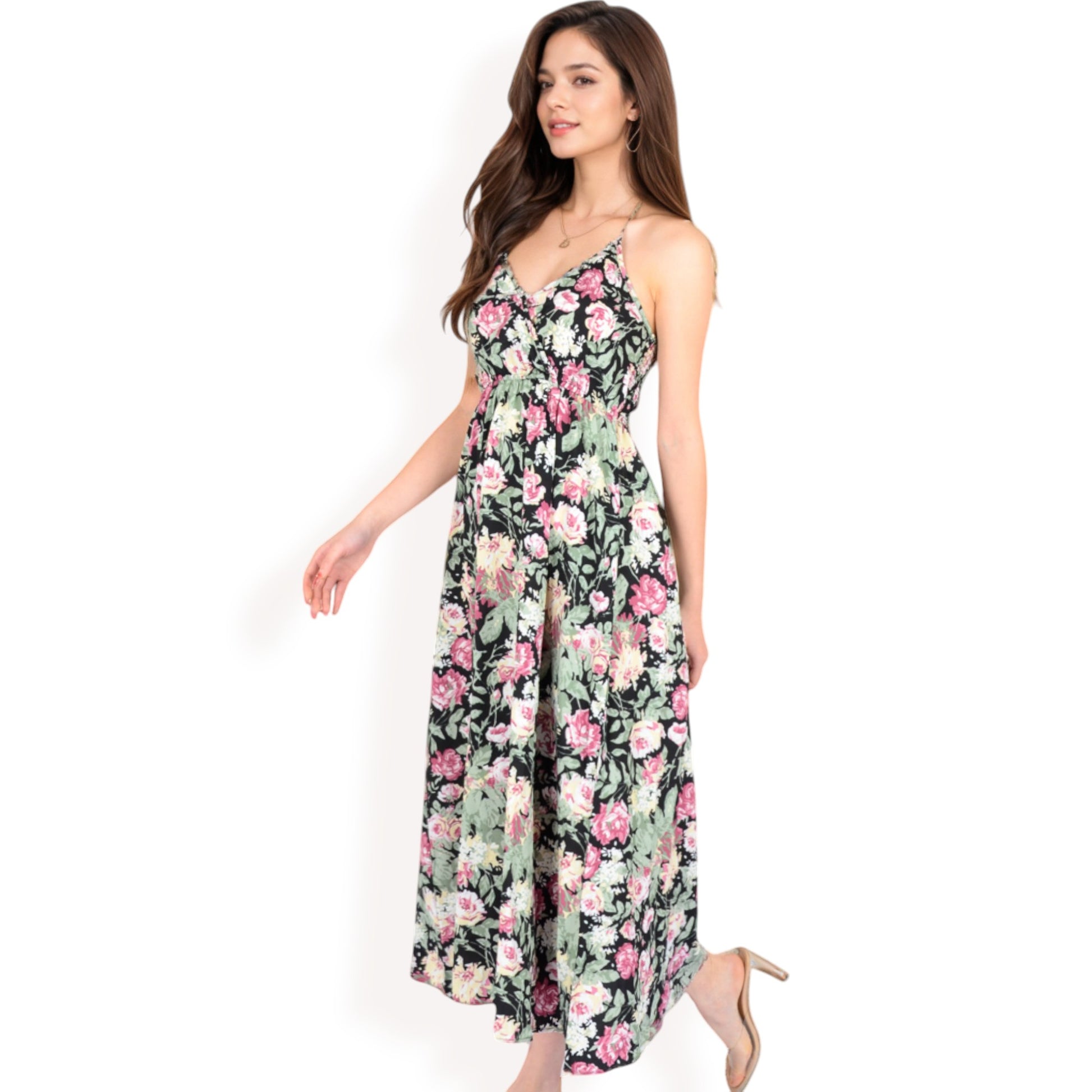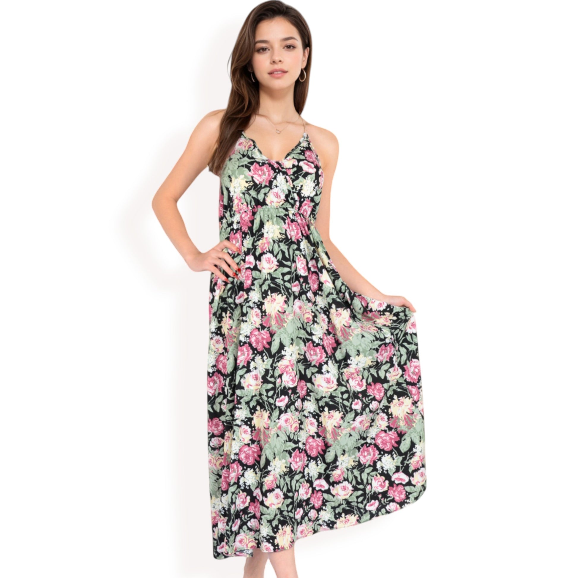 The Anna-Kaci Women's Floral Print Maxi Dress brings elegance and comfort together with its lightweight and flowy design. This sleeveless maxi dress features a flattering wrap-front neckline and adjustable spaghetti straps for a customizable fit. The vibrant floral print adds a feminine touch, while the elasticized waist ensures both comfort and a defined silhouette. Perfect for sunny days or evening events, this versatile maxi dress is a must-have.