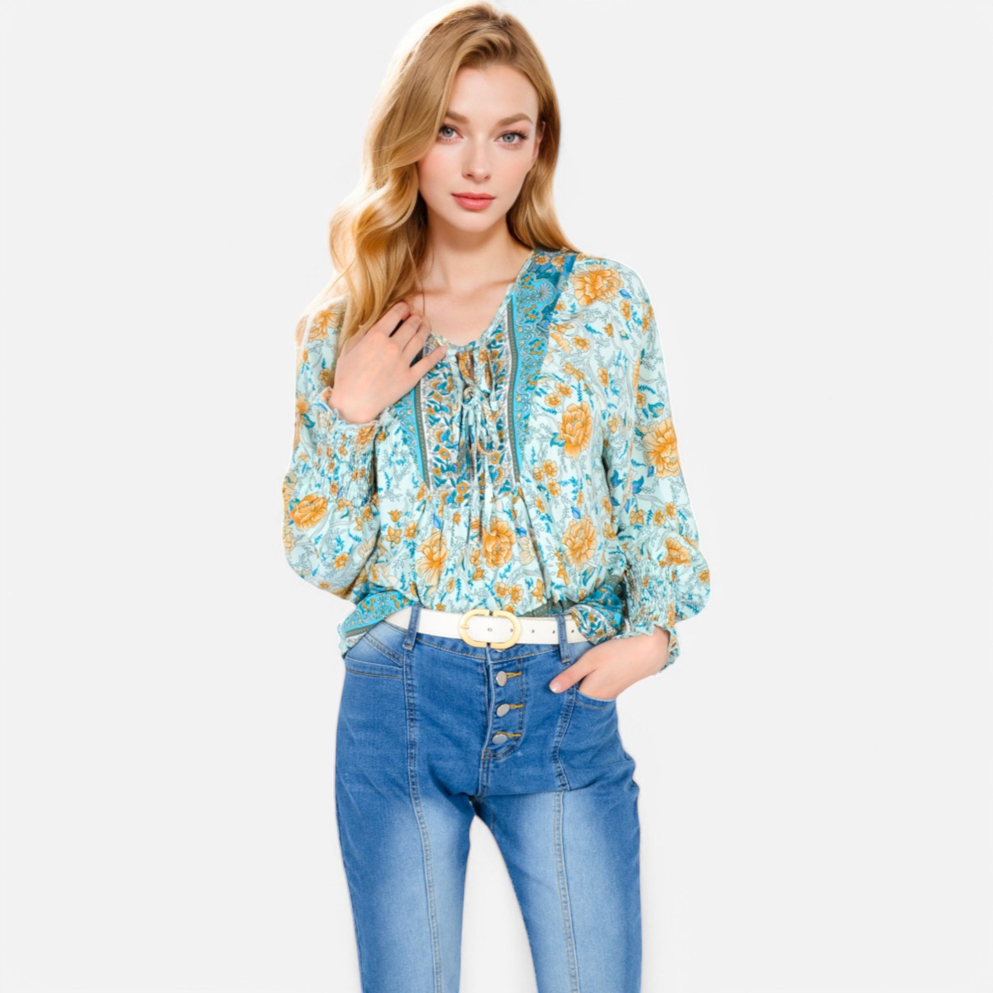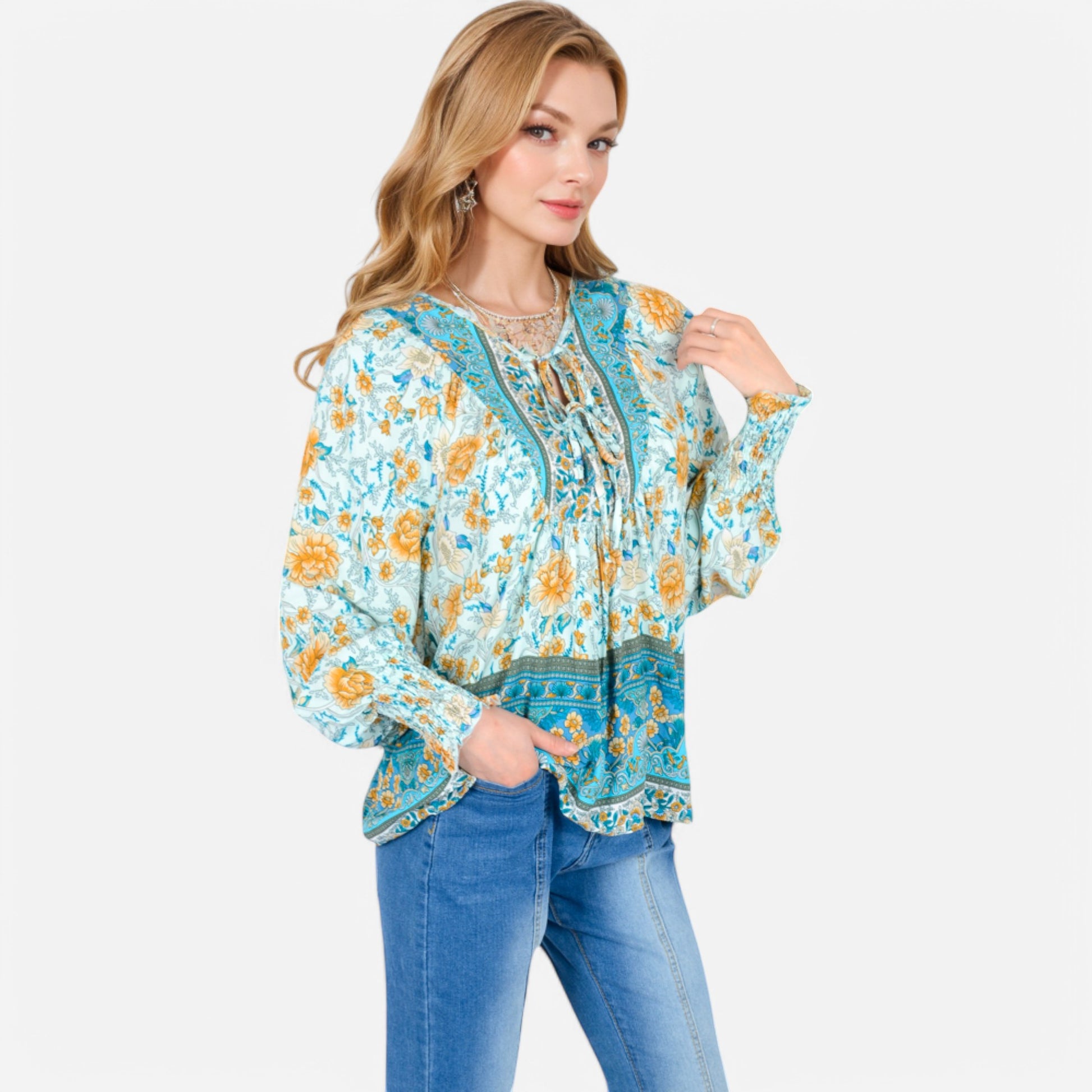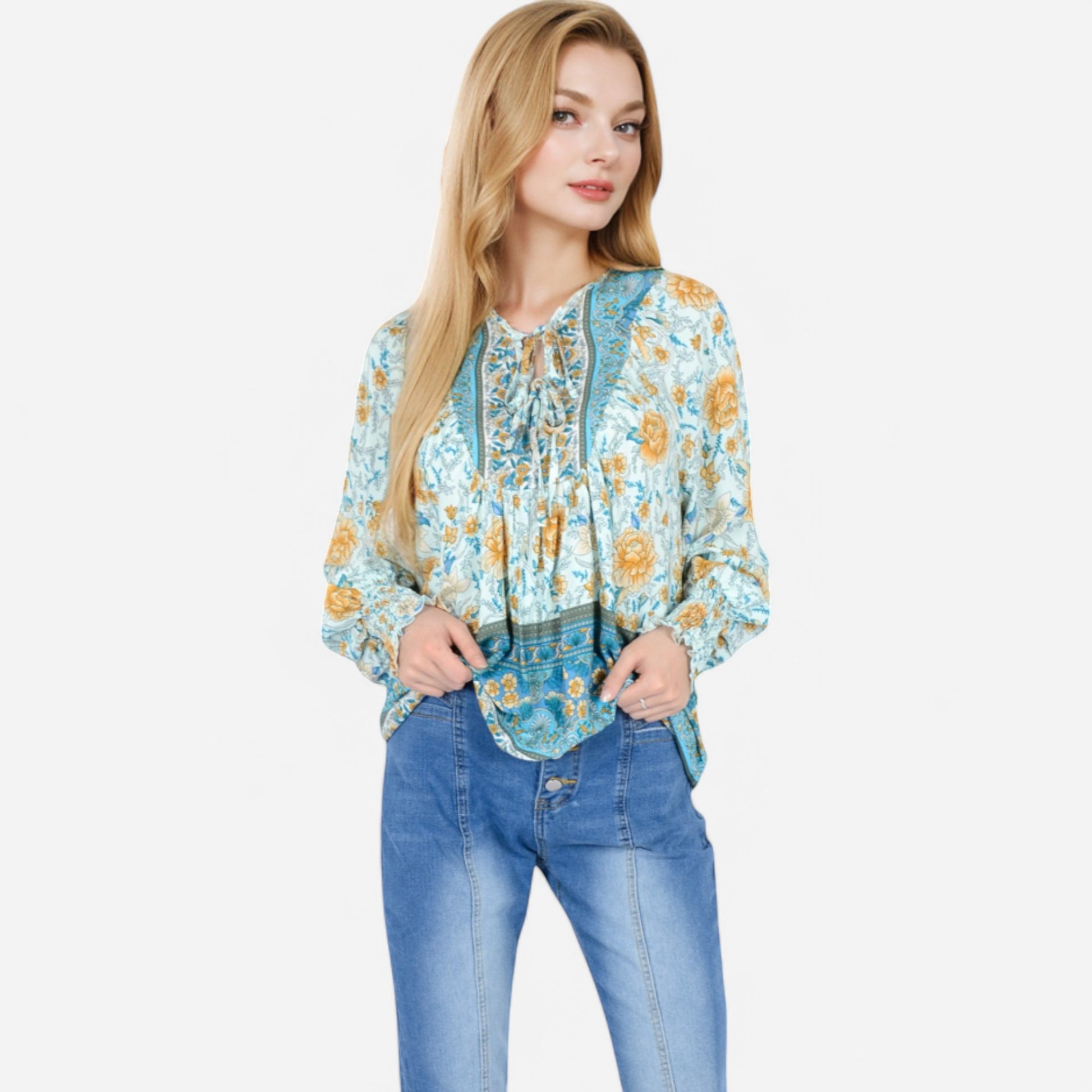 The Anna-Kaci Women's Floral Boho Peasant Blouse showcases a whimsical floral print with intricate border detailing, embracing a free-spirited bohemian vibe. It features flowy long sleeves and a playful tassel tie at the neckline for a touch of vintage charm. Crafted from lightweight, breathable fabric, this blouse provides a relaxed, comfortable fit. Perfect for pairing with denim shorts or layered with accessories, it effortlessly adds a boho-chic flair to any outfit.