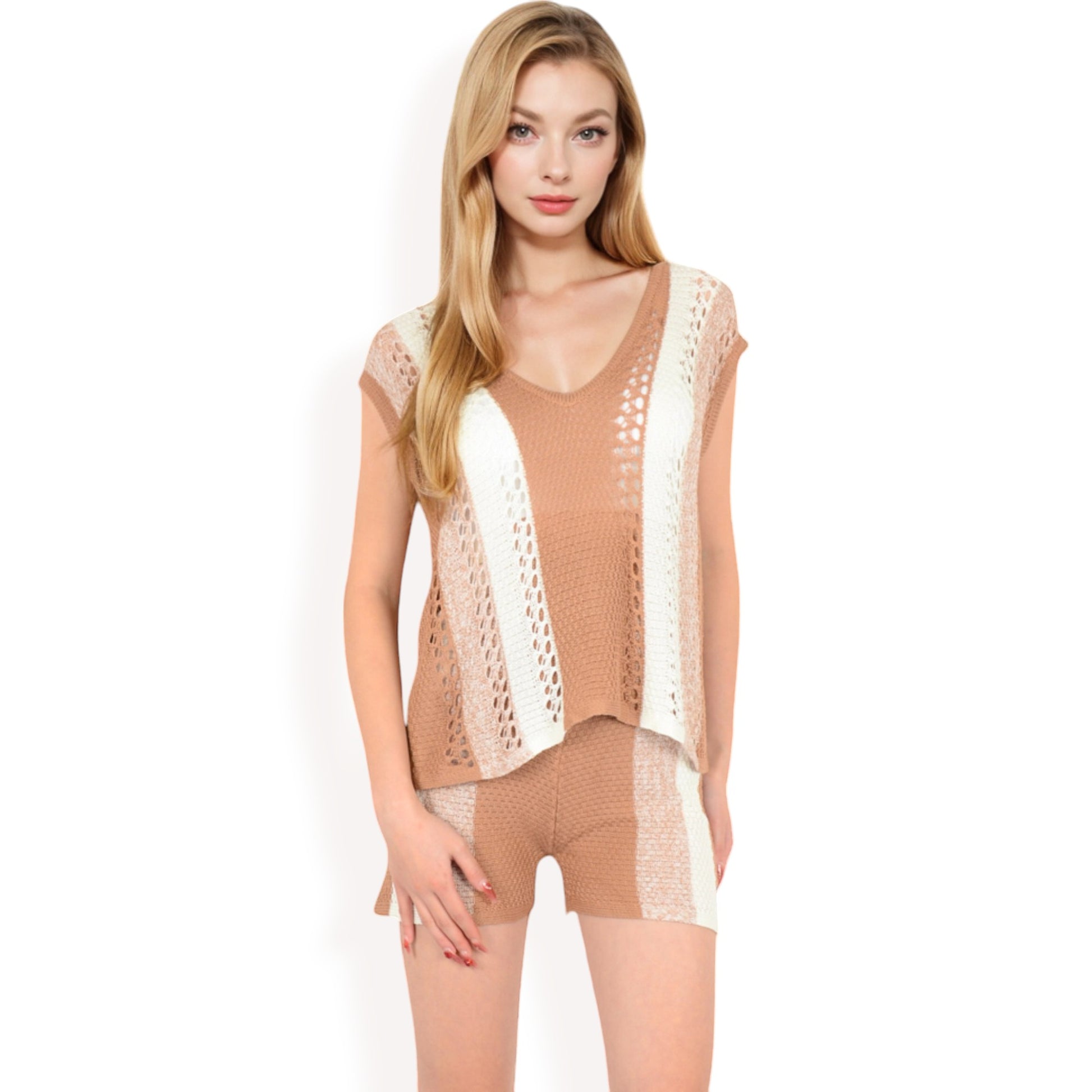 Anna-Kaci Women's Crochet Knit Two-Piece Set with Striped Top and Shorts