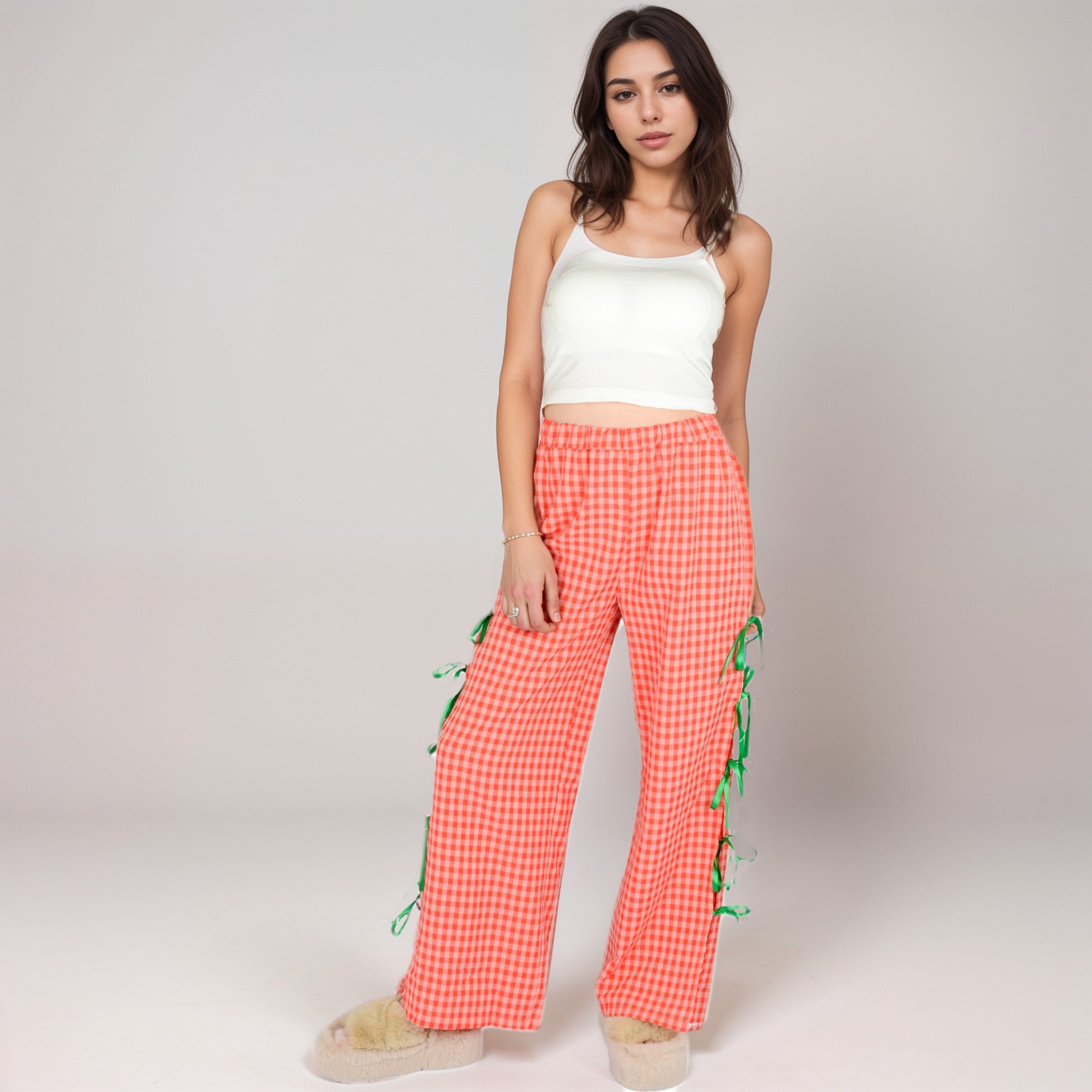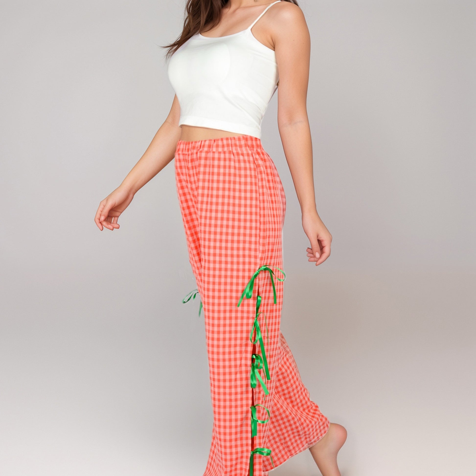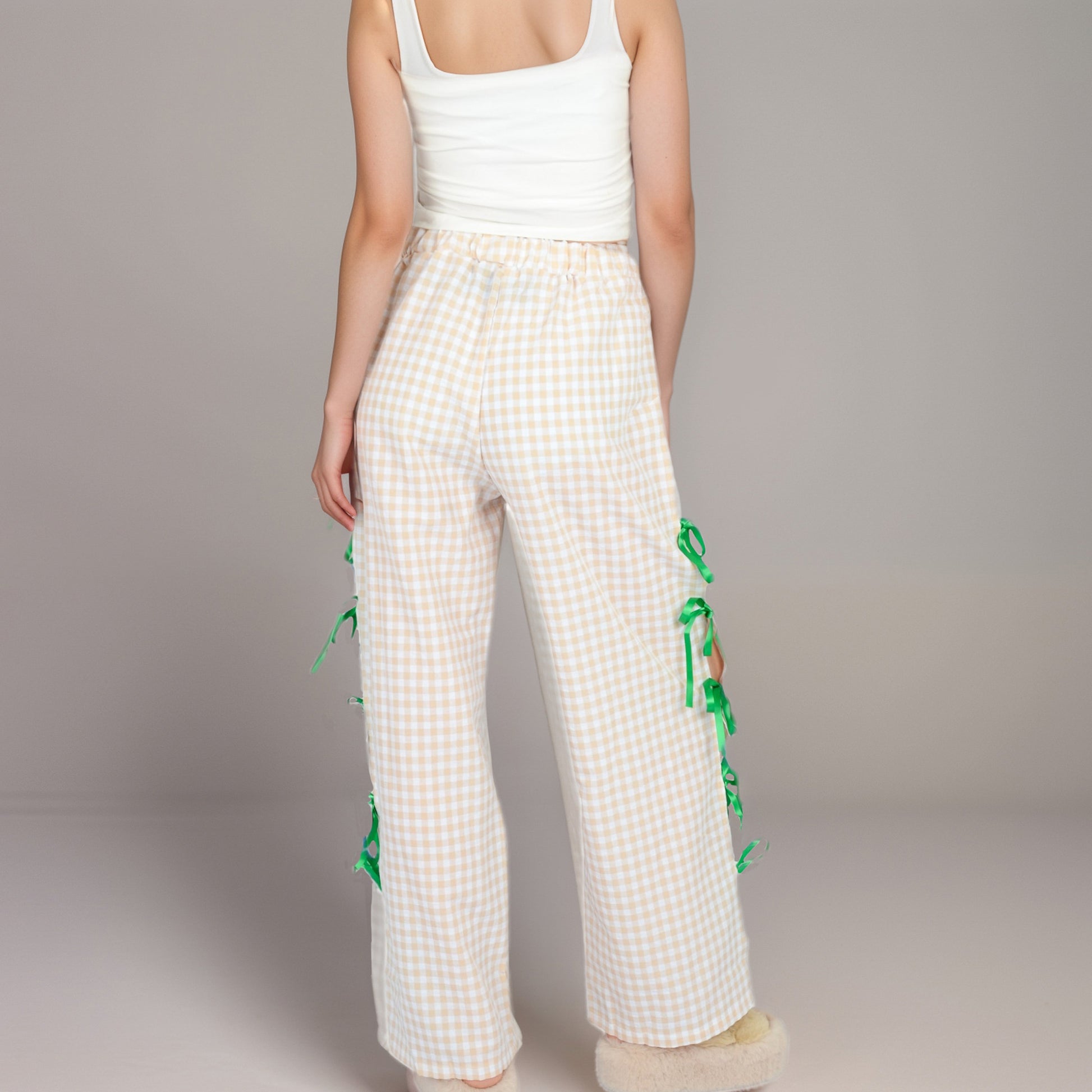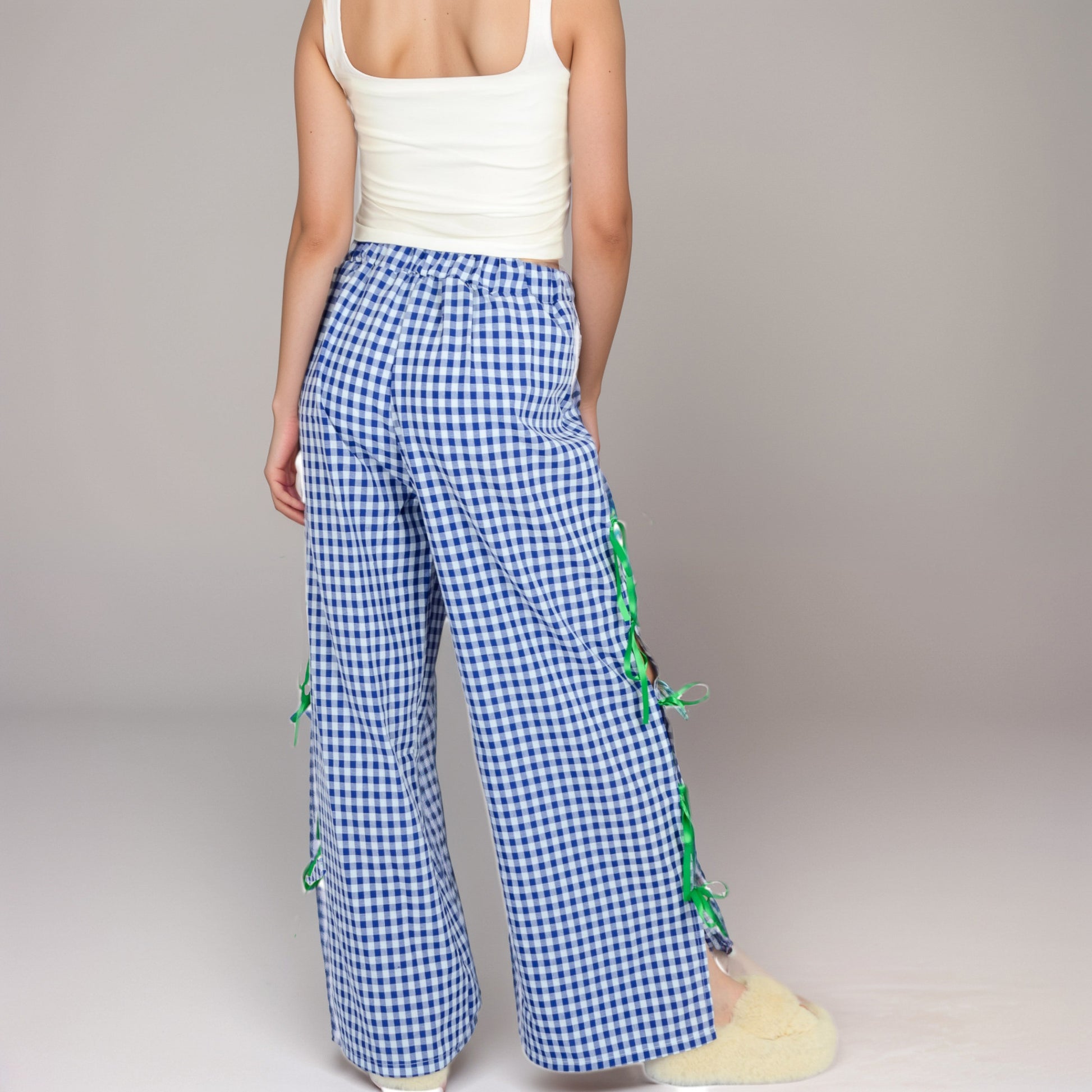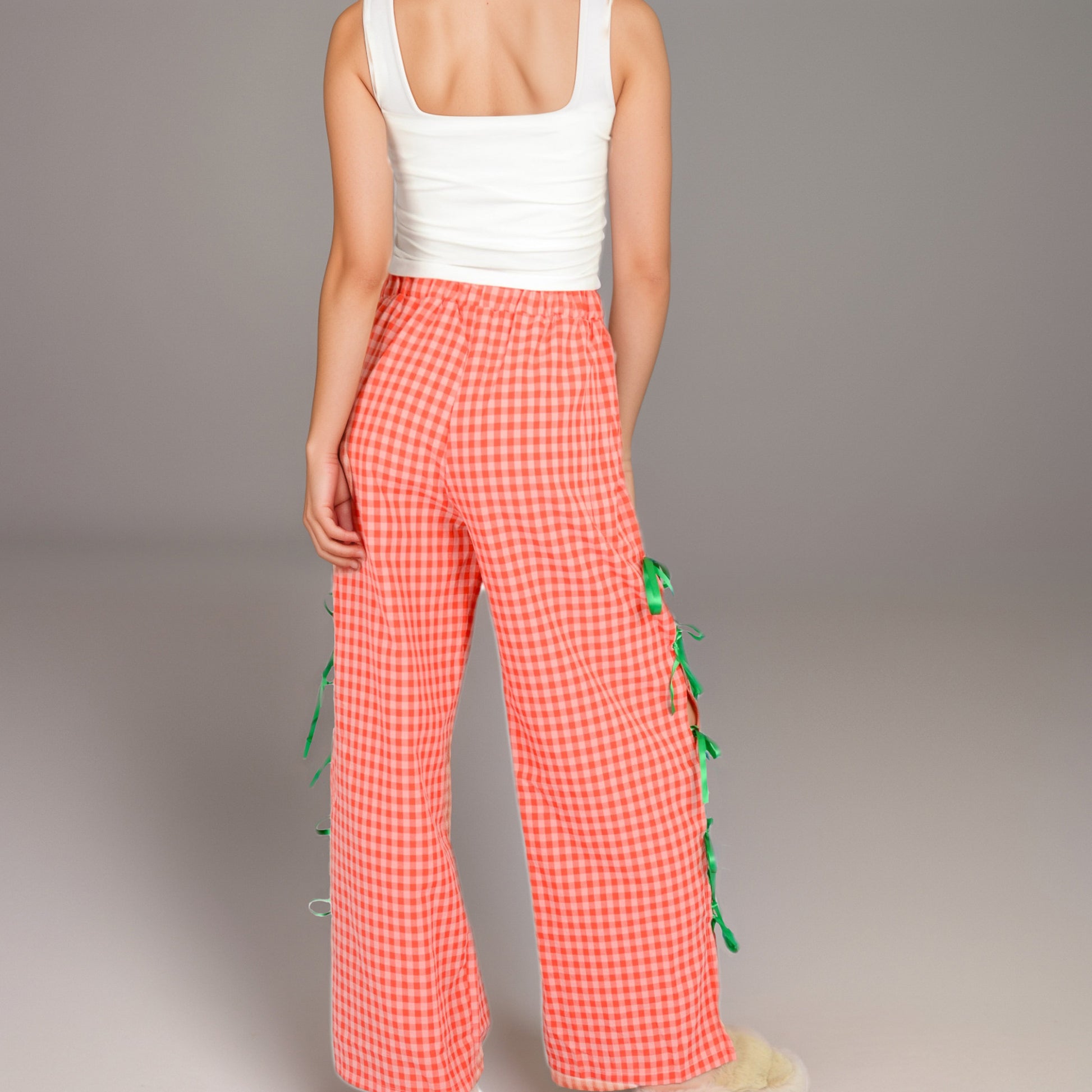 These Anna-Kaci Women's Gingham Wide Leg Pants feature a vibrant gingham pattern and standout ribbon tie accents along the side seams. Made from soft woven fabric, they offer a breathable feel with a relaxed, full-length fit. The elastic waistband adds flexibility and ease, while the contrast side ties bring a playful and unexpected element to this unique piece.