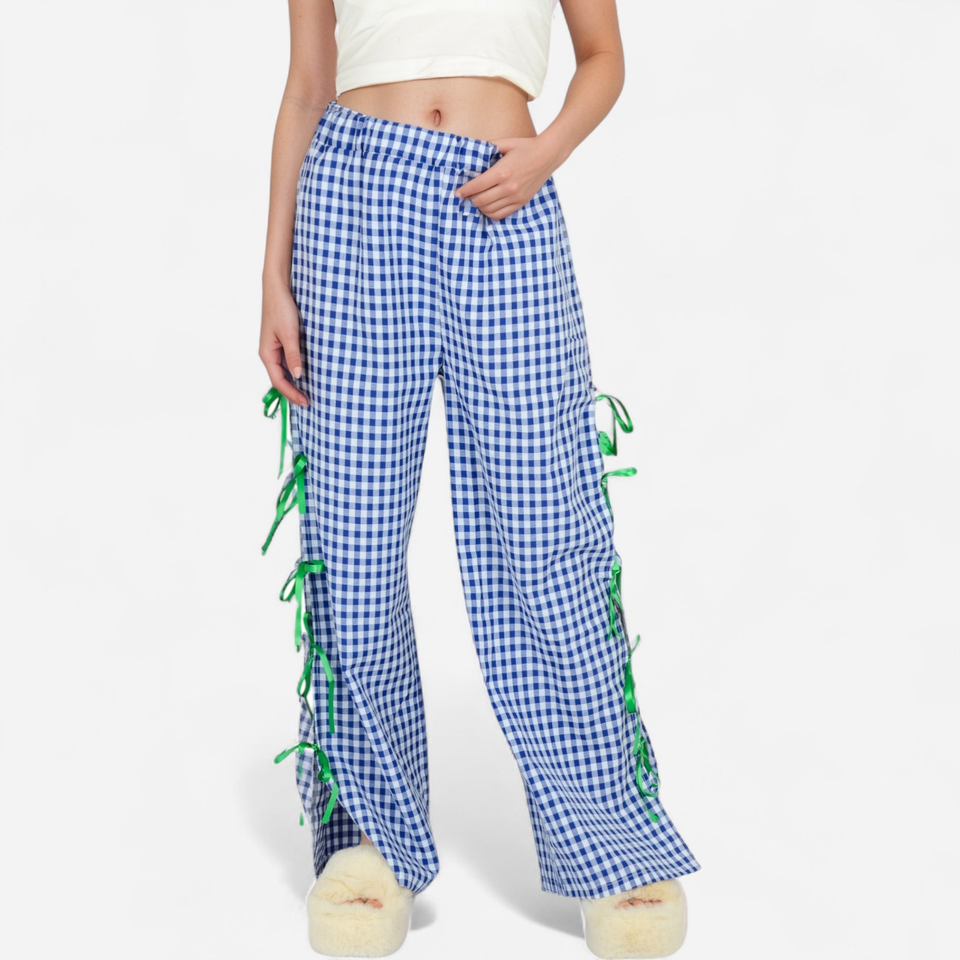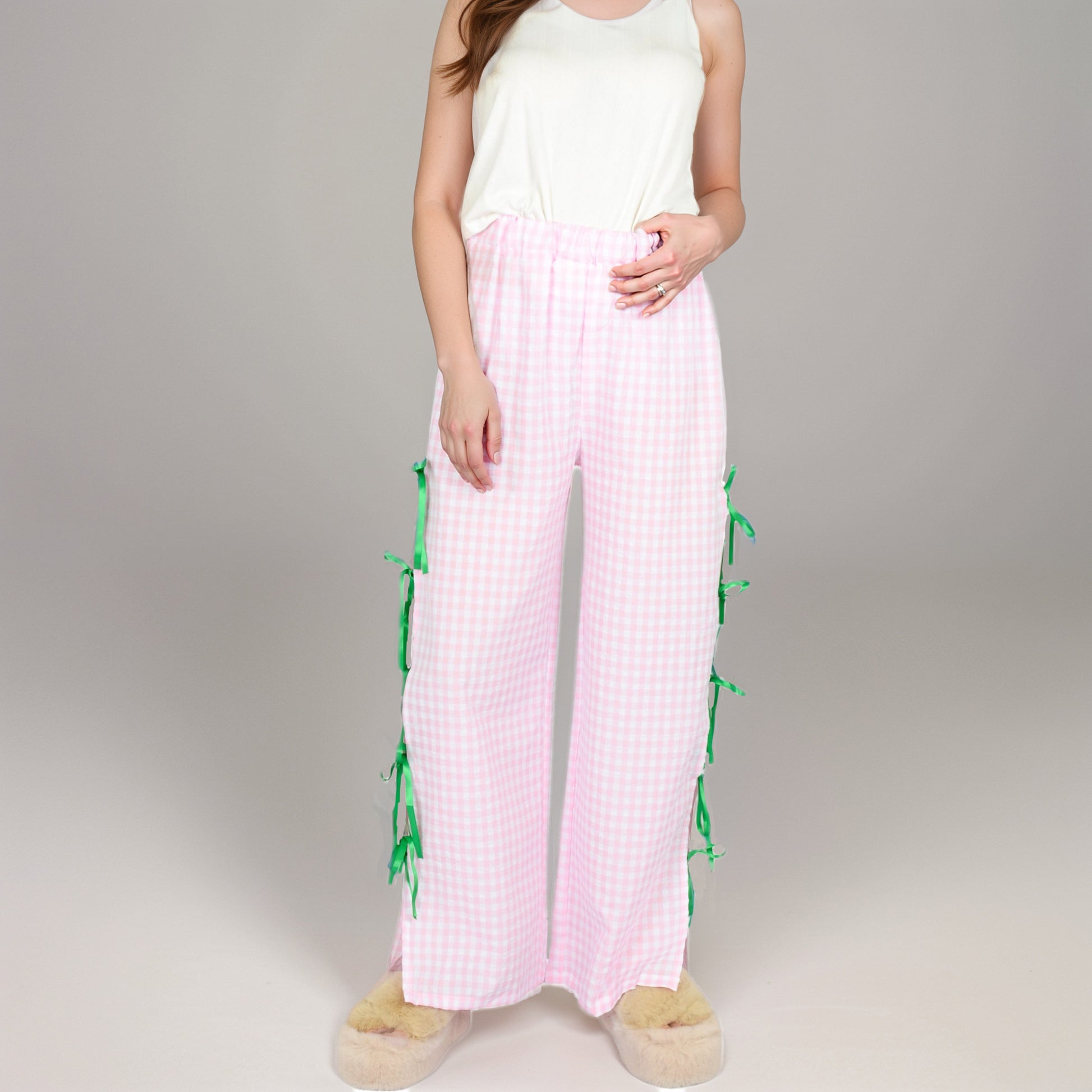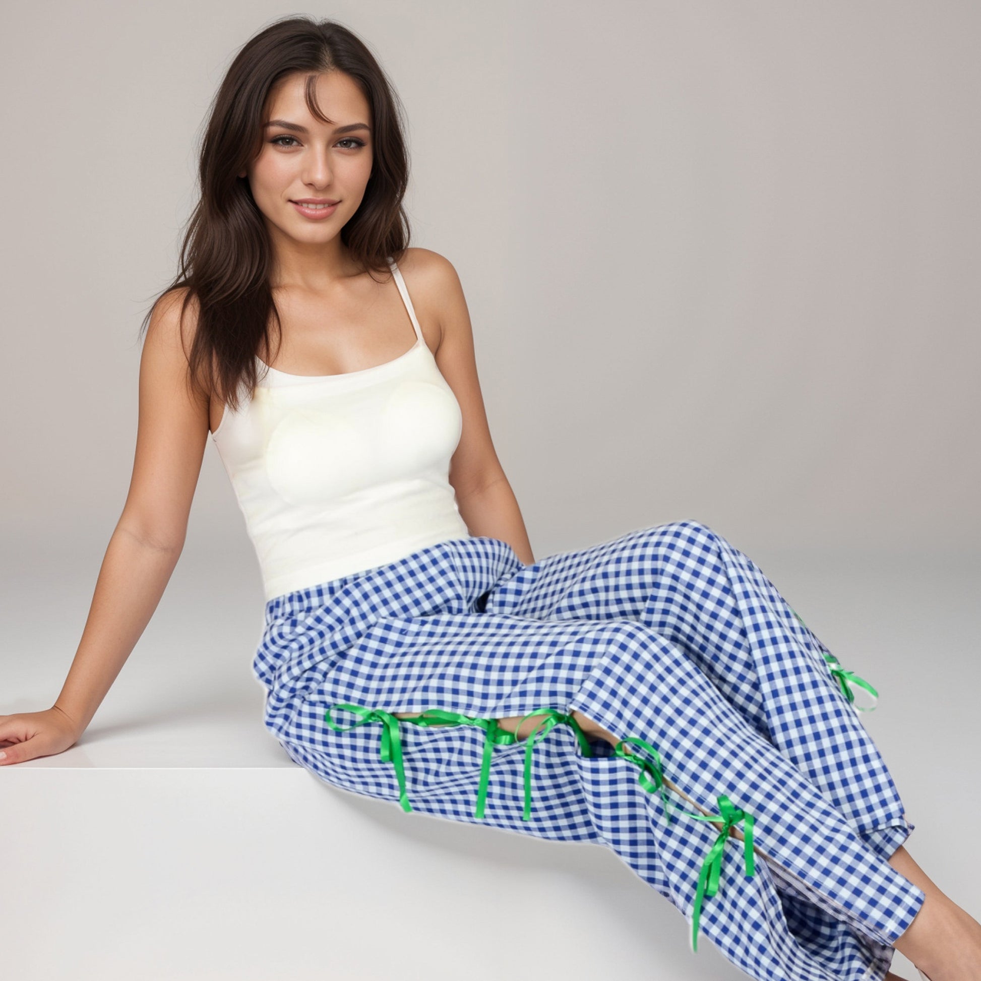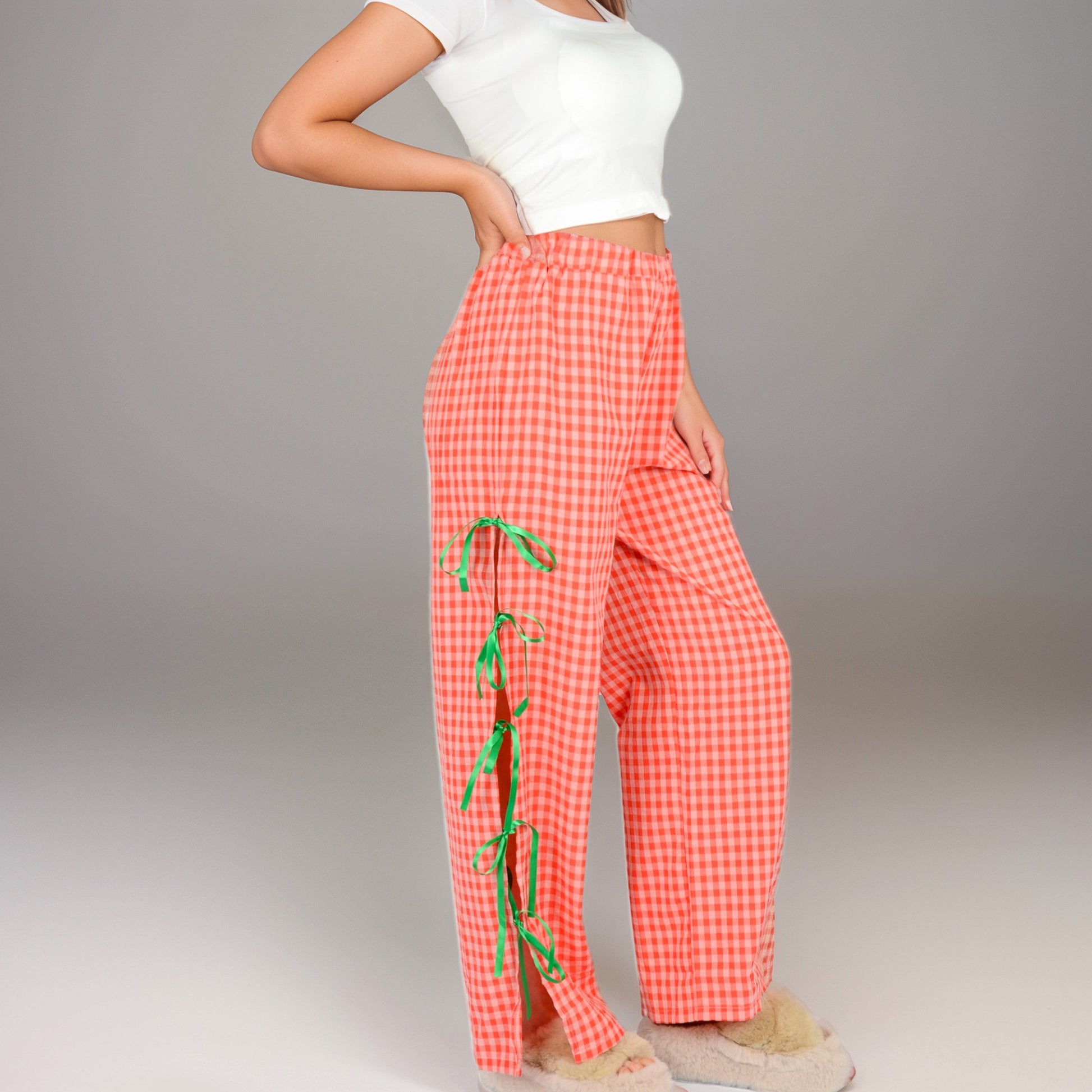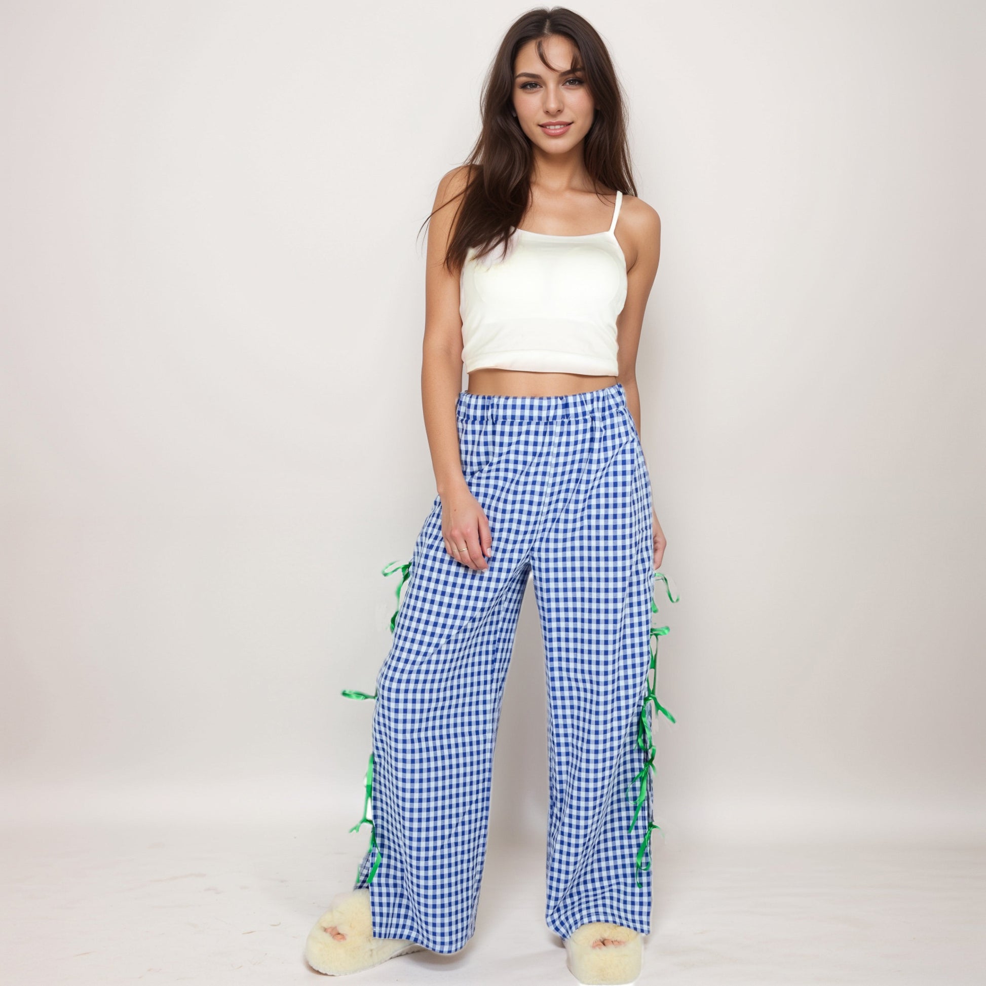 These Anna-Kaci Women's Gingham Wide Leg Pants feature a vibrant gingham pattern and standout ribbon tie accents along the side seams. Made from soft woven fabric, they offer a breathable feel with a relaxed, full-length fit. The elastic waistband adds flexibility and ease, while the contrast side ties bring a playful and unexpected element to this unique piece.