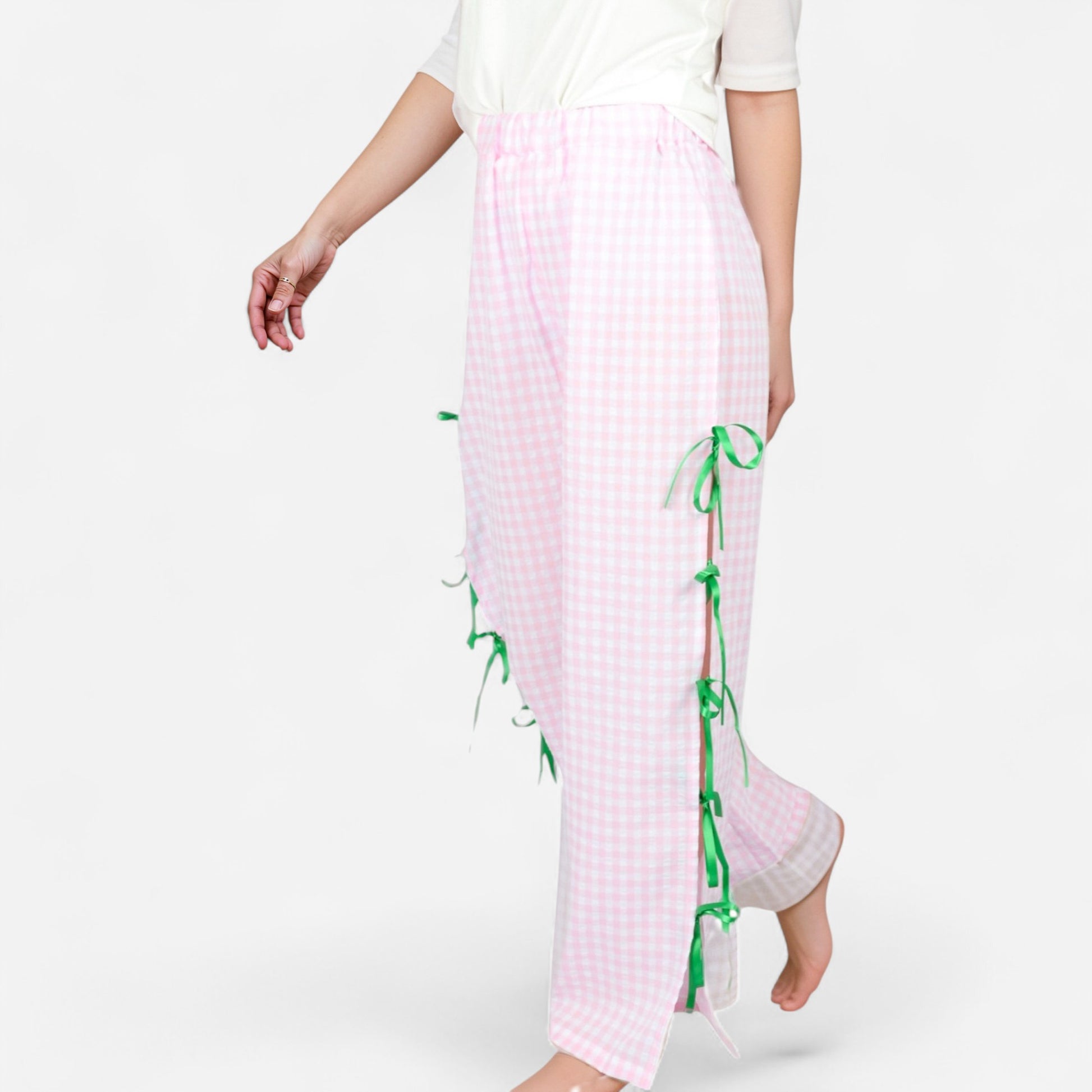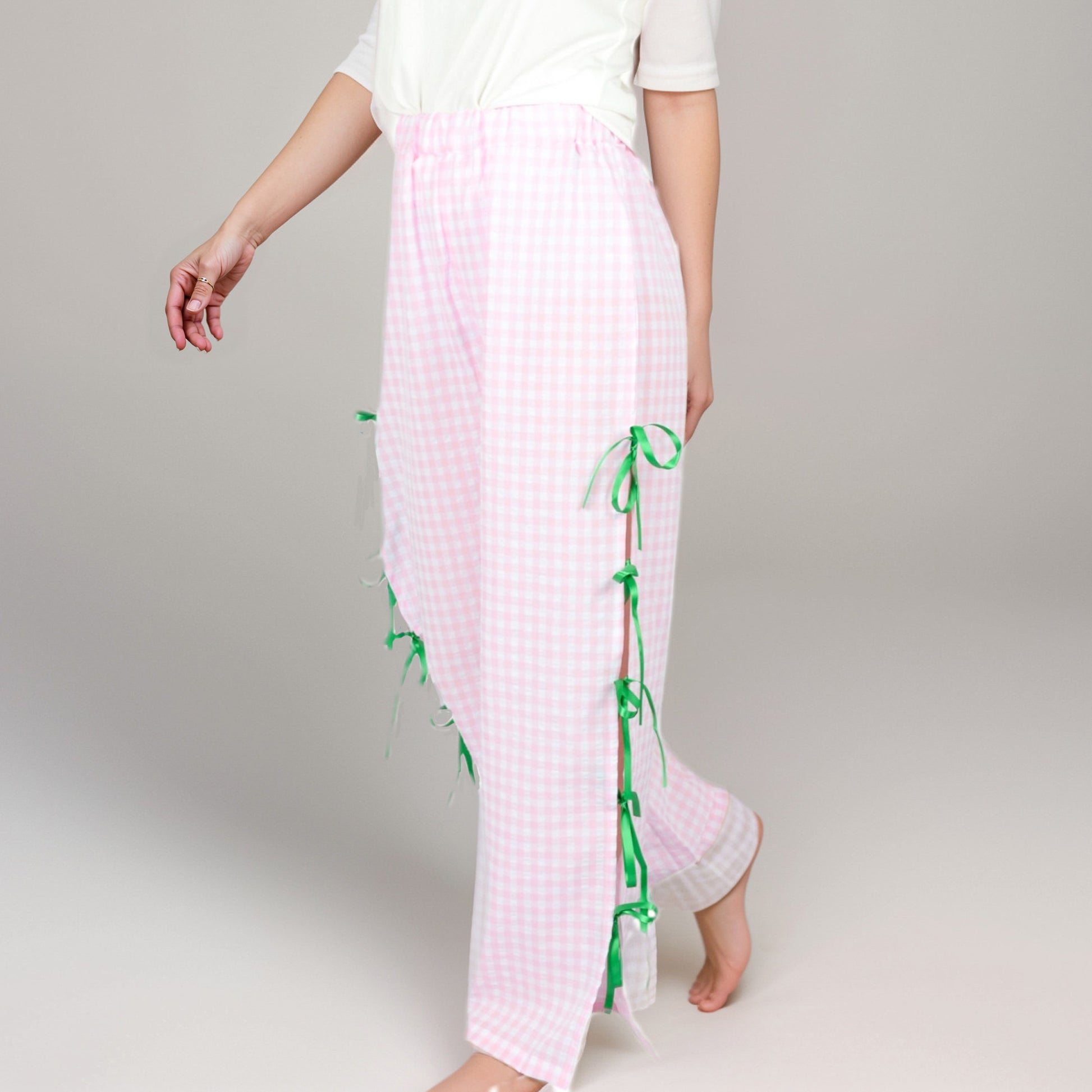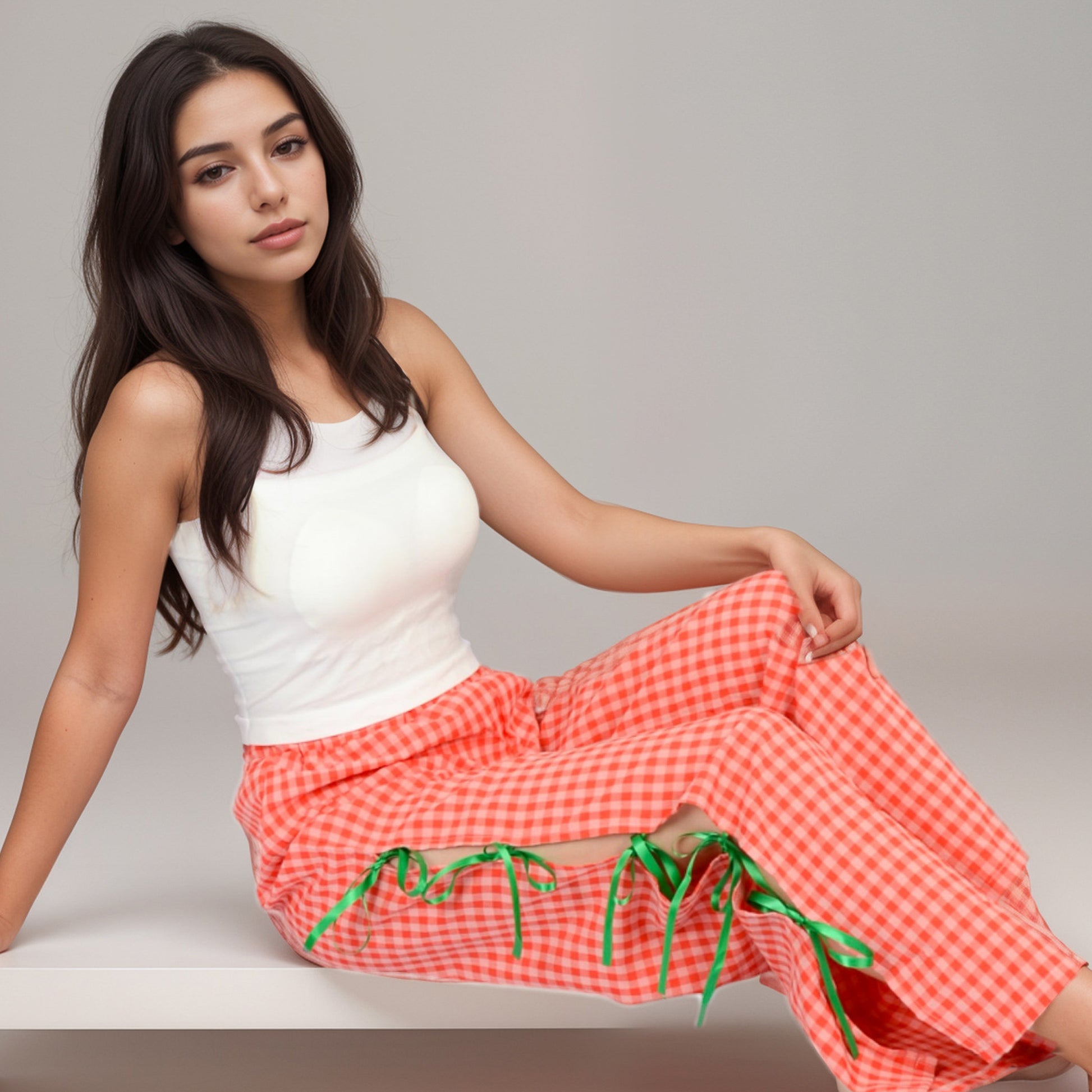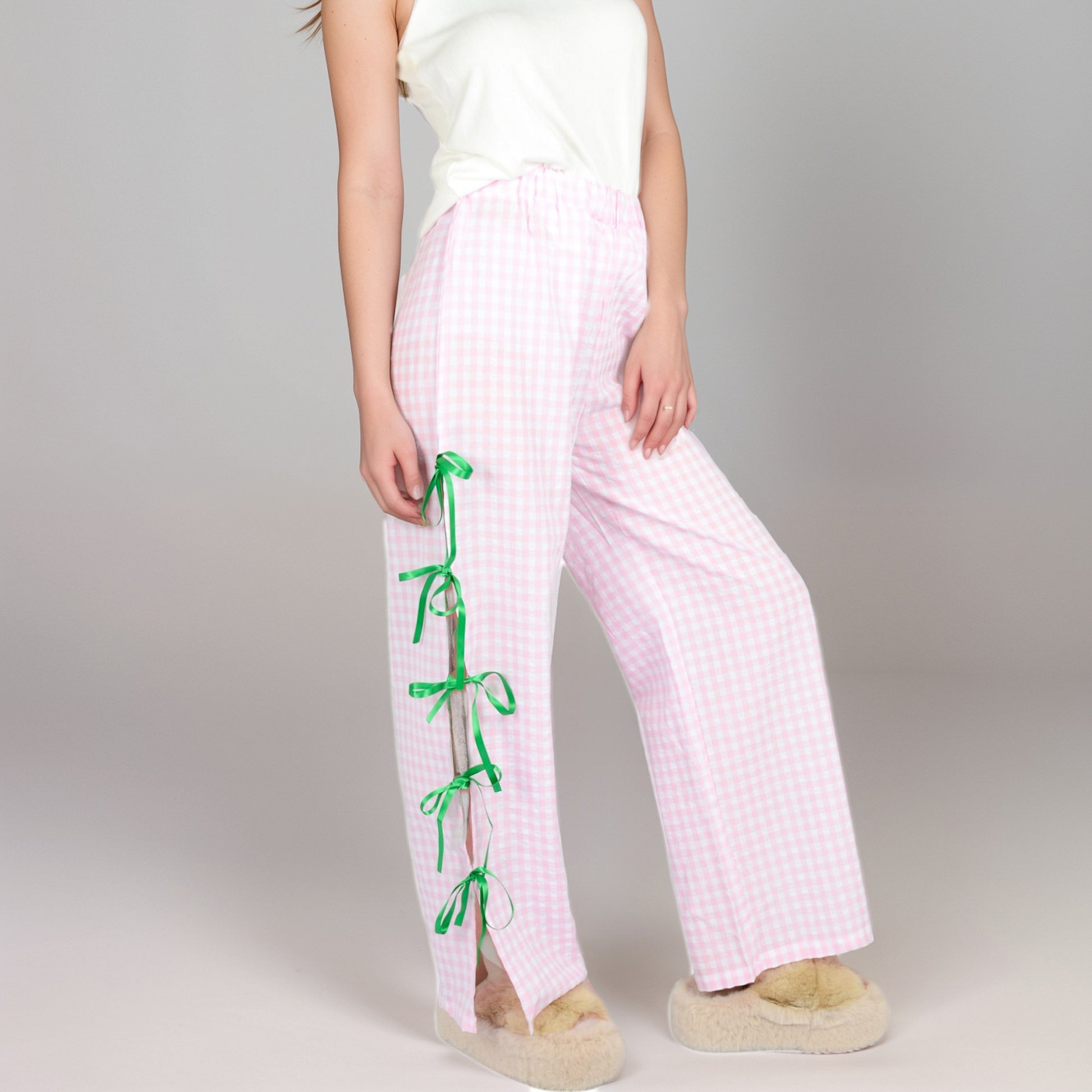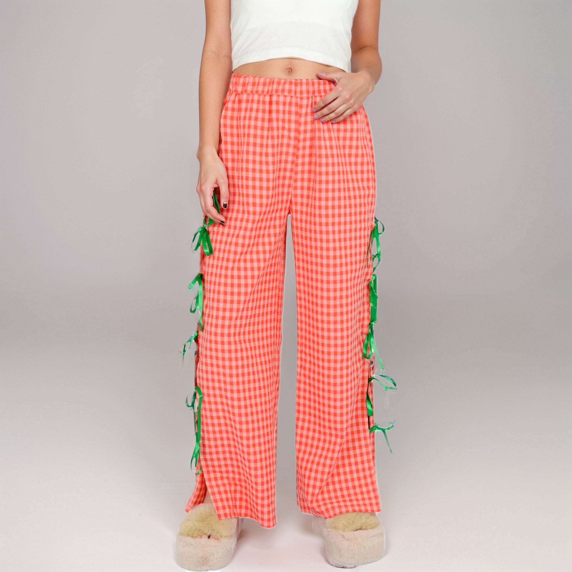 These Anna-Kaci Women's Gingham Wide Leg Pants feature a vibrant gingham pattern and standout ribbon tie accents along the side seams. Made from soft woven fabric, they offer a breathable feel with a relaxed, full-length fit. The elastic waistband adds flexibility and ease, while the contrast side ties bring a playful and unexpected element to this unique piece.
