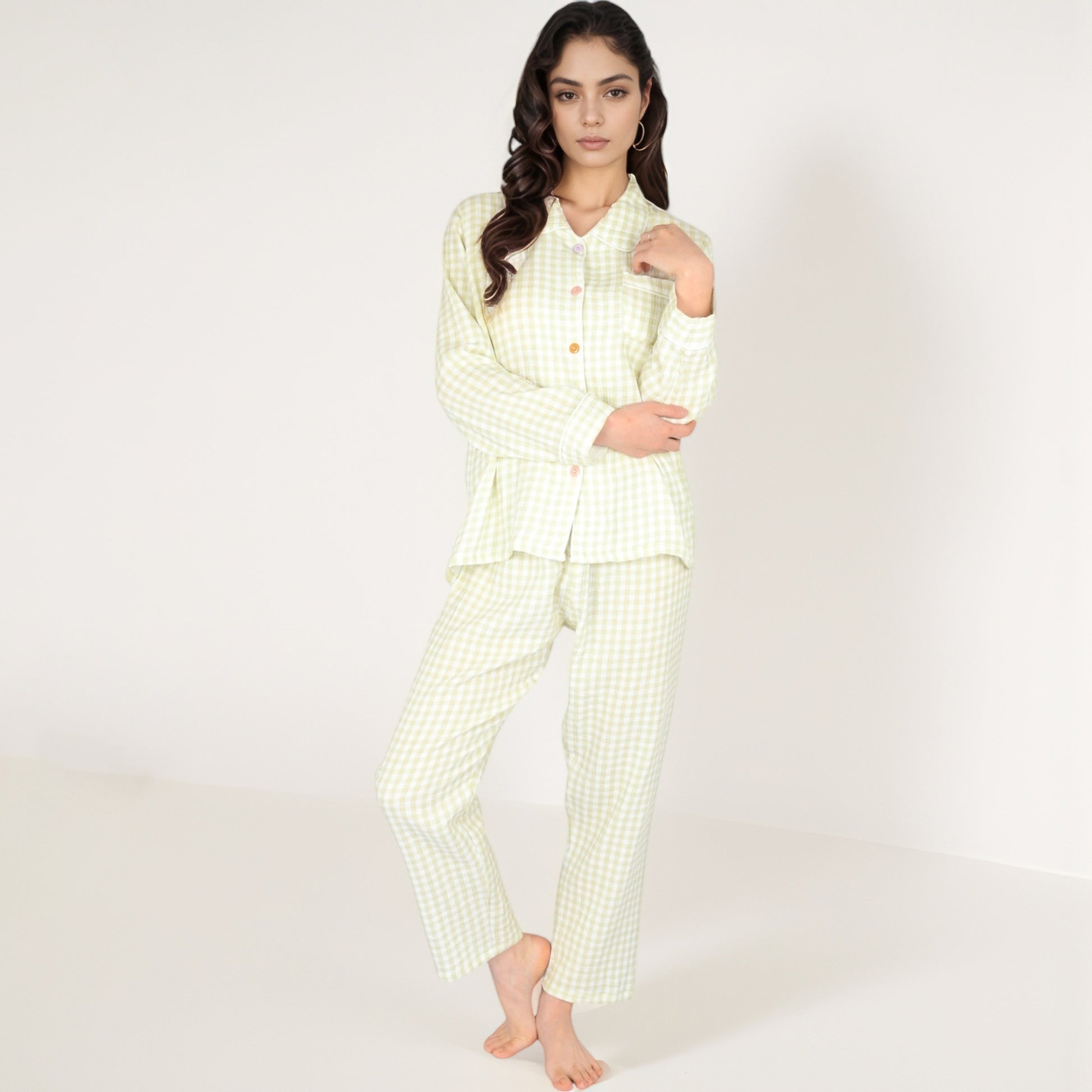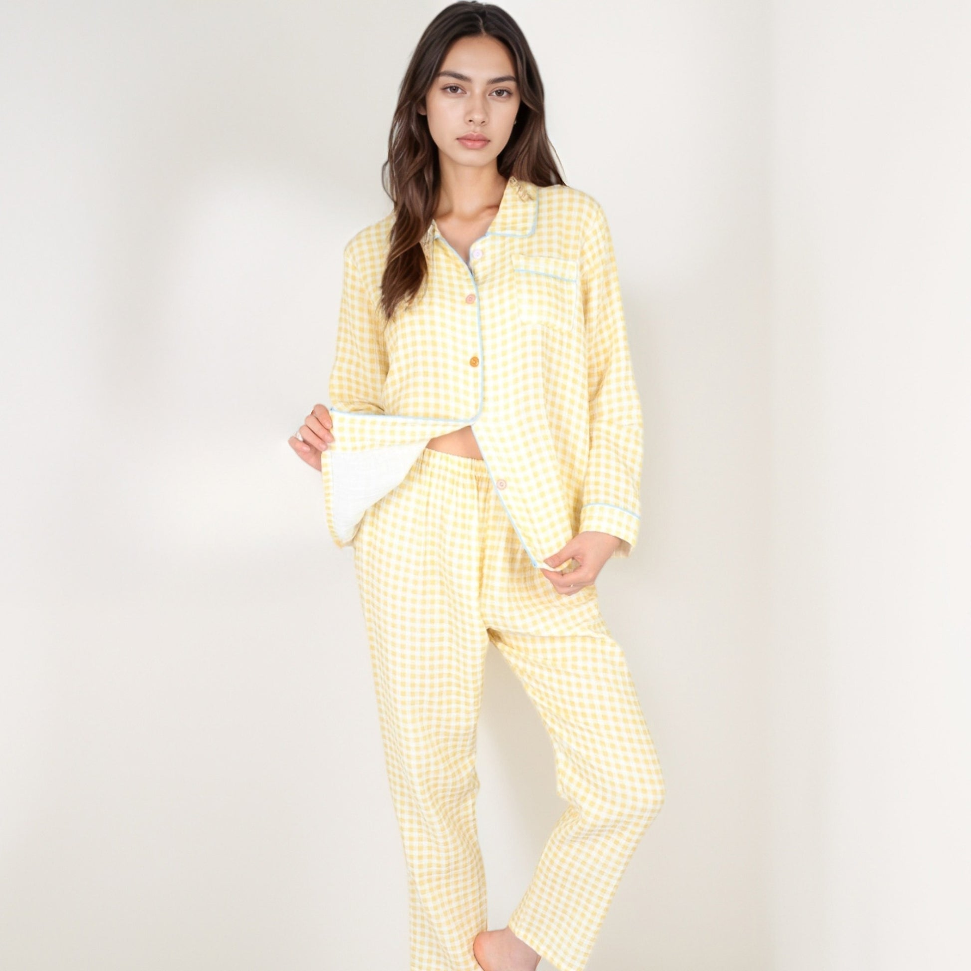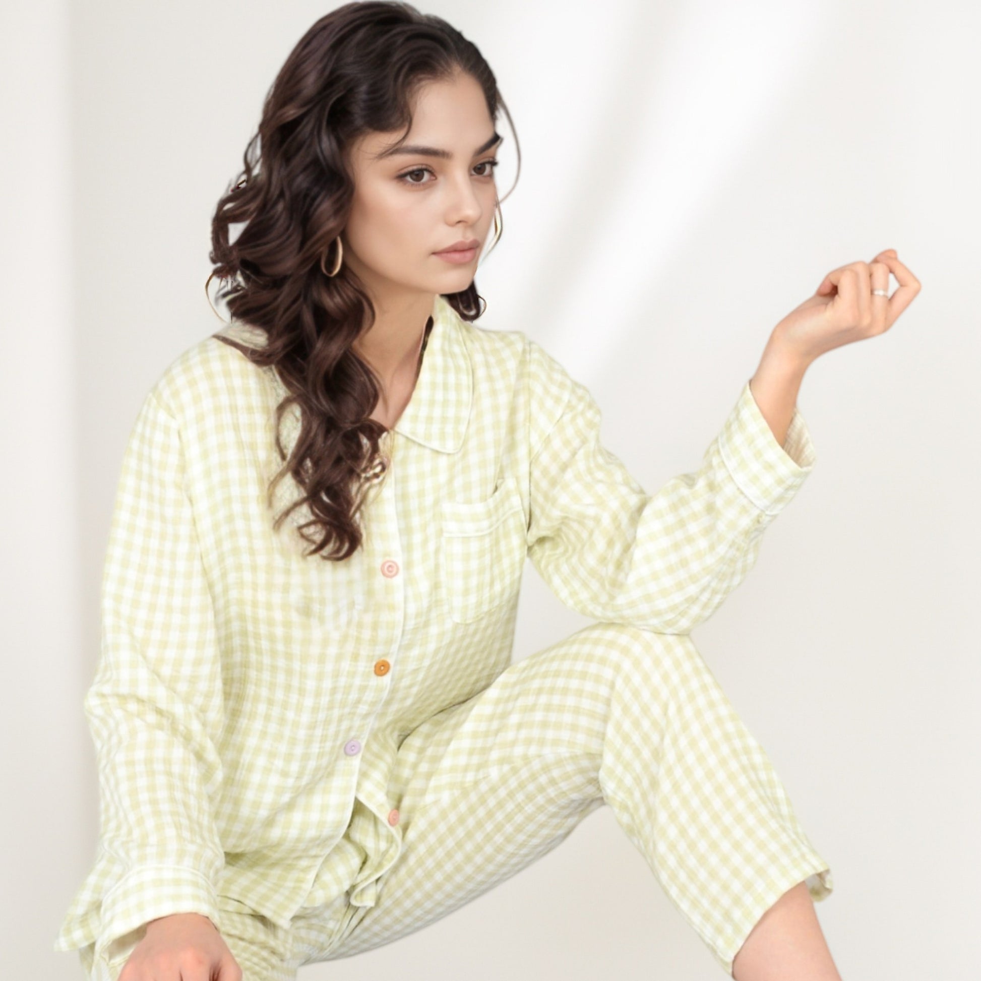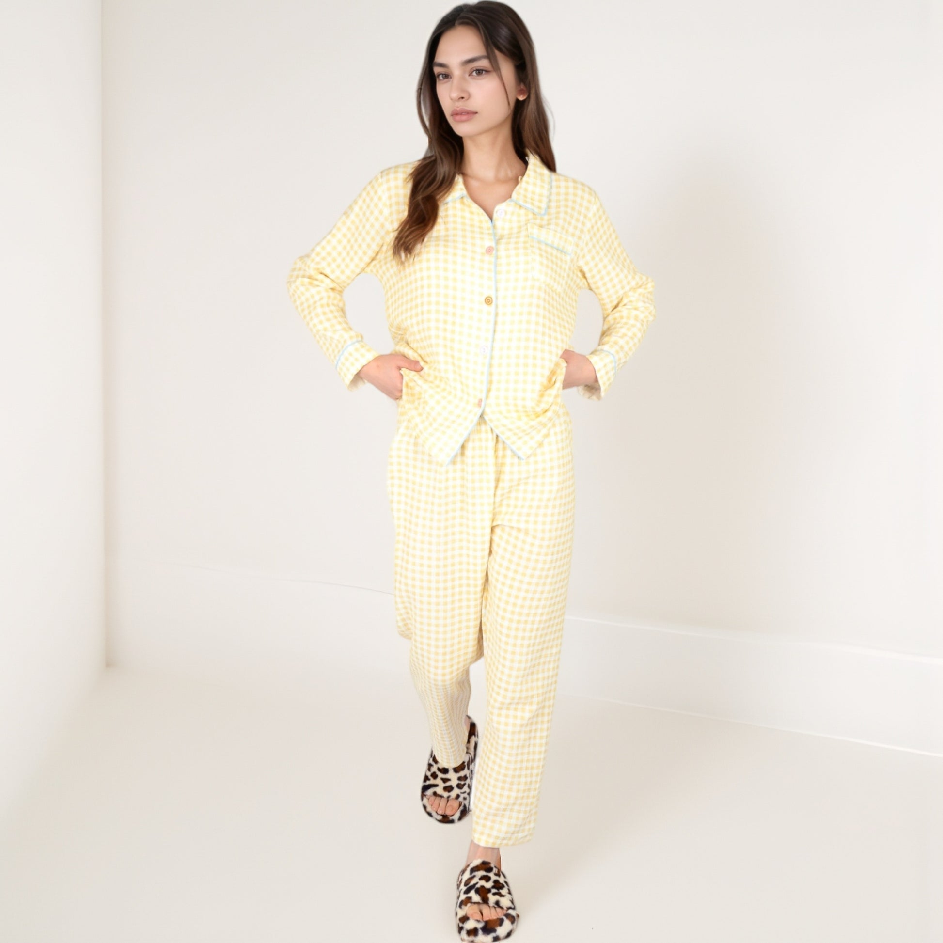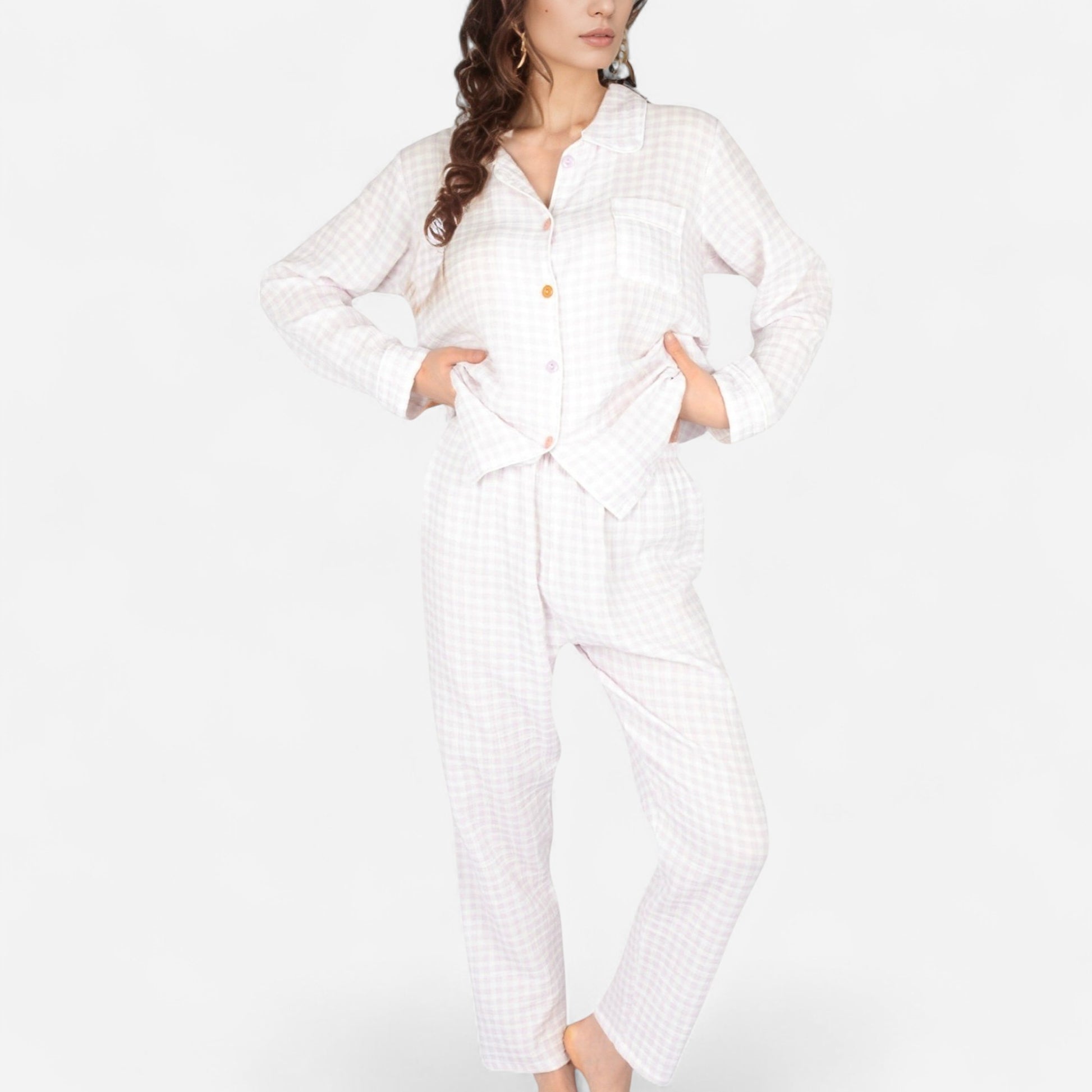 The Anna-Kaci Women's Gingham Pajama Set offers a playful update to classic sleepwear. Featuring a cheerful checkered pattern with multicolored buttons, this set includes a button-up long sleeve top with a chest pocket and relaxed fit straight-leg pants. The soft and breathable fabric ensures all-night comfort and ease. Add a pop of charm to your lounge routine with this cozy, coordinated two-piece set.