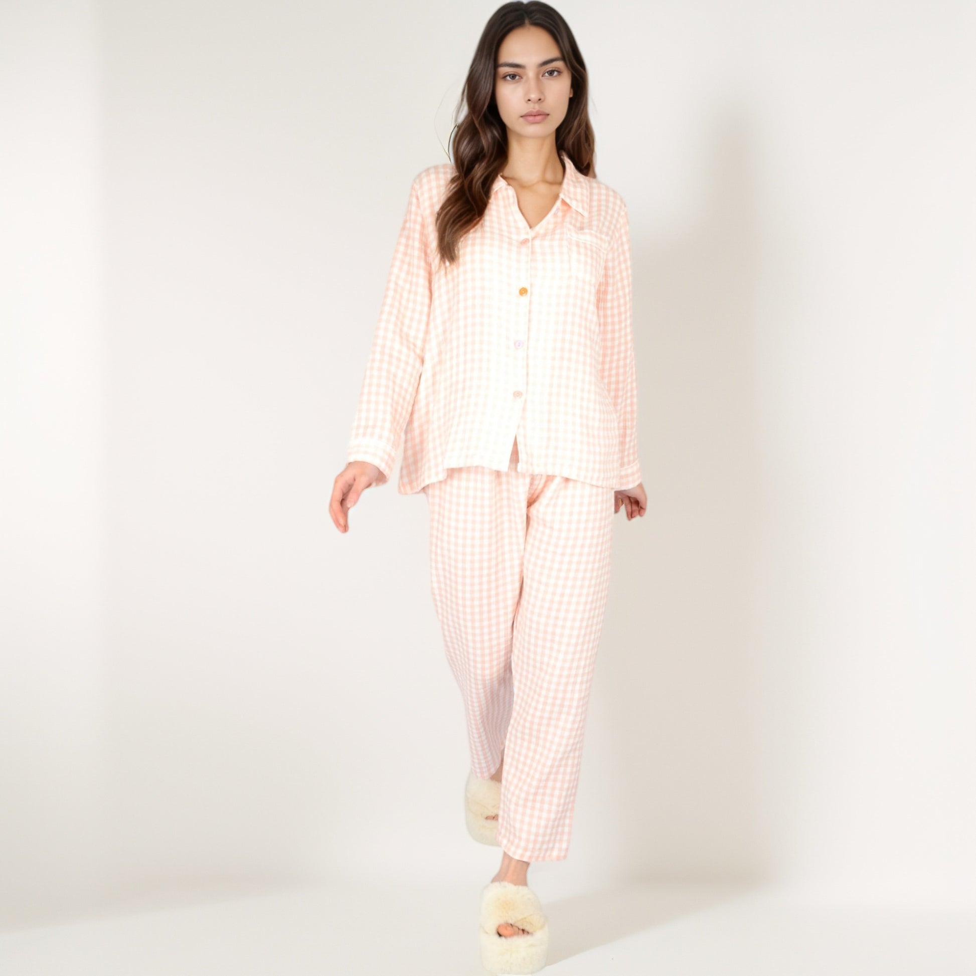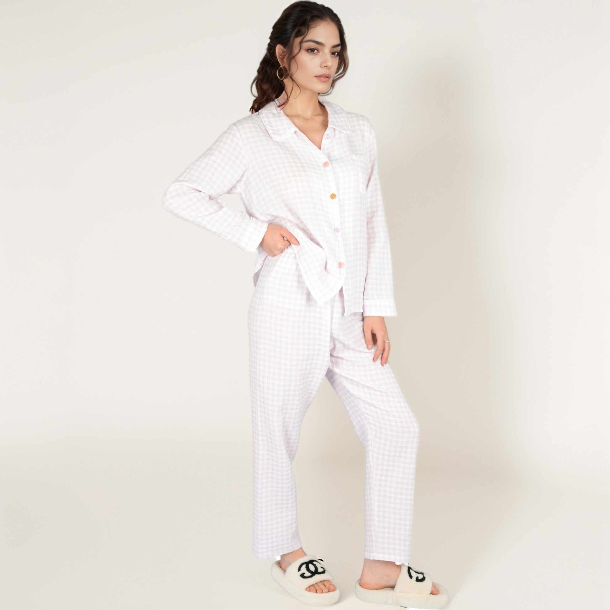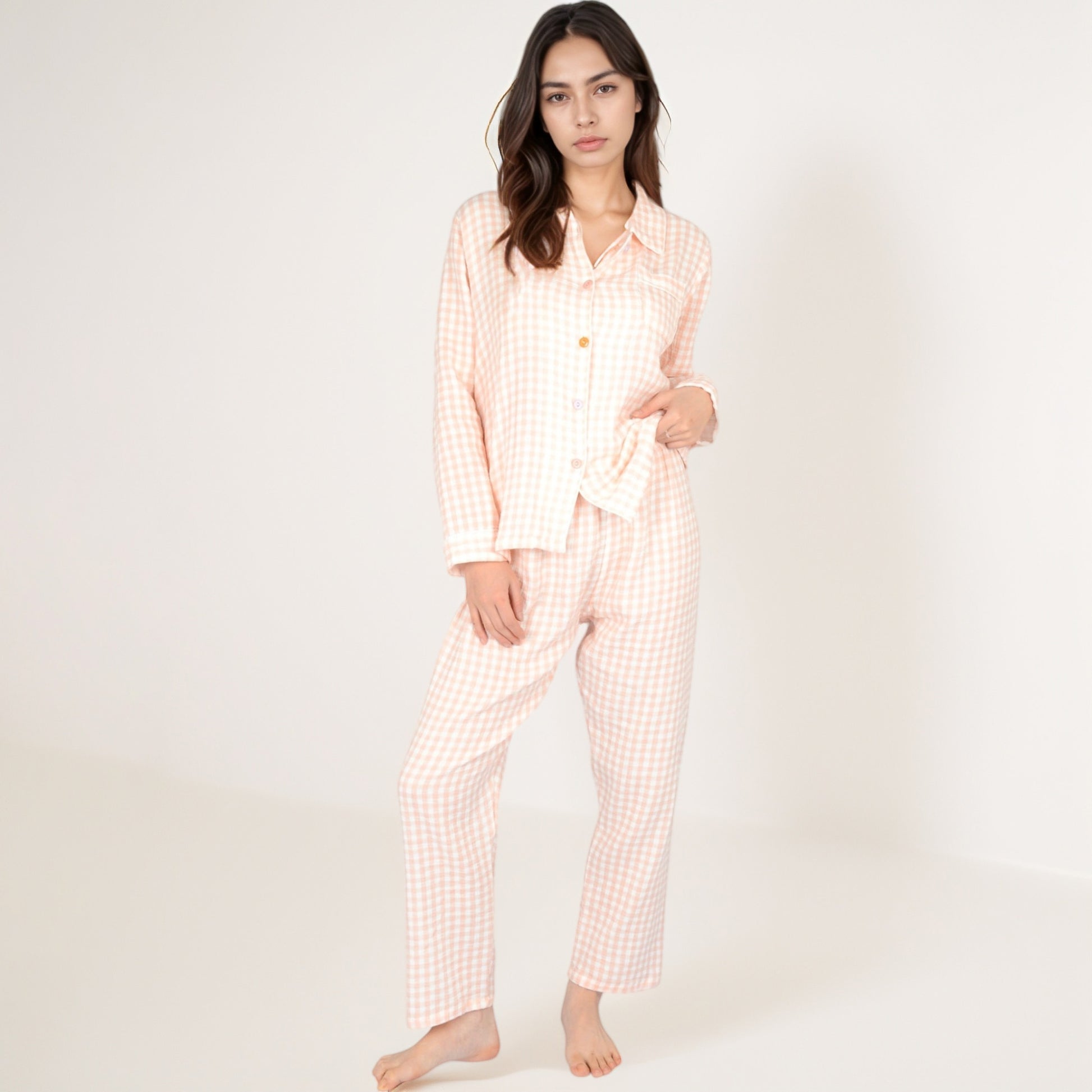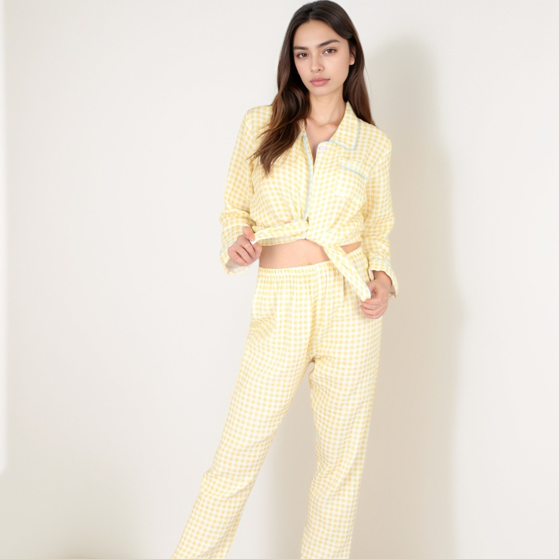 The Anna-Kaci Women's Gingham Pajama Set offers a playful update to classic sleepwear. Featuring a cheerful checkered pattern with multicolored buttons, this set includes a button-up long sleeve top with a chest pocket and relaxed fit straight-leg pants. The soft and breathable fabric ensures all-night comfort and ease. Add a pop of charm to your lounge routine with this cozy, coordinated two-piece set.