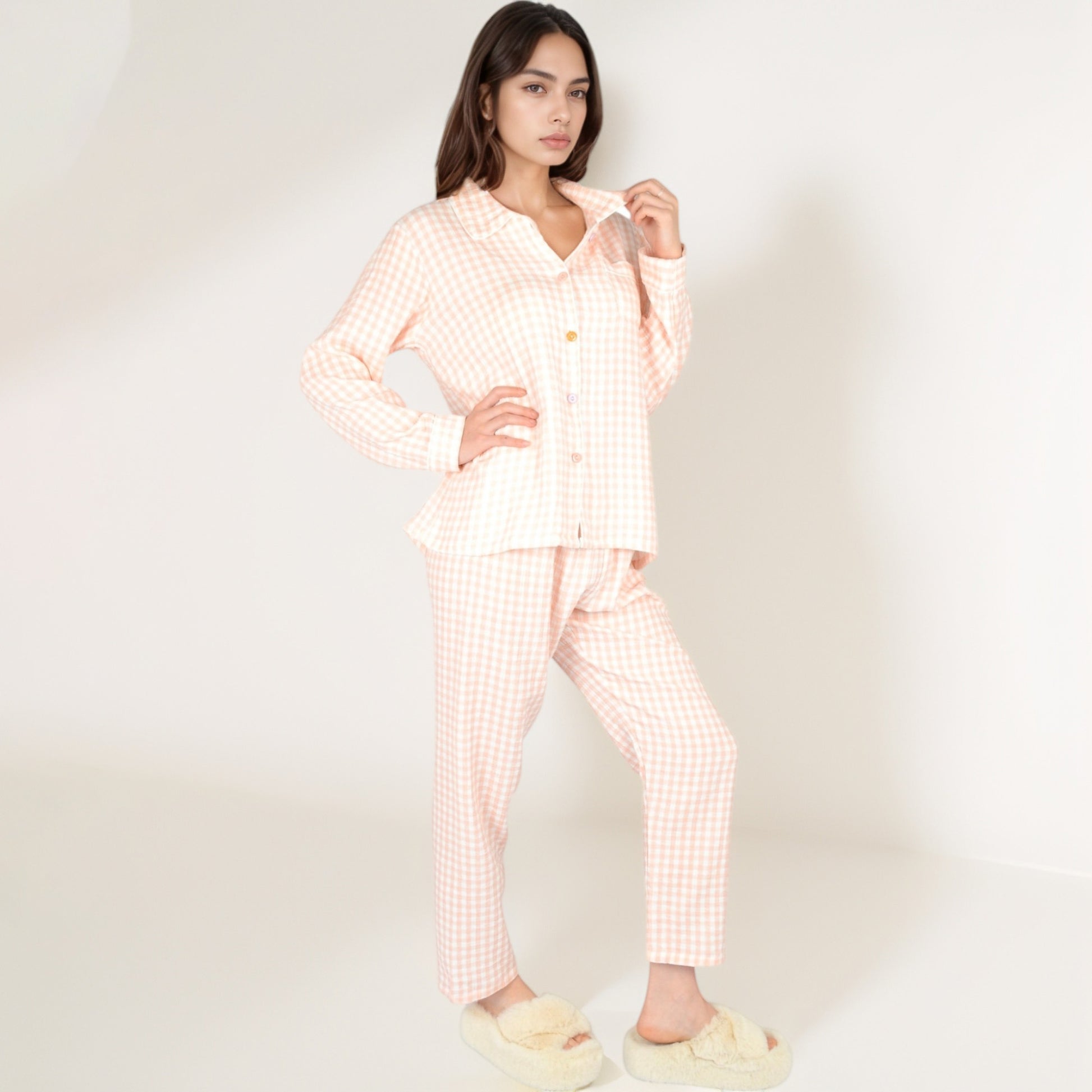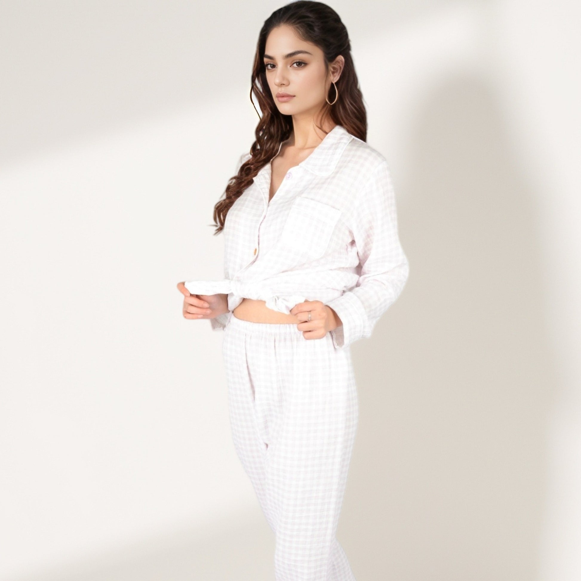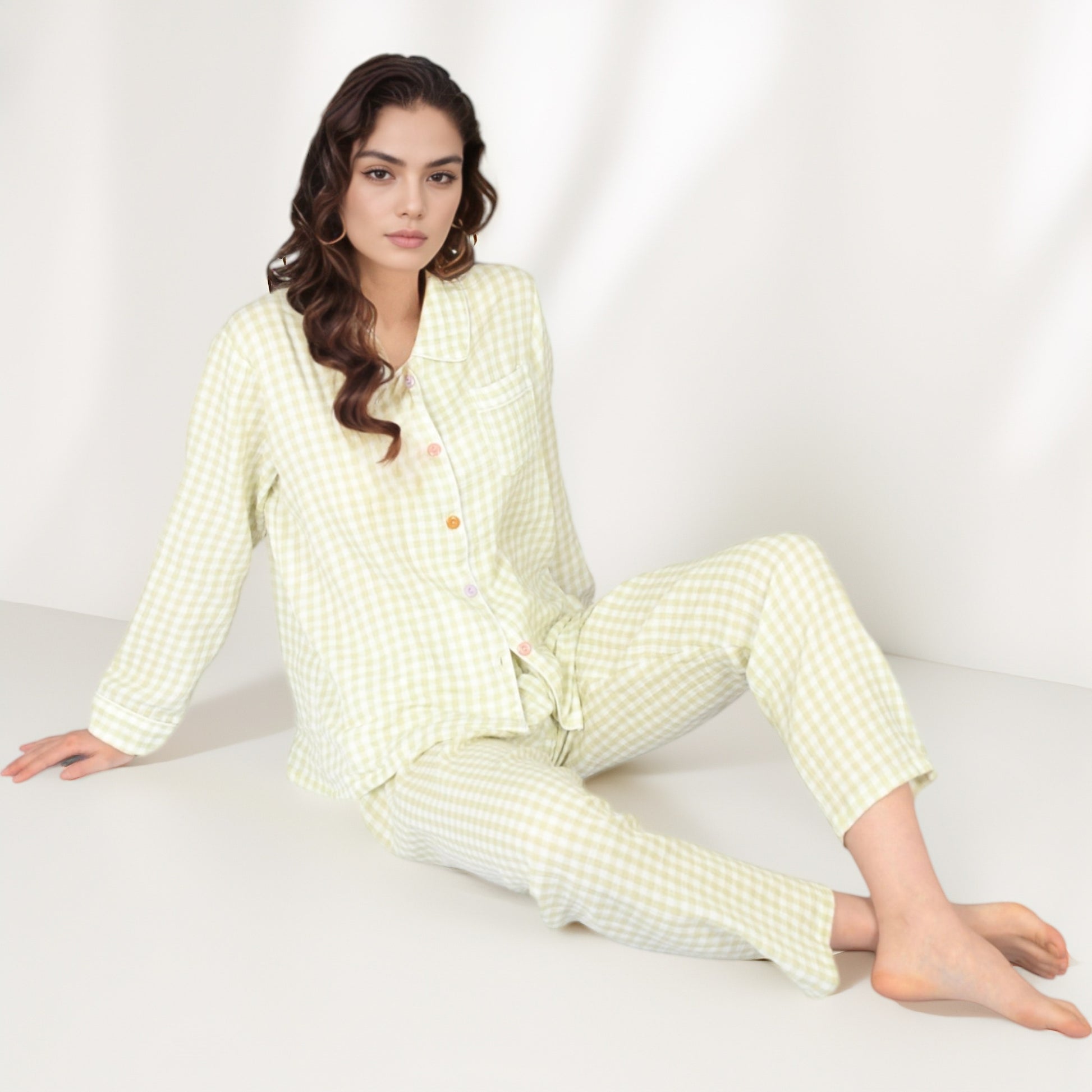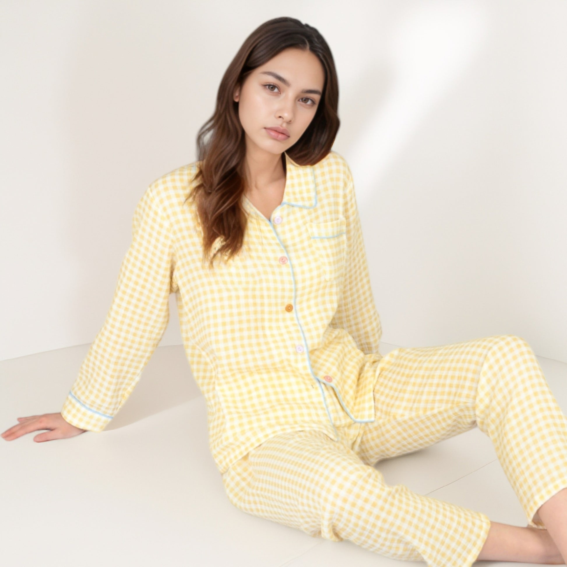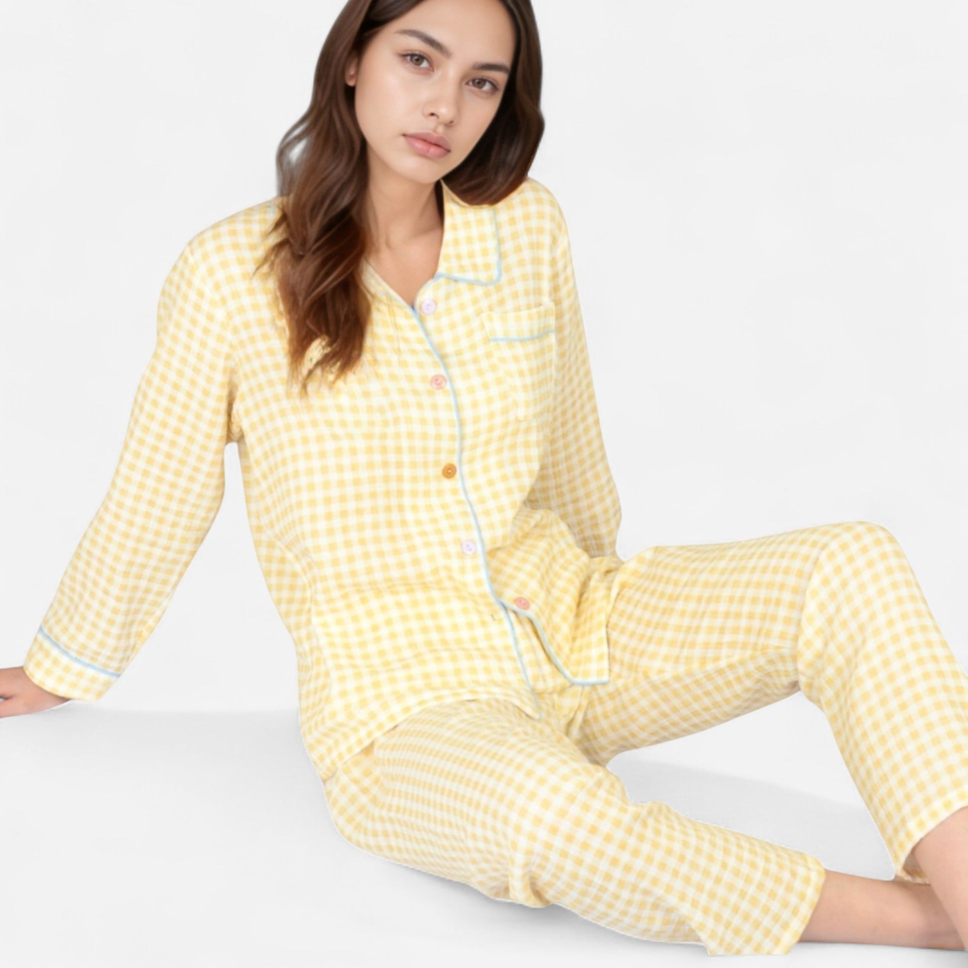 The Anna-Kaci Women's Gingham Pajama Set offers a playful update to classic sleepwear. Featuring a cheerful checkered pattern with multicolored buttons, this set includes a button-up long sleeve top with a chest pocket and relaxed fit straight-leg pants. The soft and breathable fabric ensures all-night comfort and ease. Add a pop of charm to your lounge routine with this cozy, coordinated two-piece set.