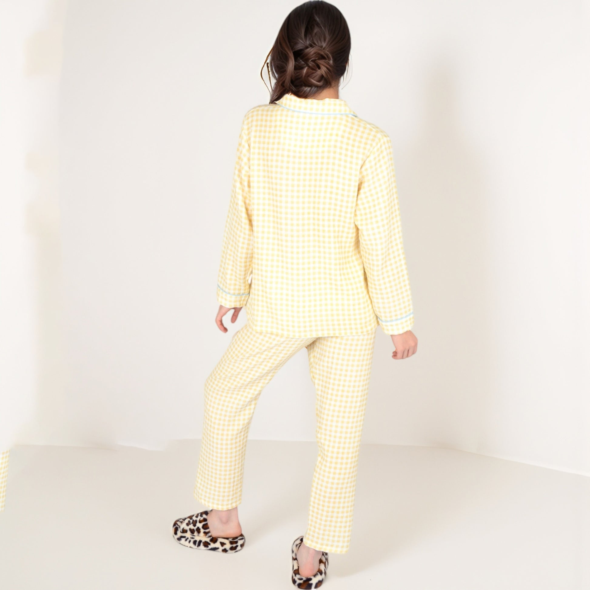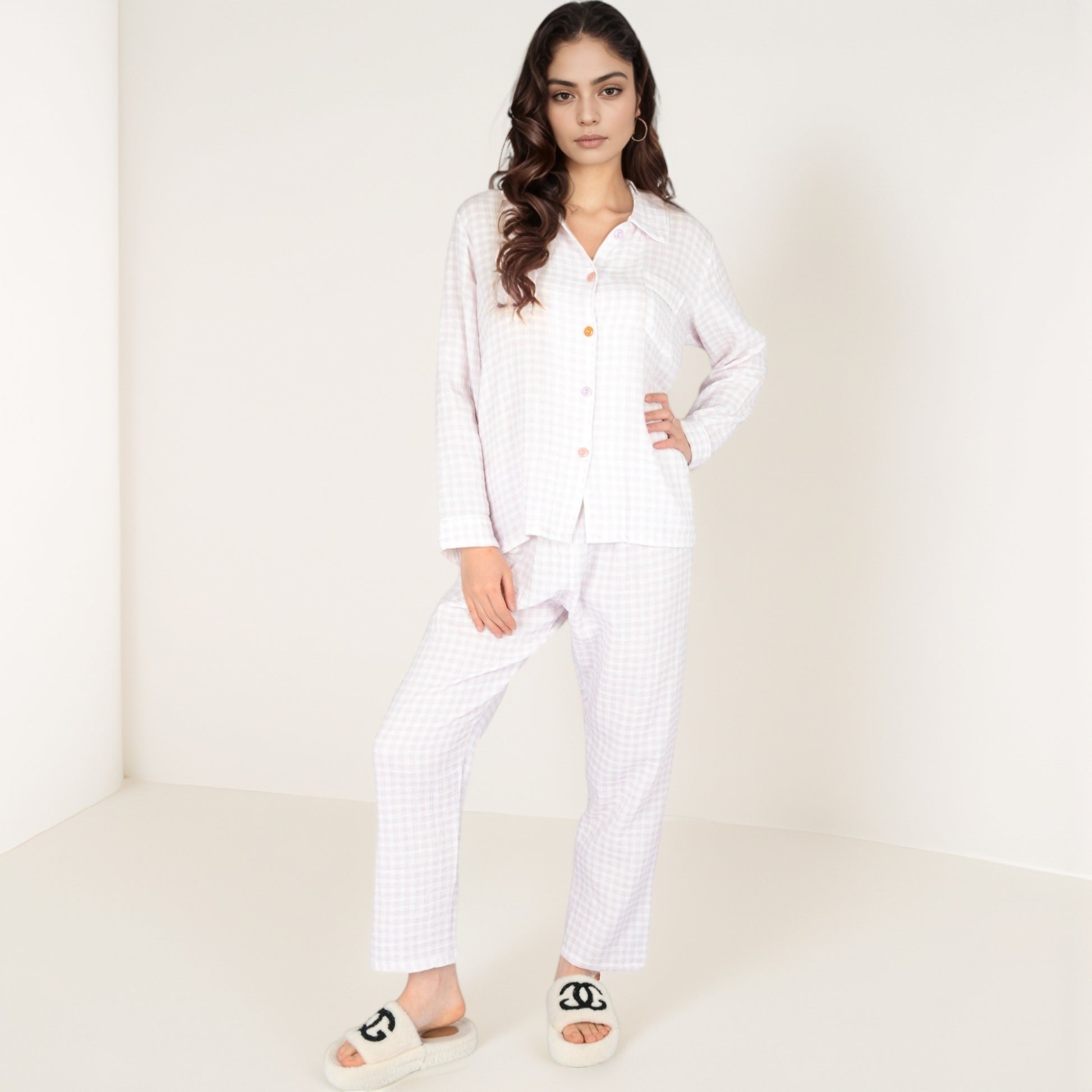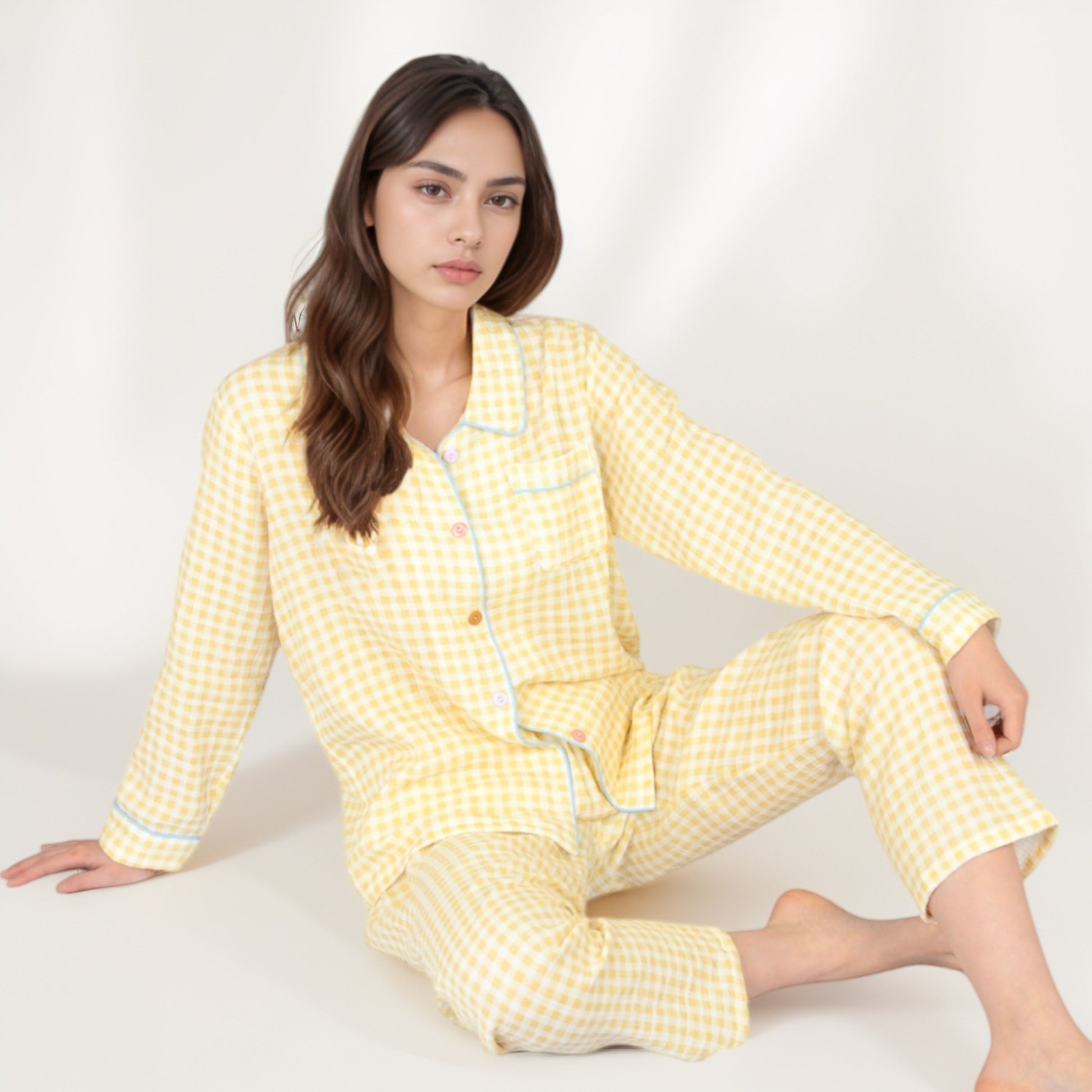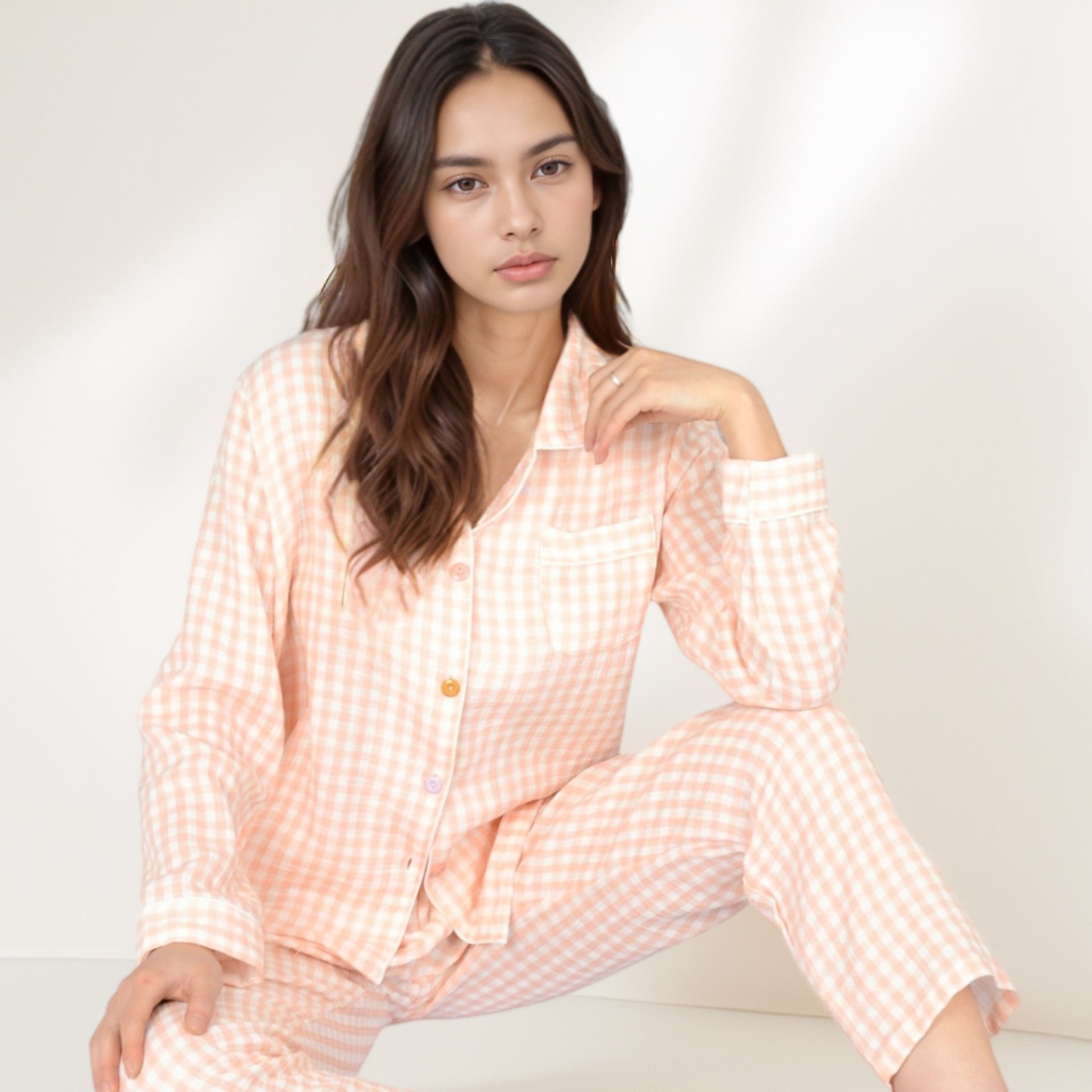 The Anna-Kaci Women's Gingham Pajama Set offers a playful update to classic sleepwear. Featuring a cheerful checkered pattern with multicolored buttons, this set includes a button-up long sleeve top with a chest pocket and relaxed fit straight-leg pants. The soft and breathable fabric ensures all-night comfort and ease. Add a pop of charm to your lounge routine with this cozy, coordinated two-piece set.