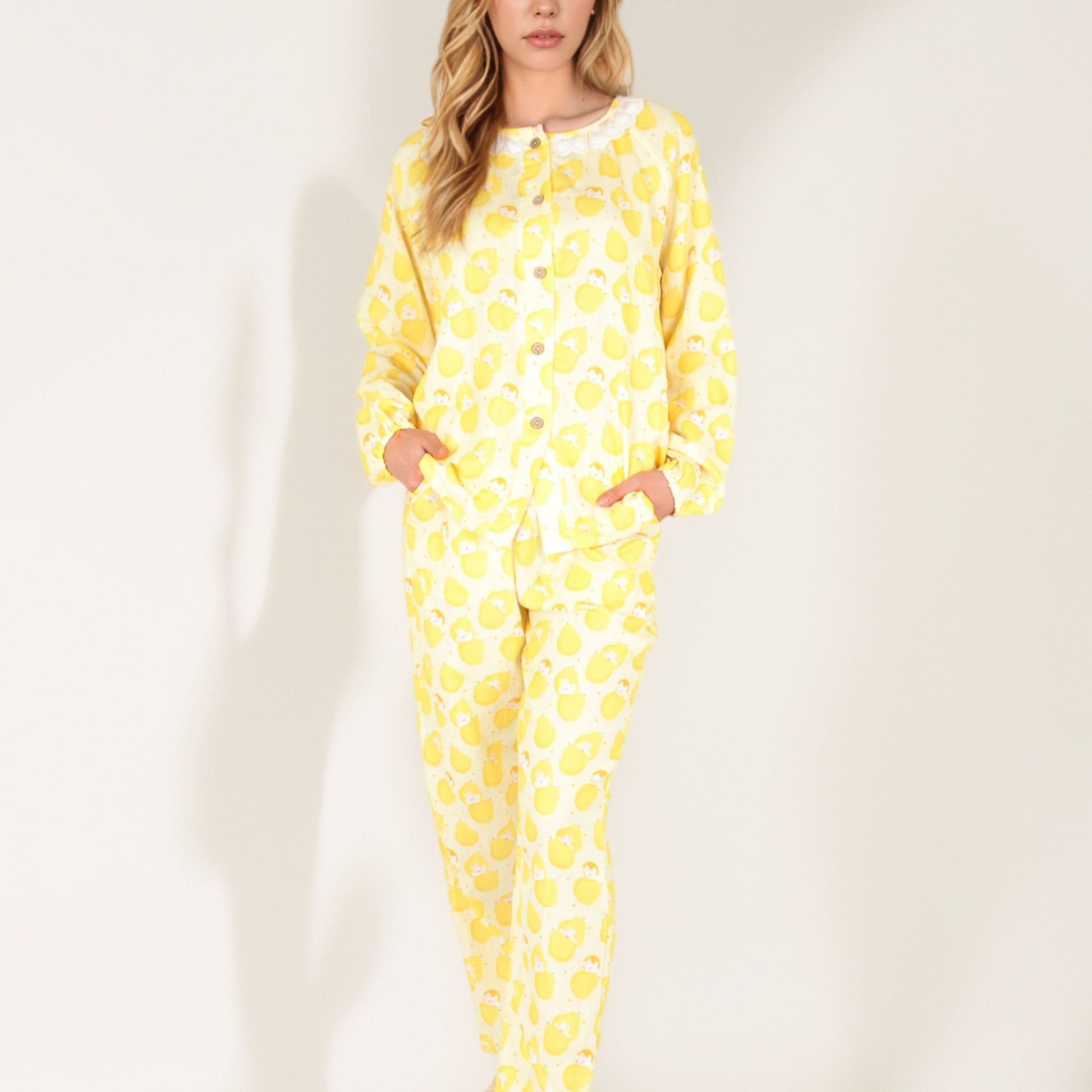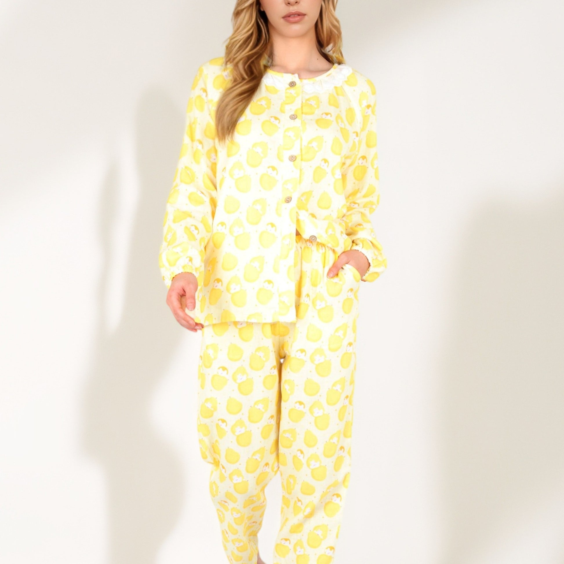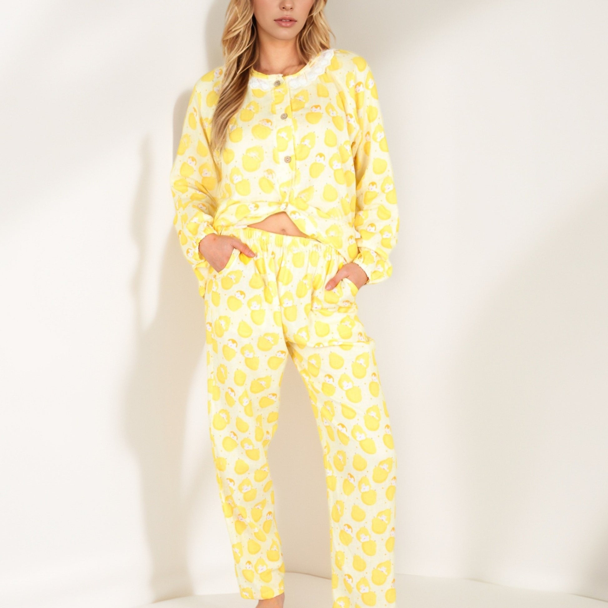 Anna-Kaci Women's Lemon Print Long Sleeve Pajama Set with Ruffle Trim Button Top and Relaxed Fit Elastic Waist Pants