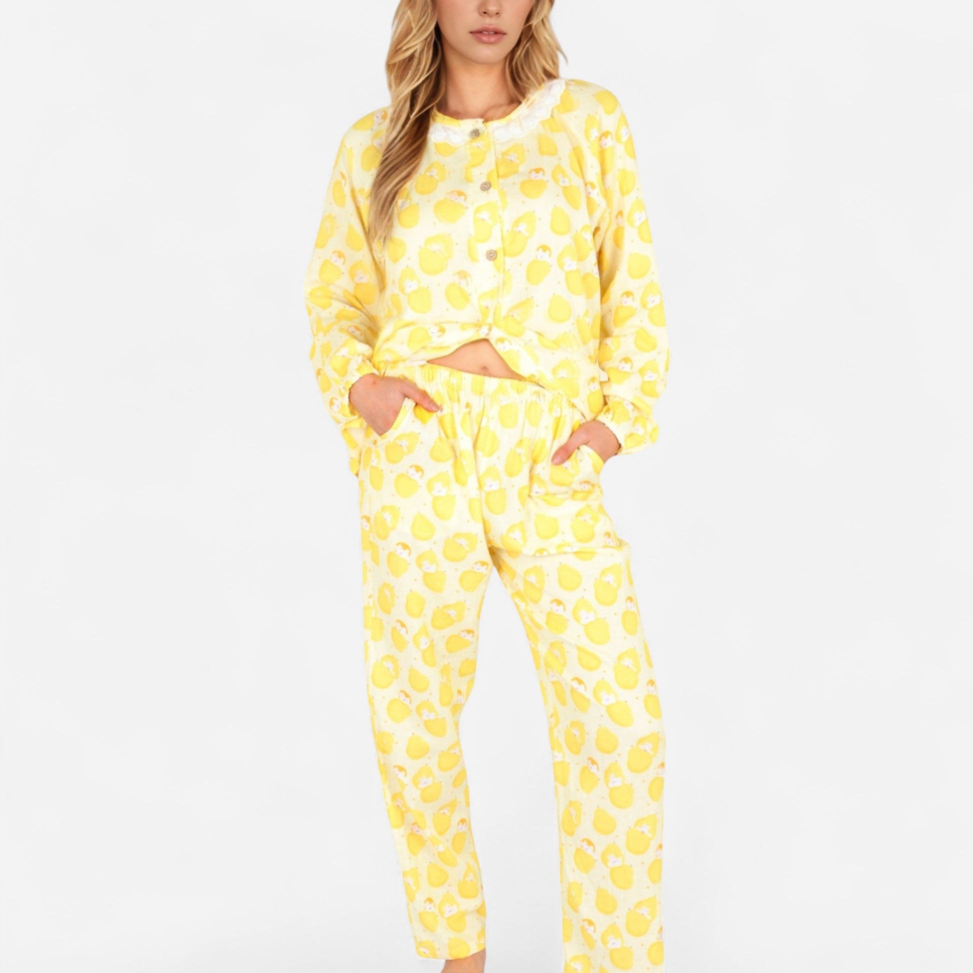 The Anna-Kaci Women's Lemon Print Pajama Set brings a cheerful vibe to your nighttime routine. Featuring a playful allover lemon pattern, this set includes a button-up long sleeve top with a delicate ruffle-trim collar and matching elastic waist pants. The lightweight fabric offers a soft, breathable feel for relaxing at home. Brighten your evenings with this fun and refreshing two-piece sleepwear set.