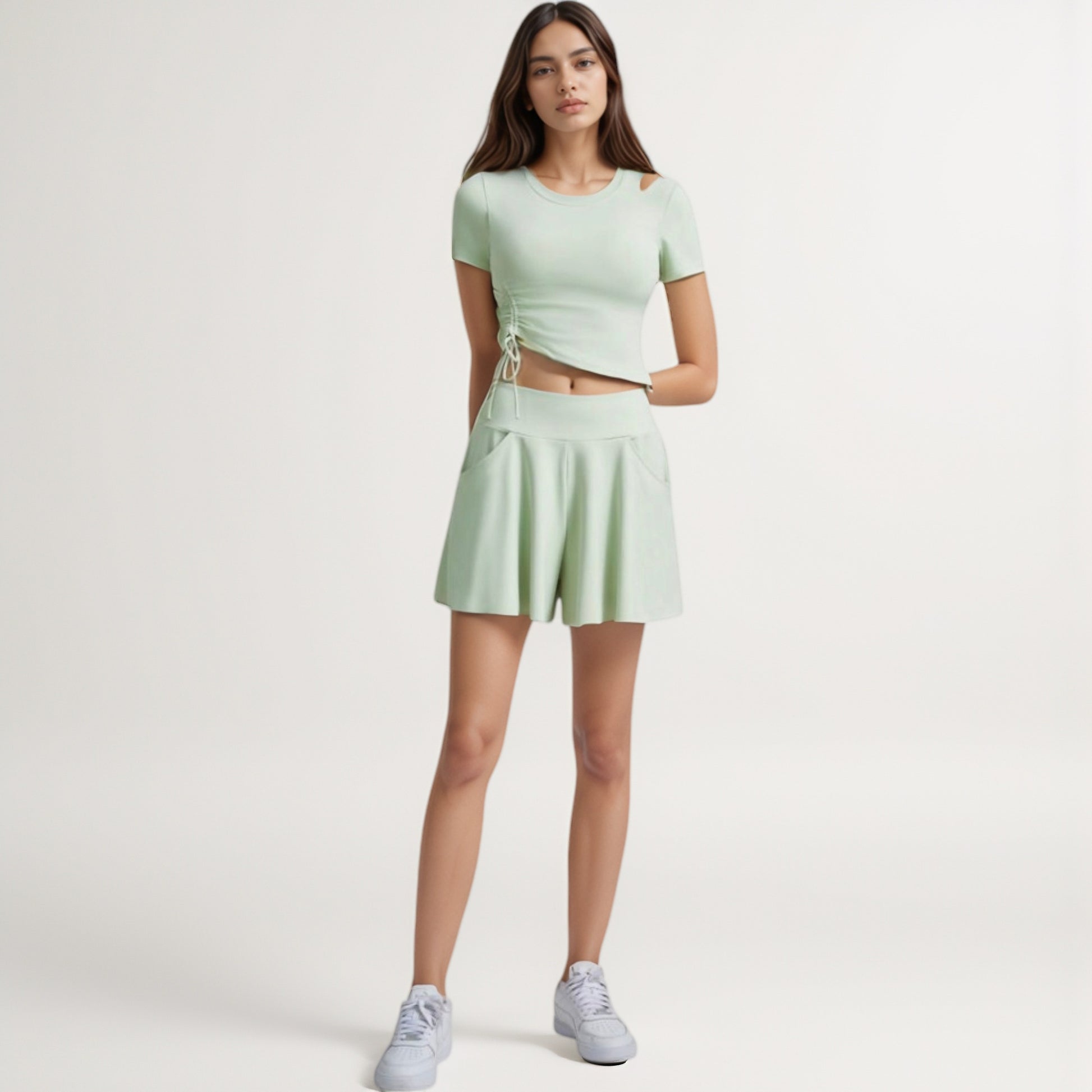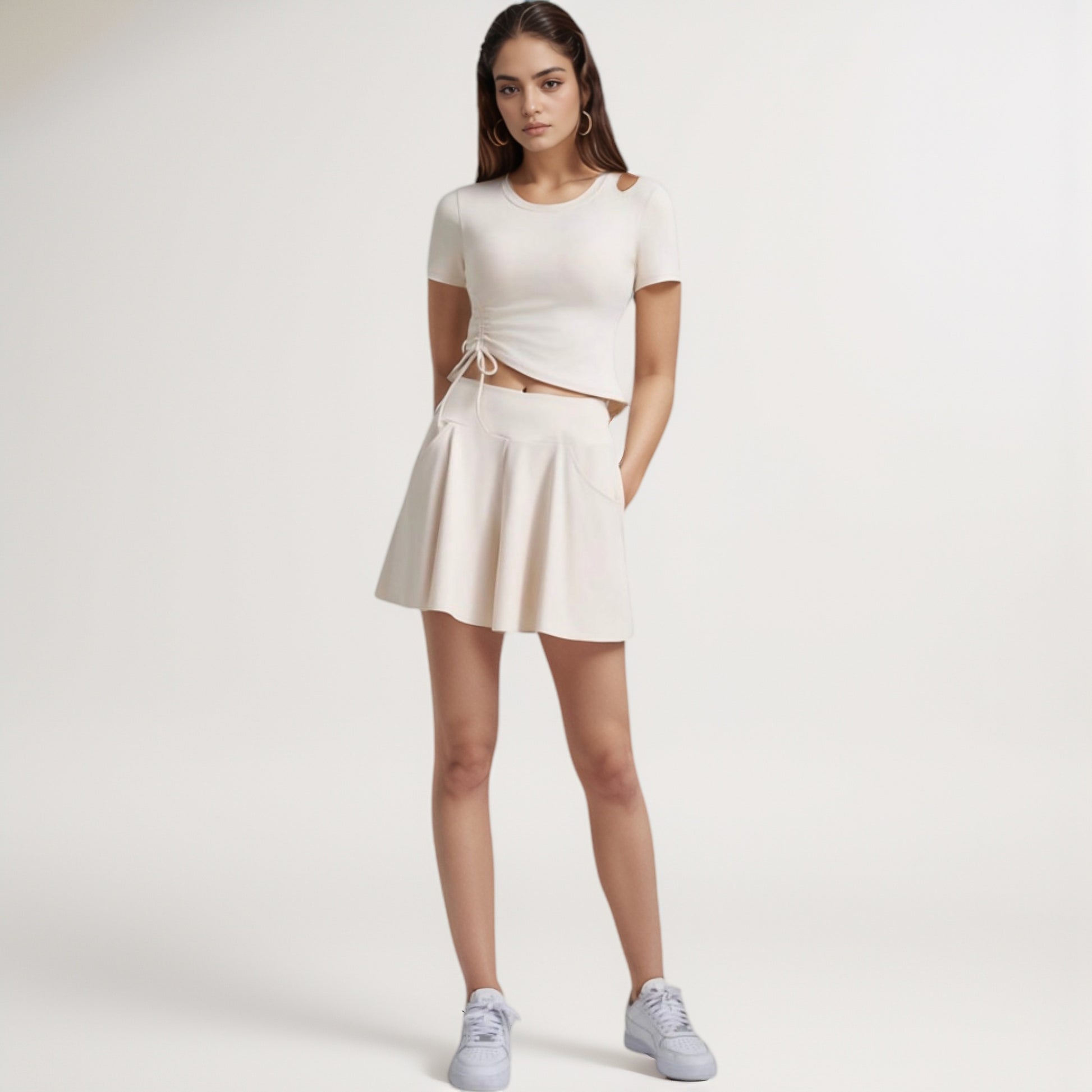 The Anna-Kaci Women's High Waist Flowy Athletic Skort is designed for effortless movement and everyday ease. Featuring a flattering high-rise waistband and hidden built-in shorts, it ensures coverage and support while maintaining a lightweight feel. Functional side pockets blend seamlessly into the flowing silhouette for added convenience. Crafted with breathable stretch fabric, this skort offers a stylish balance of comfort and practicality.
