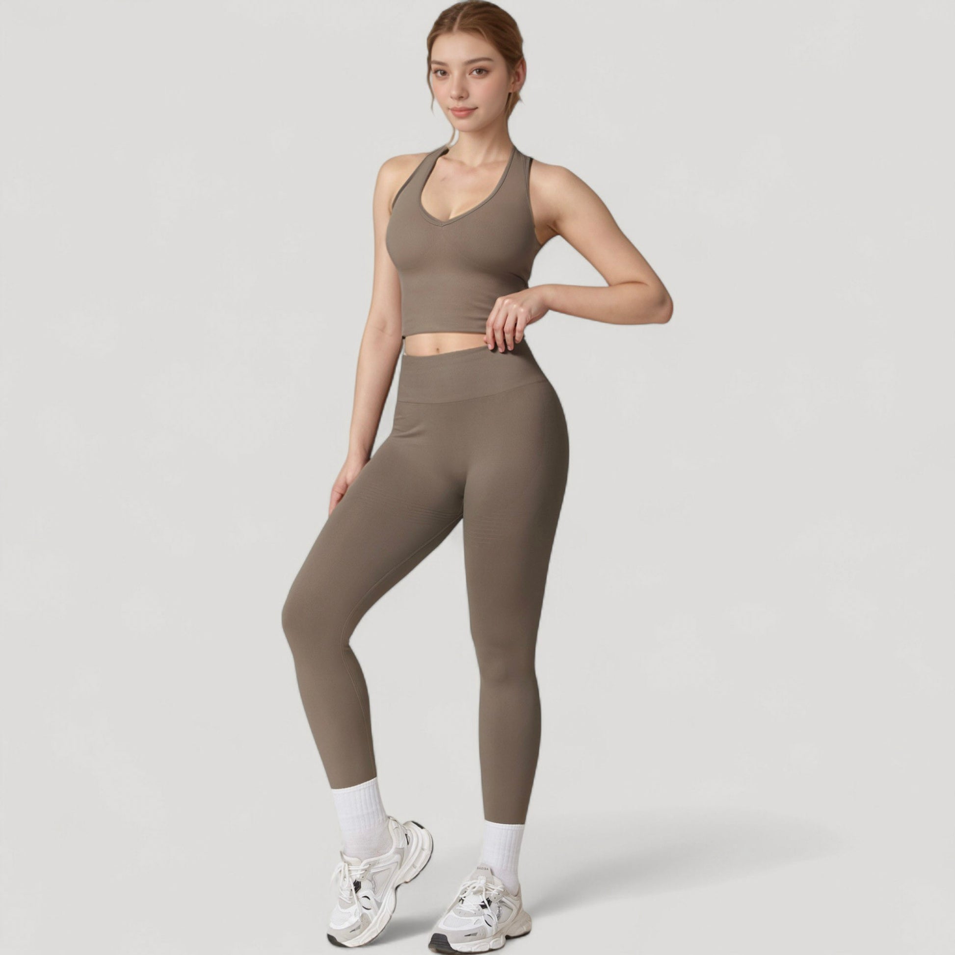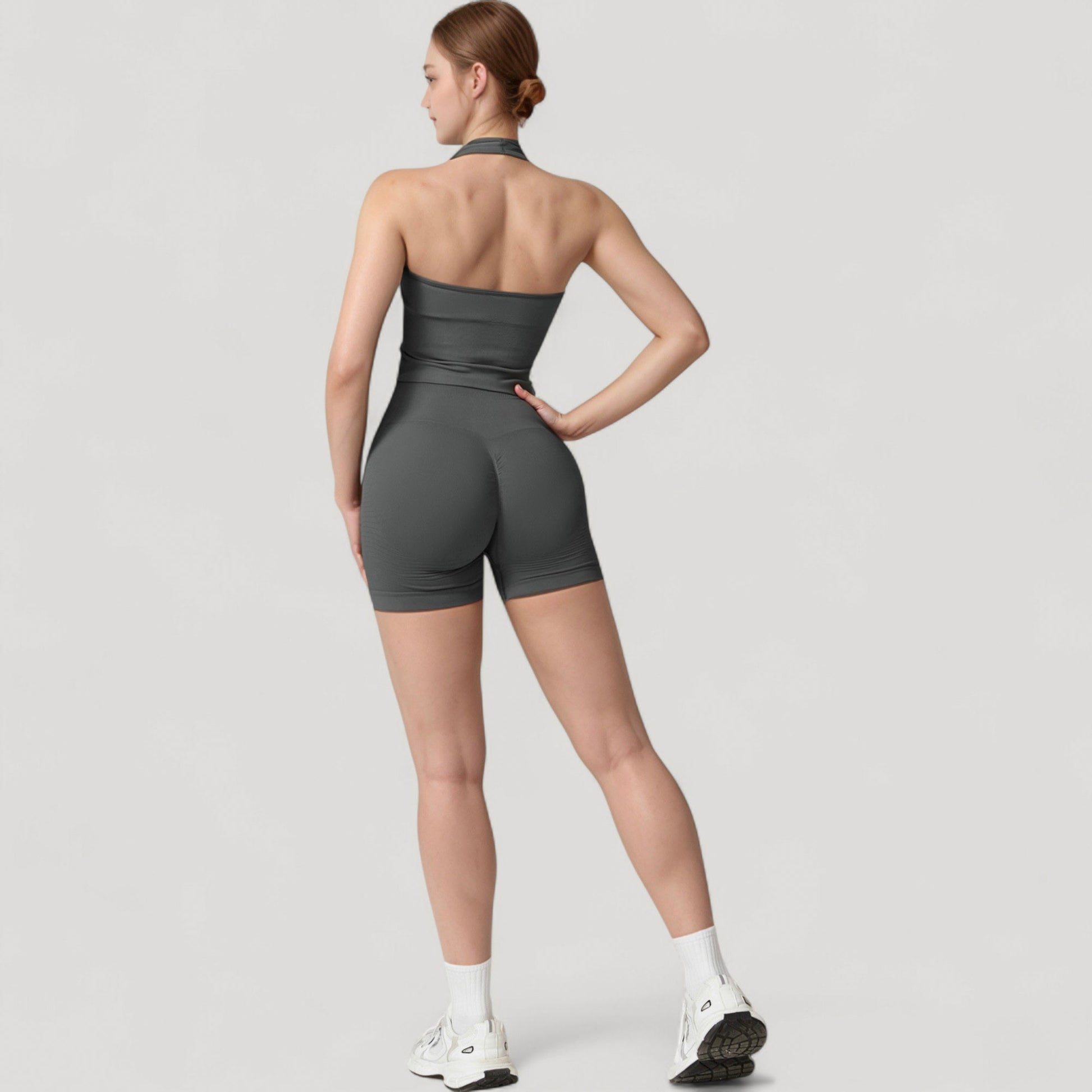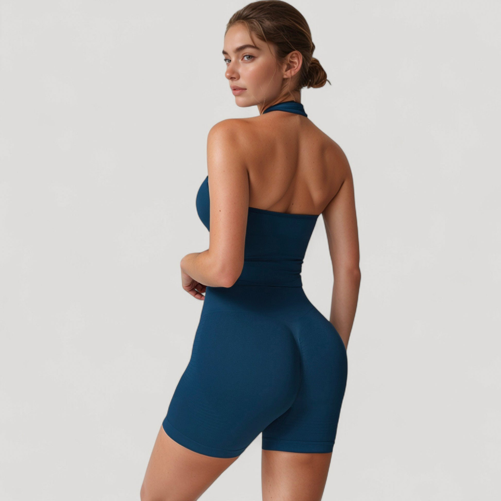 This women's seamless halter crop top features a flattering V-neckline and sleek racer-style halter cut that sculpts the upper body. Crafted from a soft, stretchy ribbed knit, it offers built-in support and a contoured fit that hugs comfortably without restriction. The seamless construction creates a smooth, chafe-free feel, making it ideal for yoga, pilates, or daily wear. With its sporty design and modern cropped length, this top adds versatile edge to any activewear wardrobe.