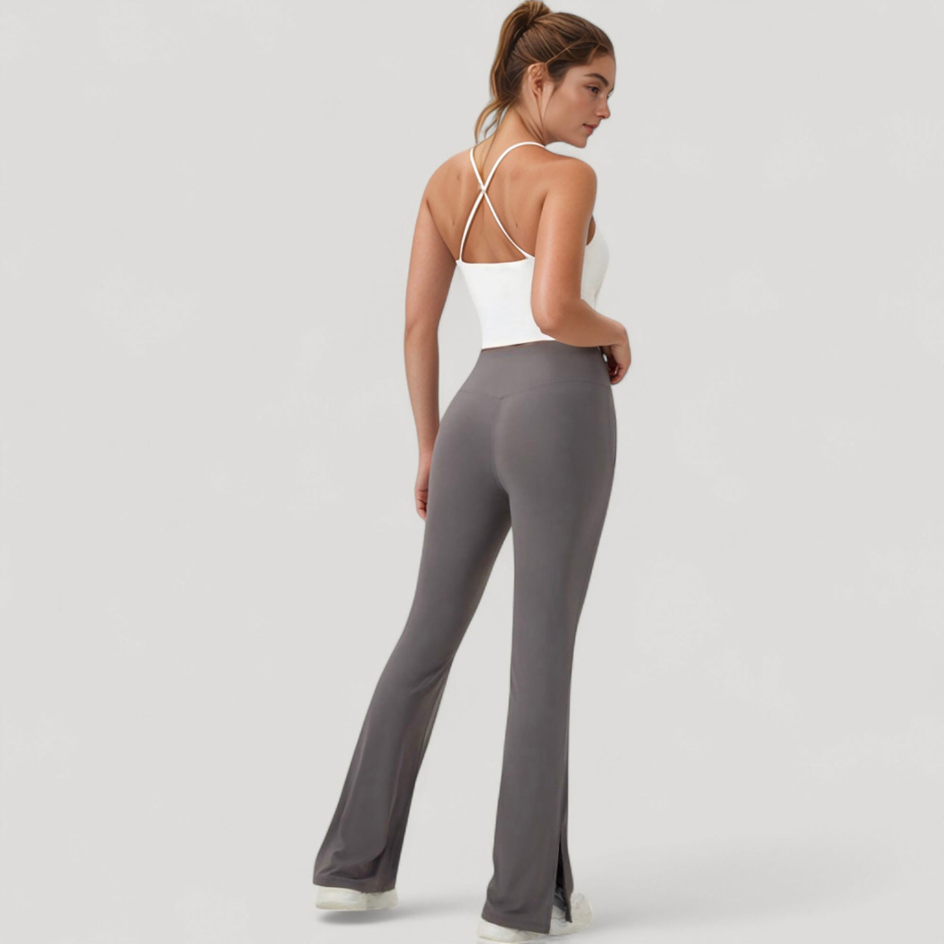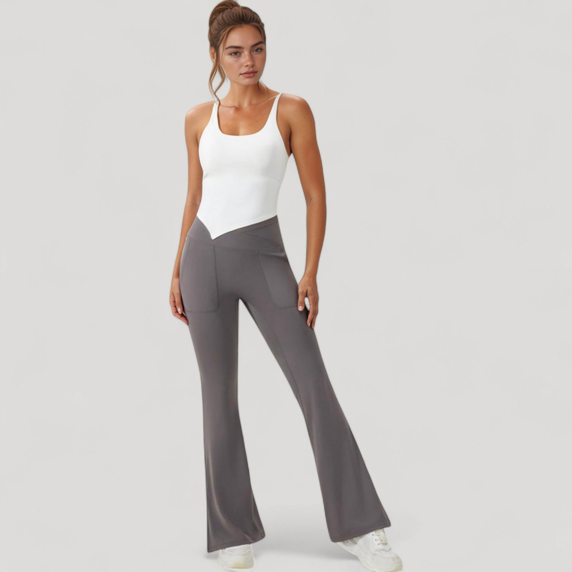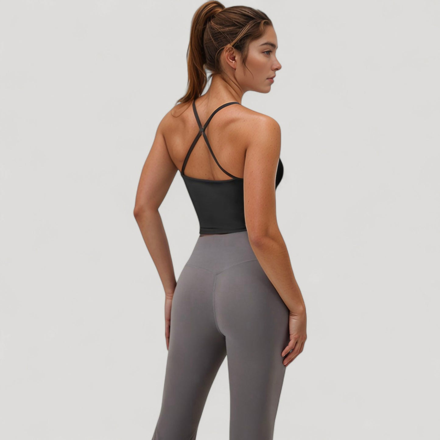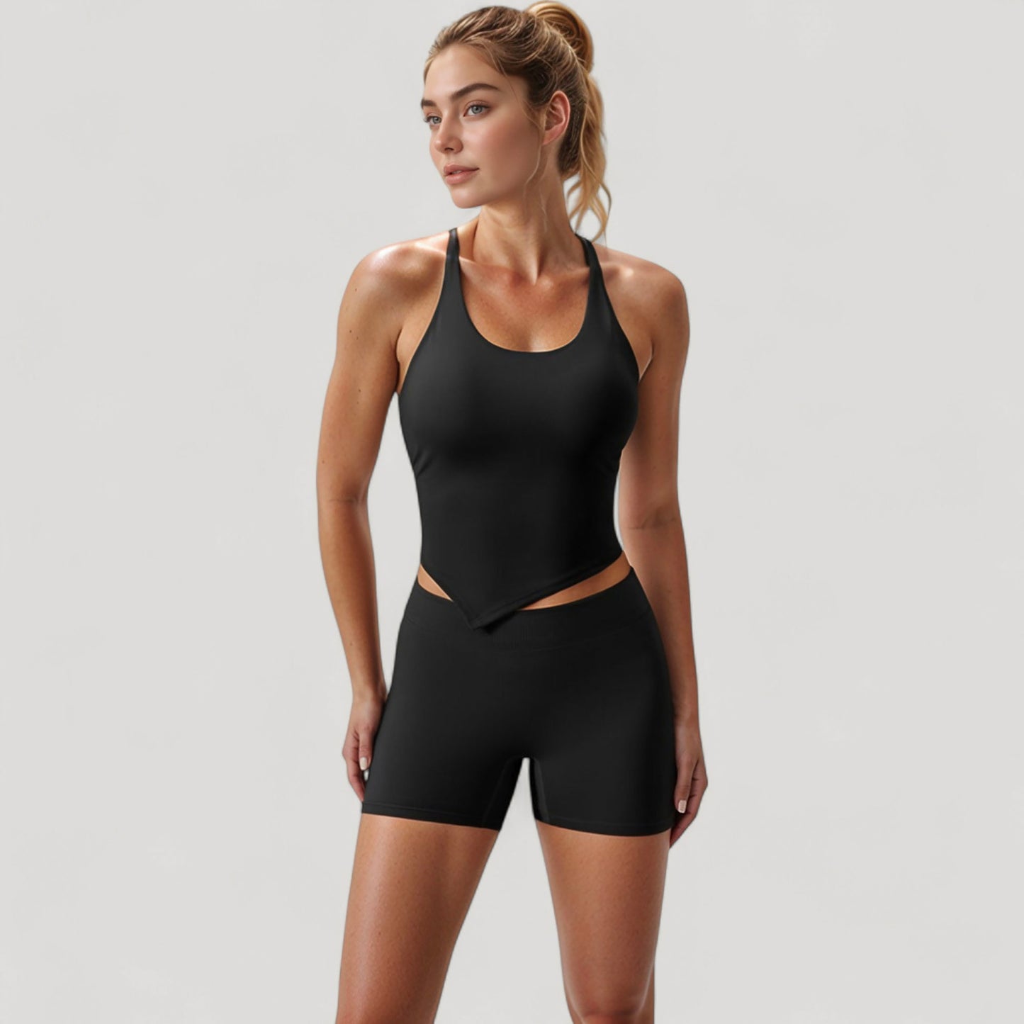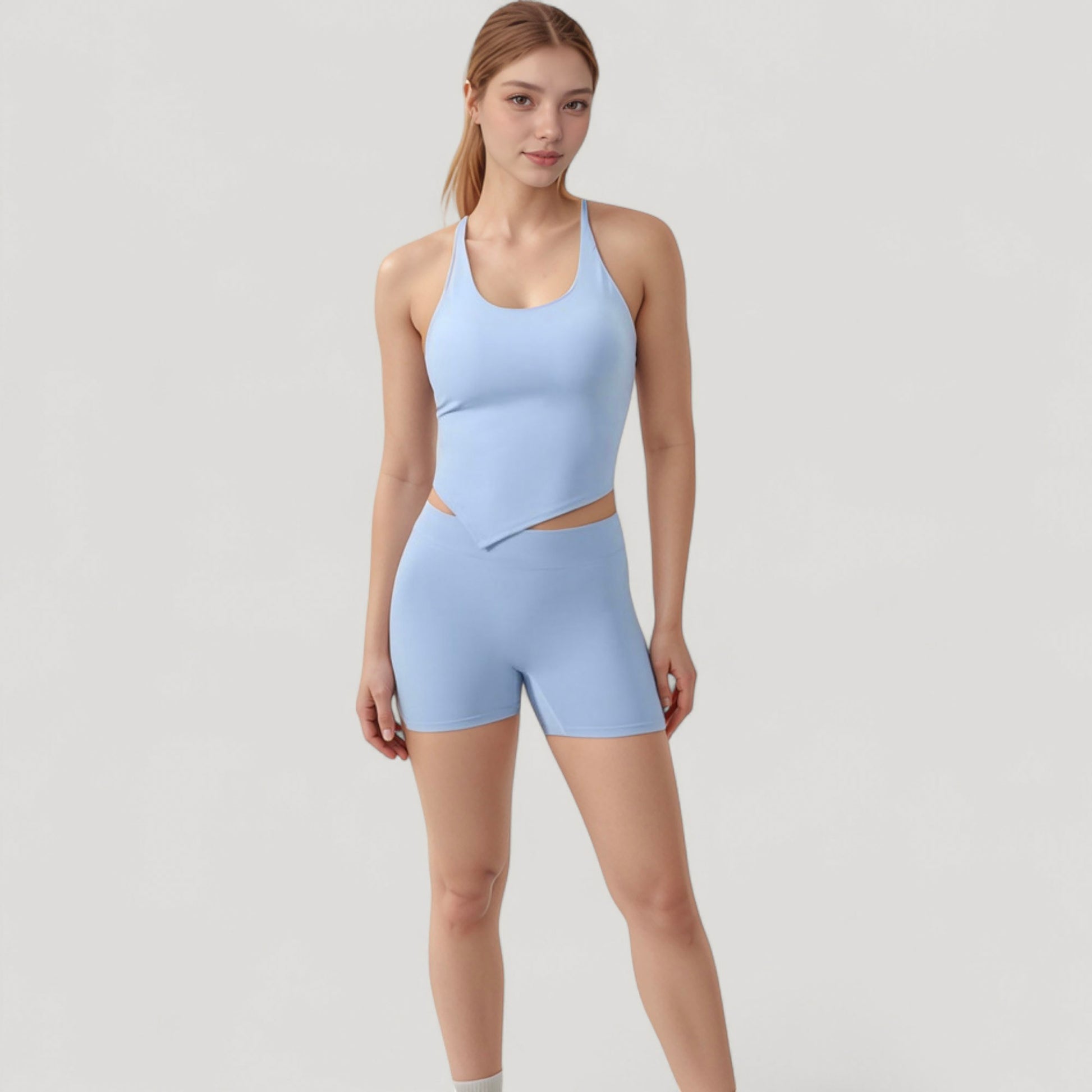 The Anna-Kaci Women's Scoop Neck Racerback Tank Top features a sleek, sculpted design with a soft, supportive fit. Built with a built-in shelf bra and stretchy moisture-wicking fabric, it offers light support for low-impact movement. The unique handkerchief hem adds a stylish edge while enhancing a flattering silhouette. Designed for comfort and movement, it's ideal for layering or wearing solo during active or casual moments.