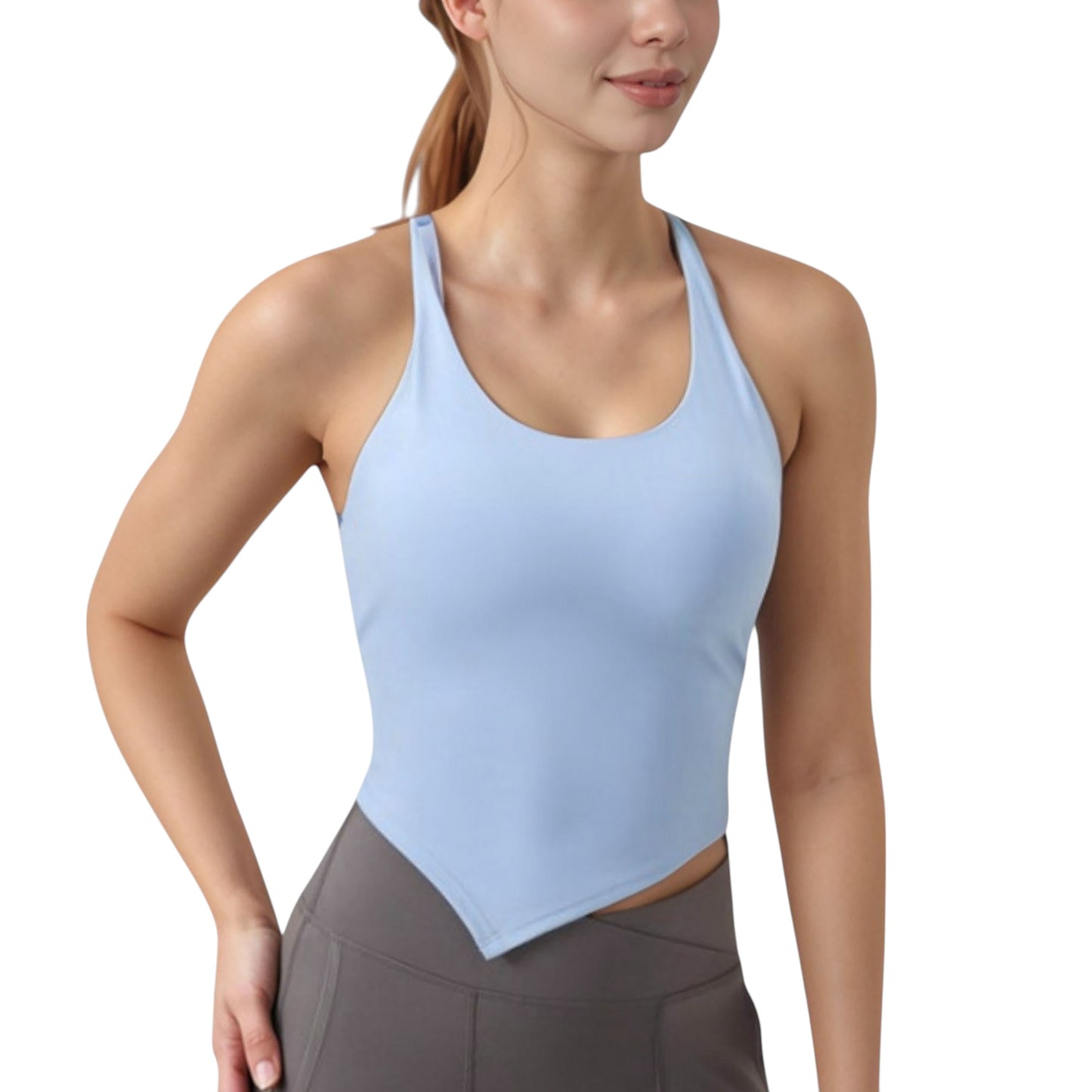 Anna-Kaci Active Women's Scoop Neck Racerback Tank Top with Handkerchief Hem and Built-In Shelf Bra for Low Impact Activity
