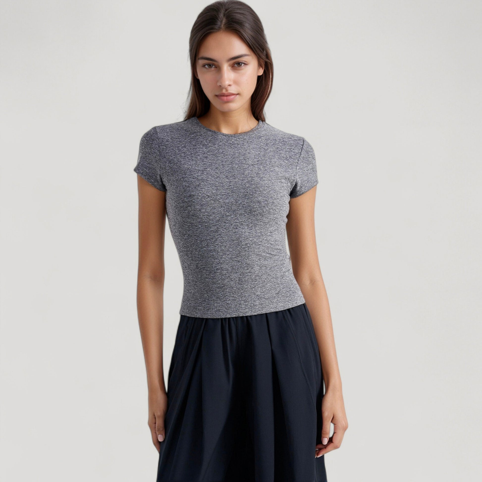 The Anna-Kaci Women's Short Sleeve Crew Neck Top is designed with a sleek, body-hugging fit that flatters your silhouette while offering incredible comfort. Made with ultra-soft, stretchy fabric, it provides a smooth, breathable feel ideal for layering or wearing on its own. With its minimalist design and timeless shape, this top is a staple piece for any versatile wardrobe.