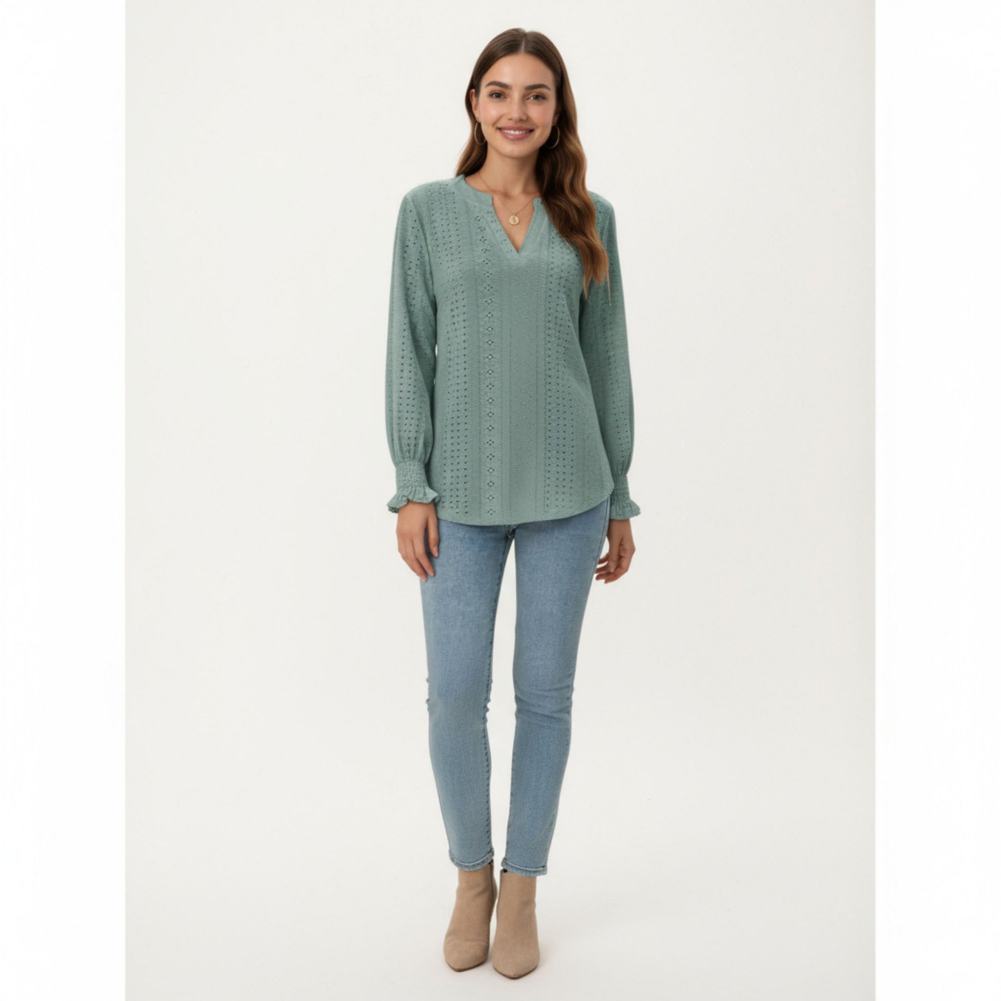 The Anna-Kaci Women's Long Sleeve Eyelet Embroidered Top offers a feminine and stylish look with its delicate eyelet detailing and flattering V-neckline. Designed with subtle ruffle cuffs and a relaxed fit, this lightweight top pairs effortlessly with jeans or skirts for a polished yet casual outfit. Perfect for layering or wearing on its own, it brings texture and charm to your wardrobe.