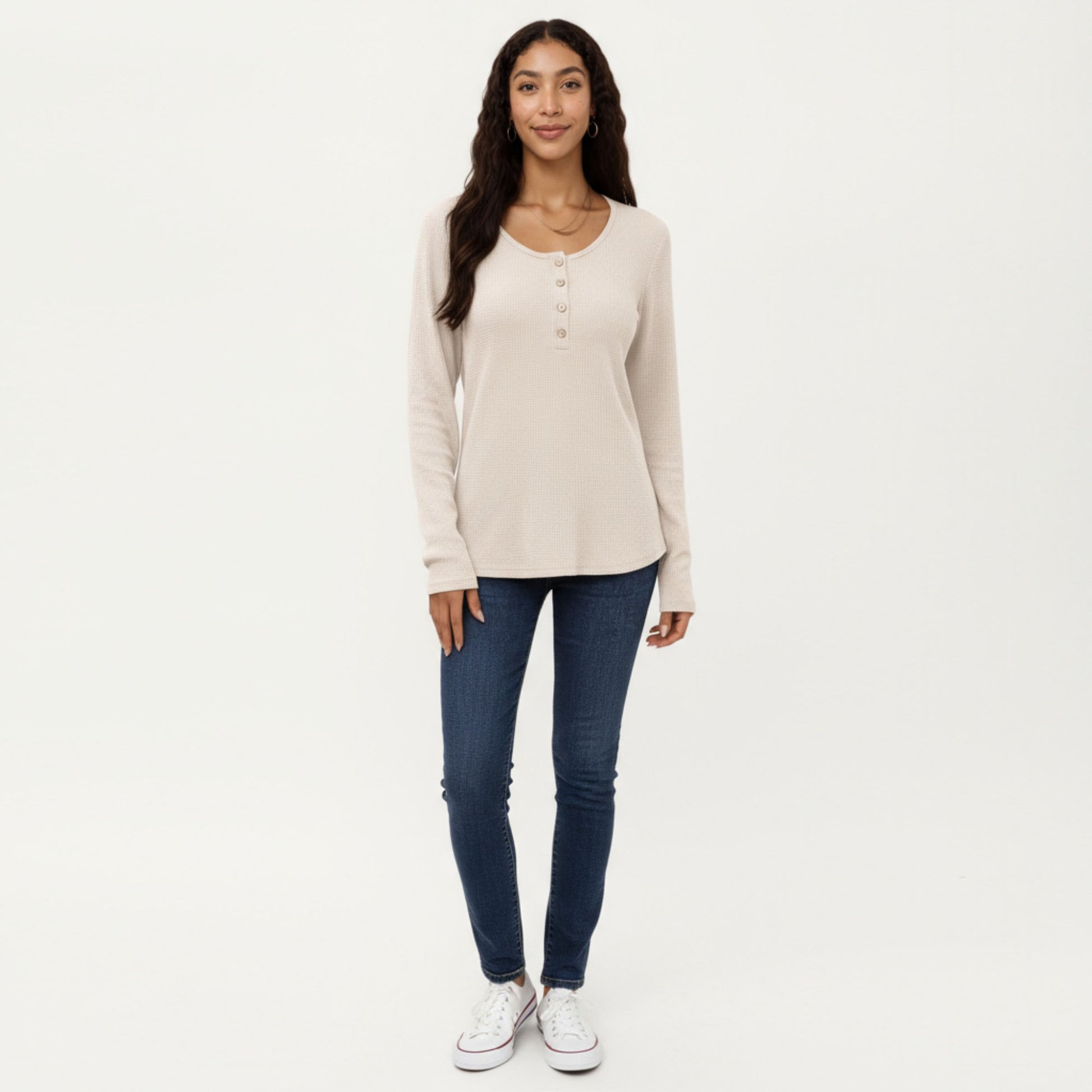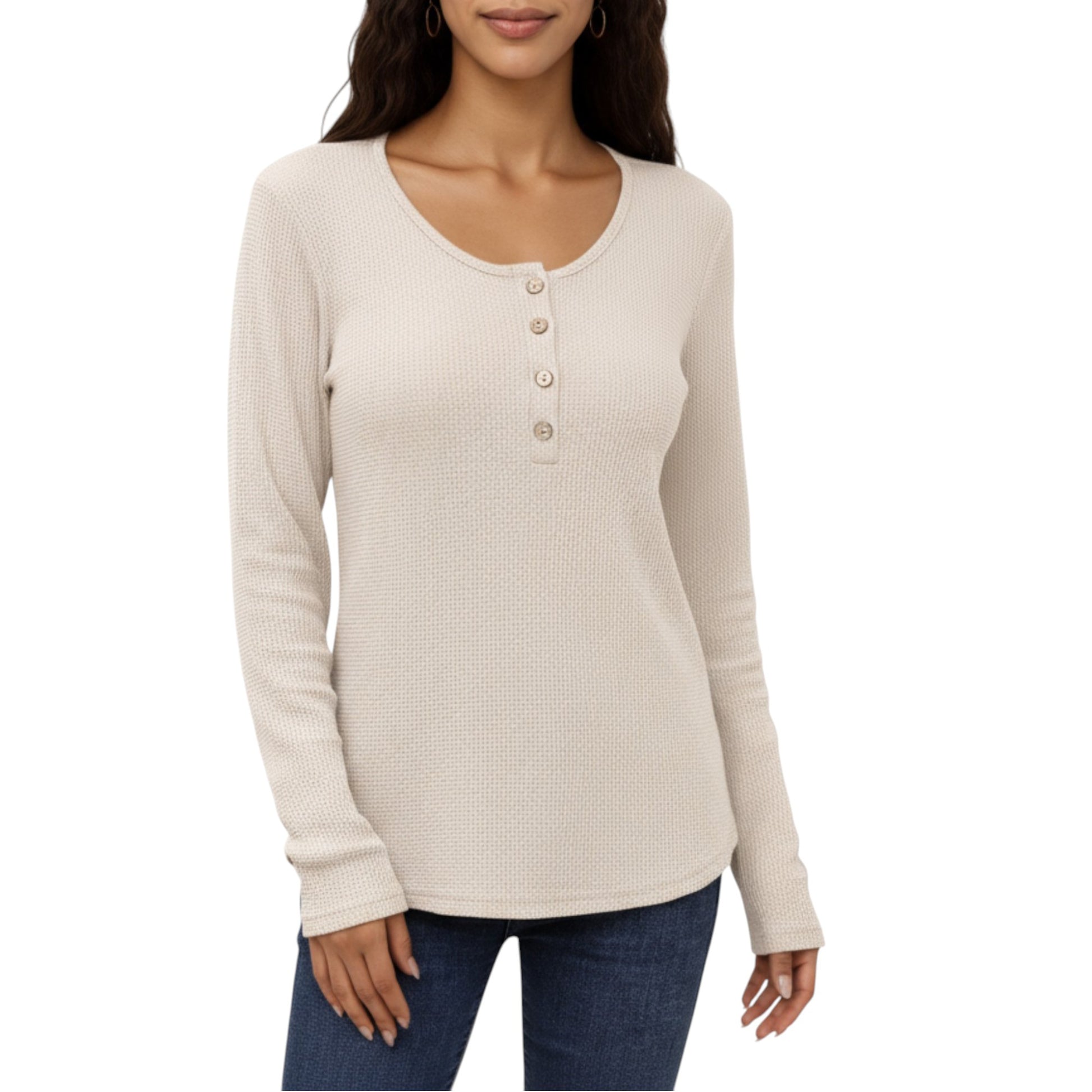 The Anna-Kaci Women's Long Sleeve Button-Front Scoop Neck Top blends classic style with cozy comfort. Made from a soft textured knit fabric, this top features a flattering scoop neckline with a functional button-front detail. Perfect for pairing with jeans or leggings, it offers a relaxed fit ideal for casual everyday wear.