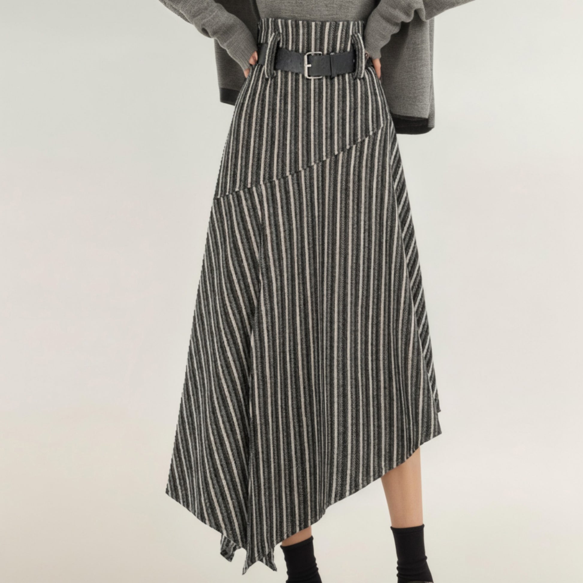 Anna-Kaci Women's Asymmetrical Pinstripe Midi Skirt with High Waist and Tailored Draping