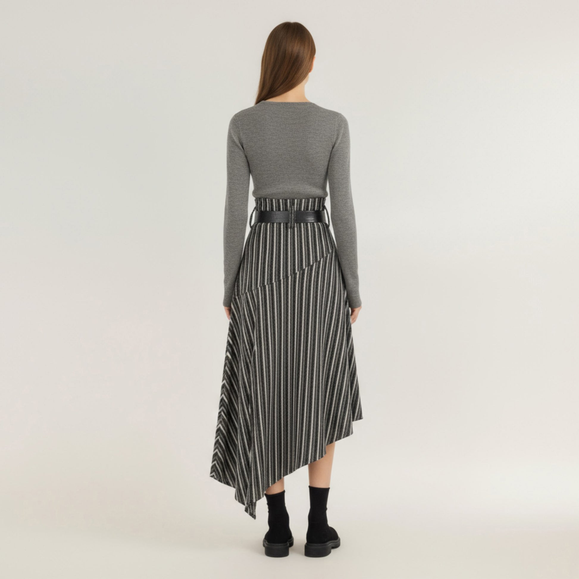 The Anna-Kaci Women's Asymmetrical Pinstripe Midi Skirt combines refined tailoring with a modern edge. Designed with a structured high waist and cascading hemline, it offers a sophisticated silhouette that moves effortlessly. The sleek pinstripe pattern enhances its polished appeal, while the asymmetrical cut adds a touch of contemporary flair. Crafted from a smooth, mid-weight fabric, this skirt pairs beautifully with blouses or fitted tops for an elegant, elevated look.