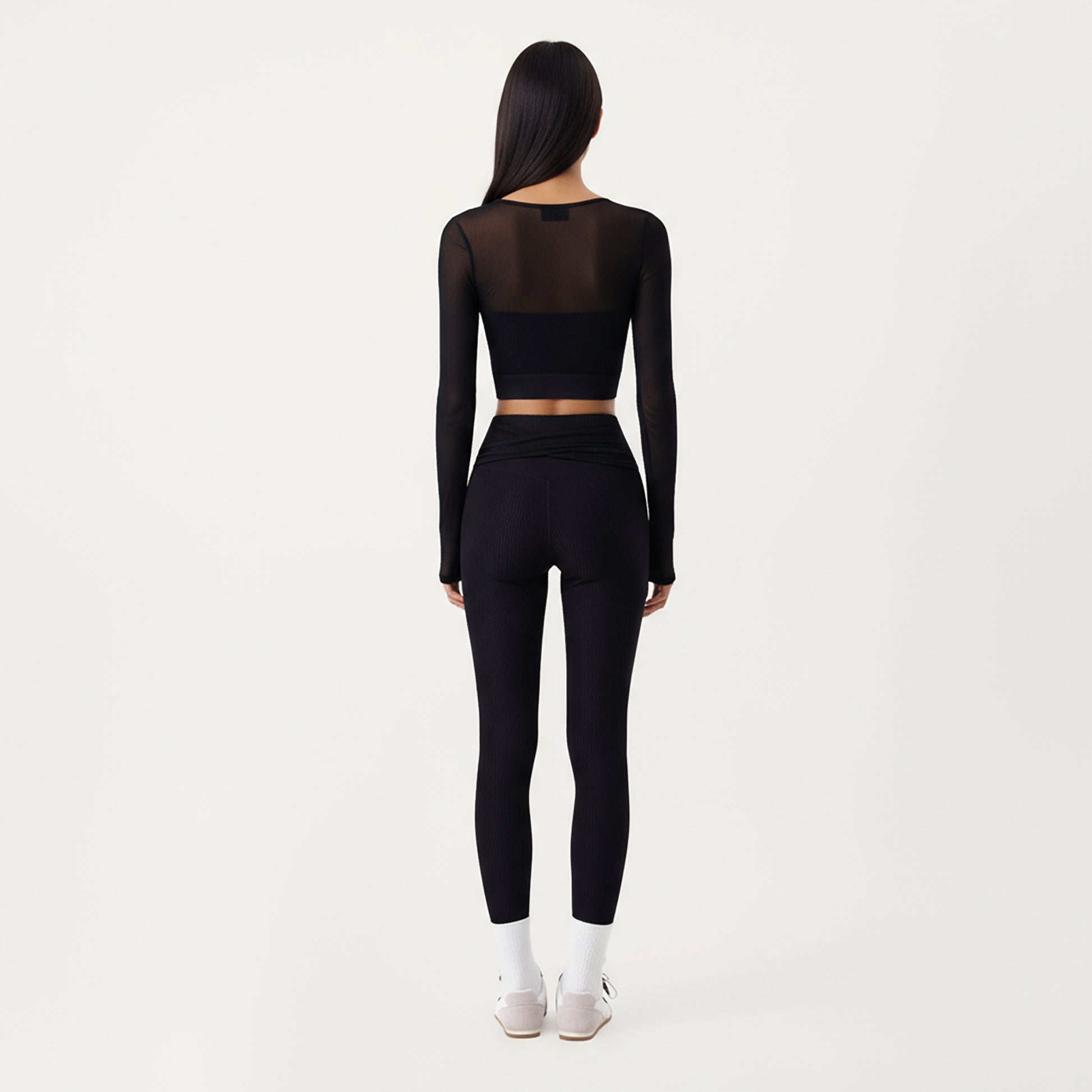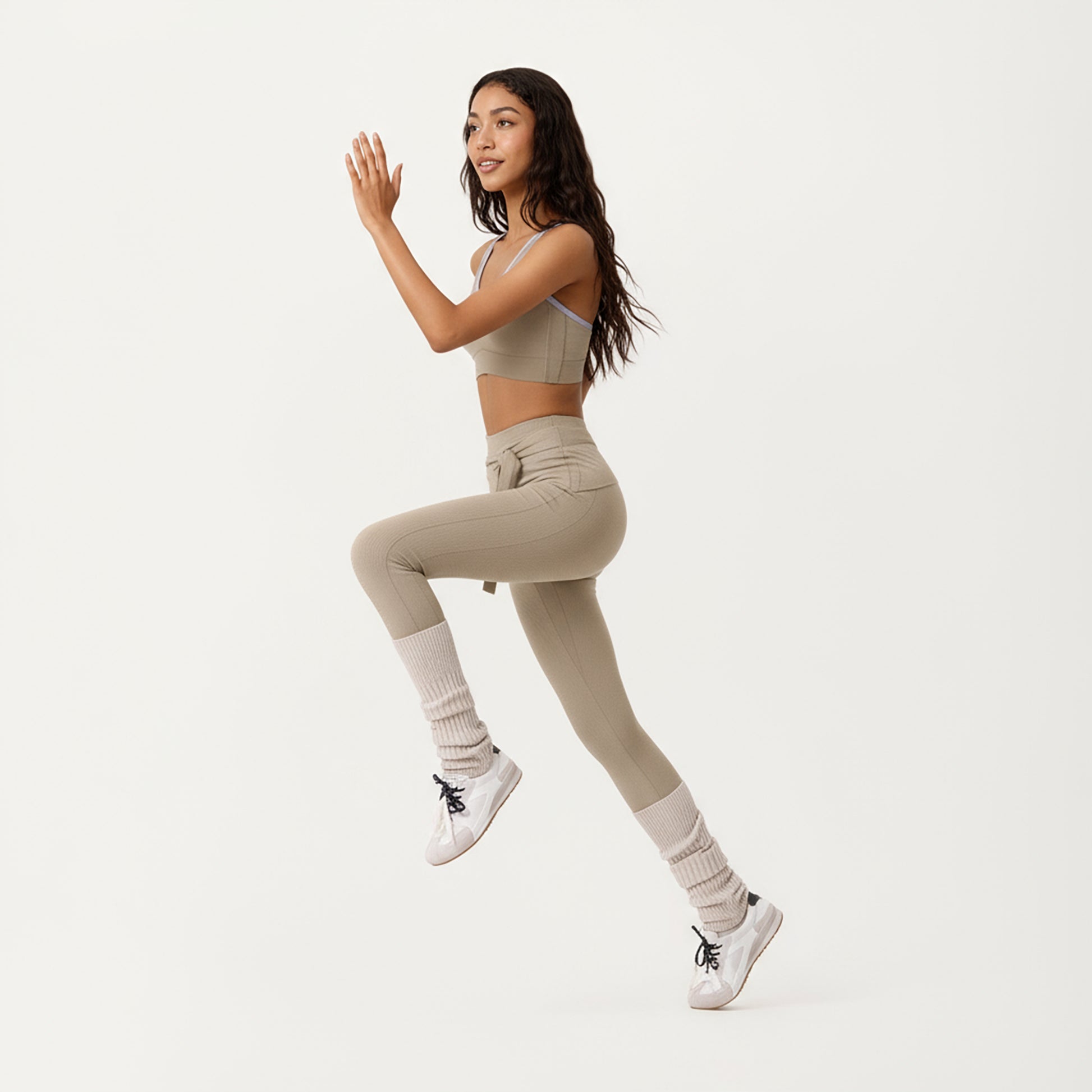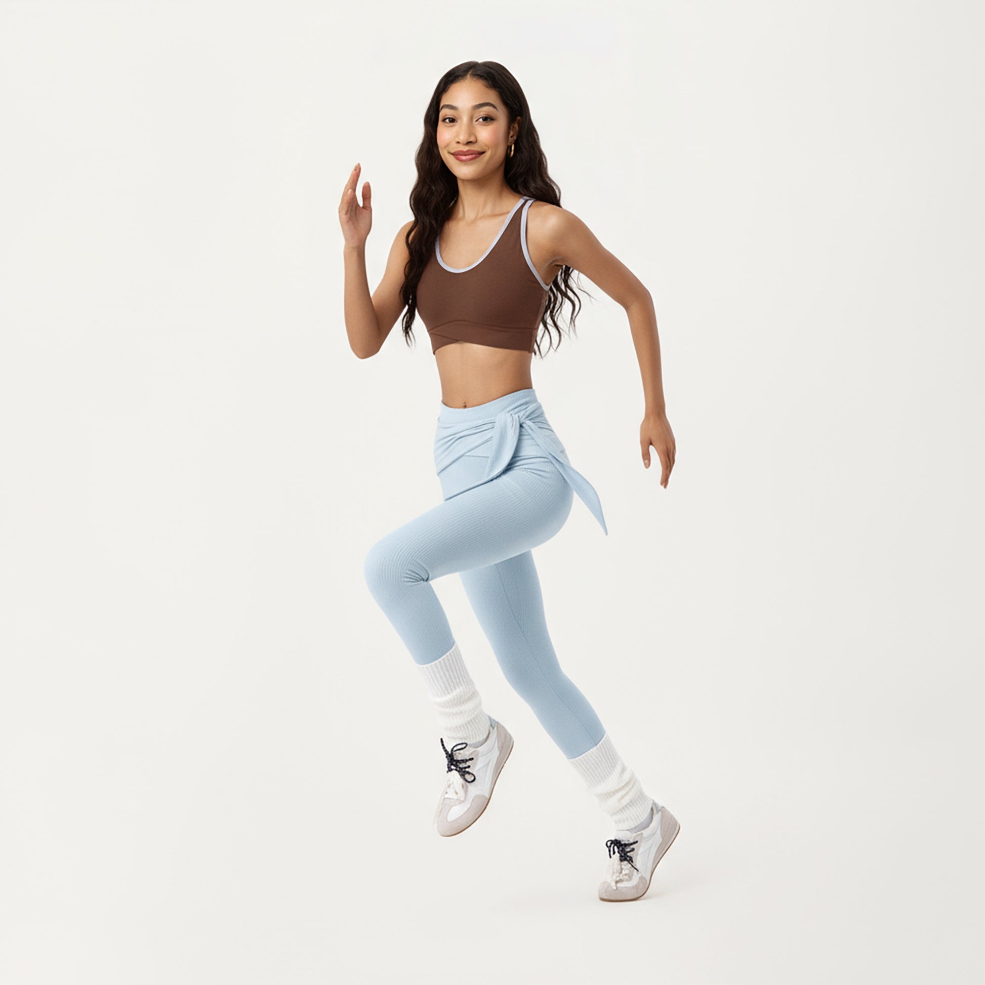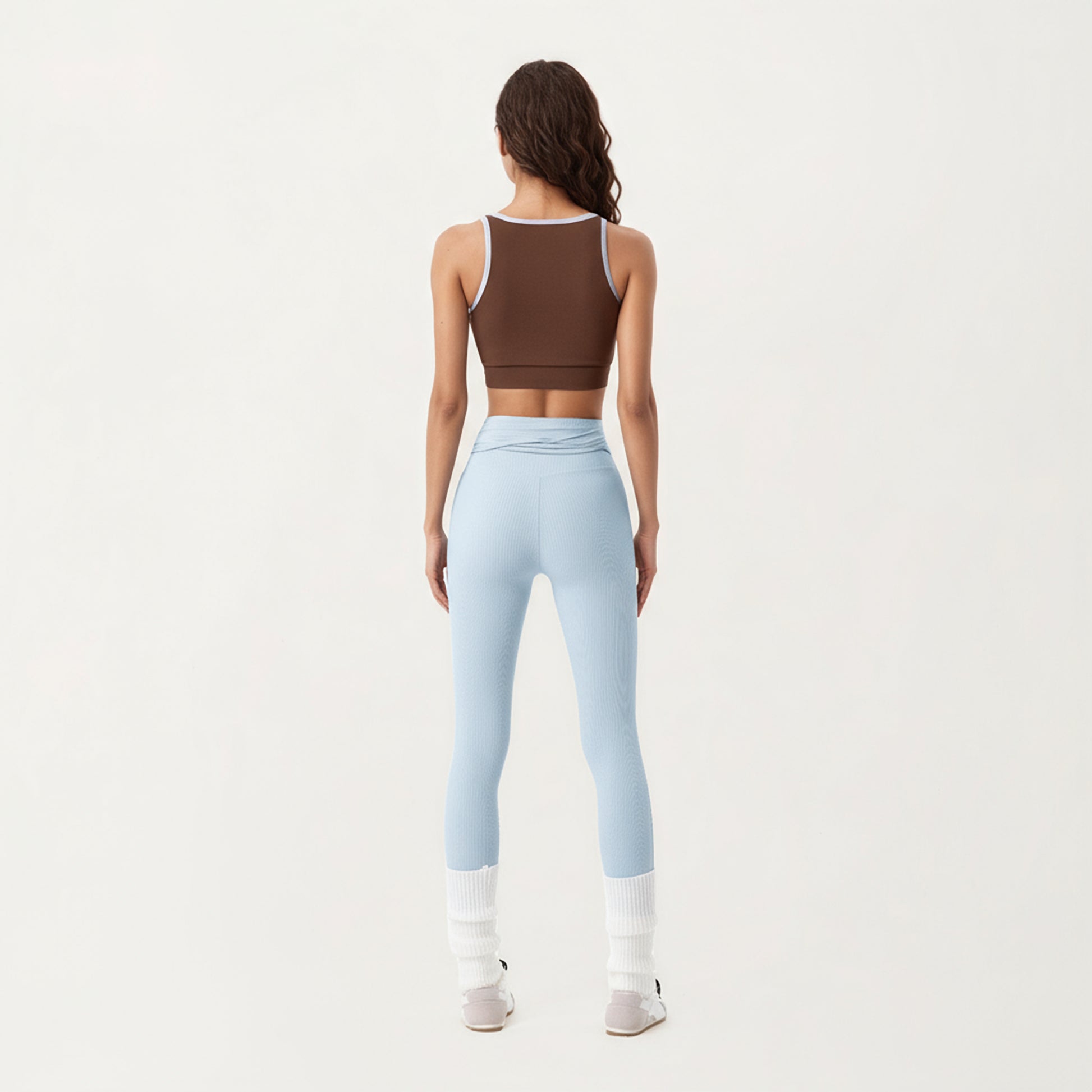 Anna-Kaci Active Women's Ribbed Knit High Waist Leggings with Wrap Tie Waistband and Contrast Cuffed Hem