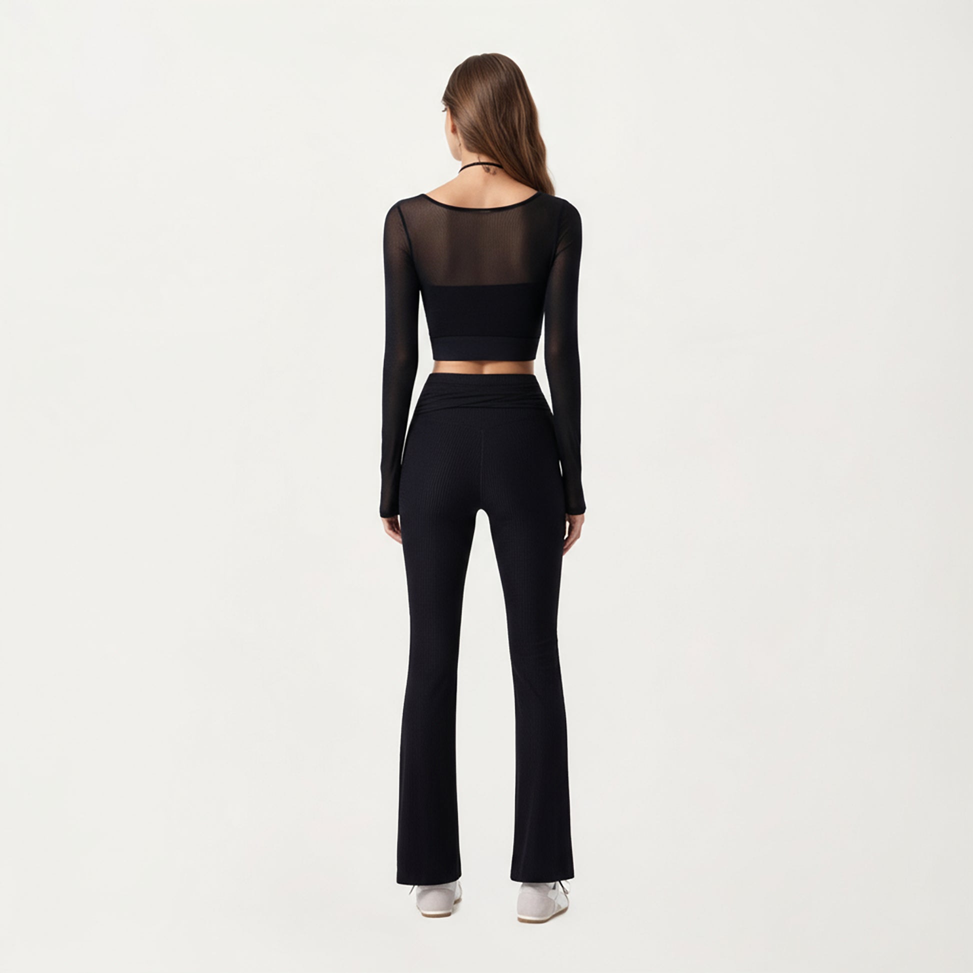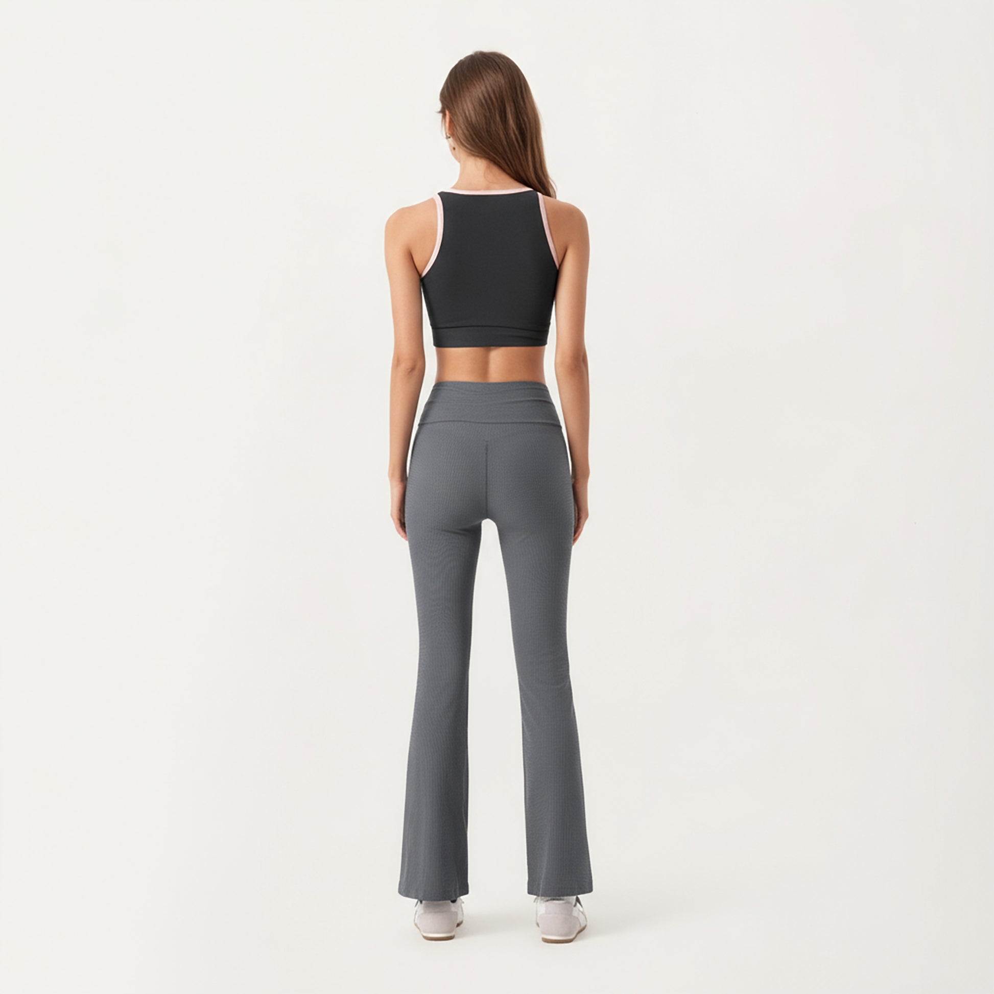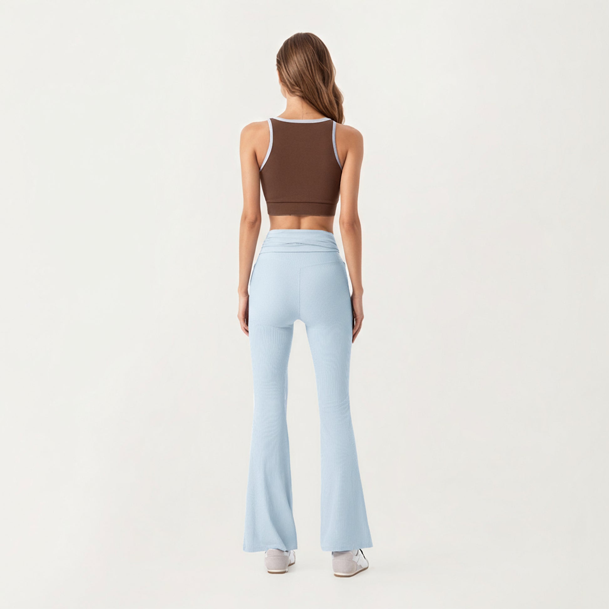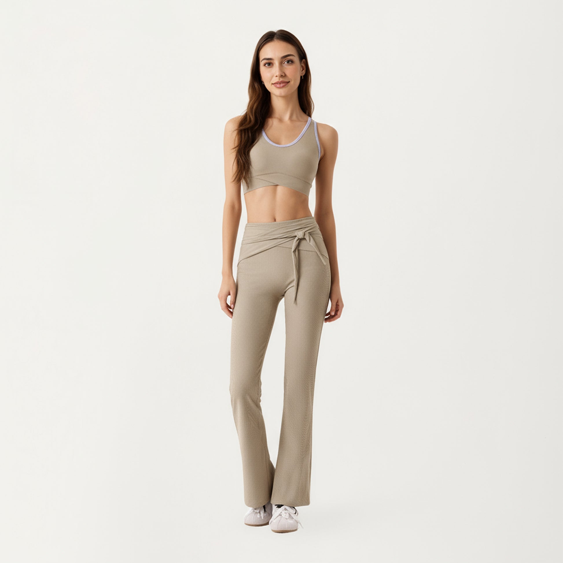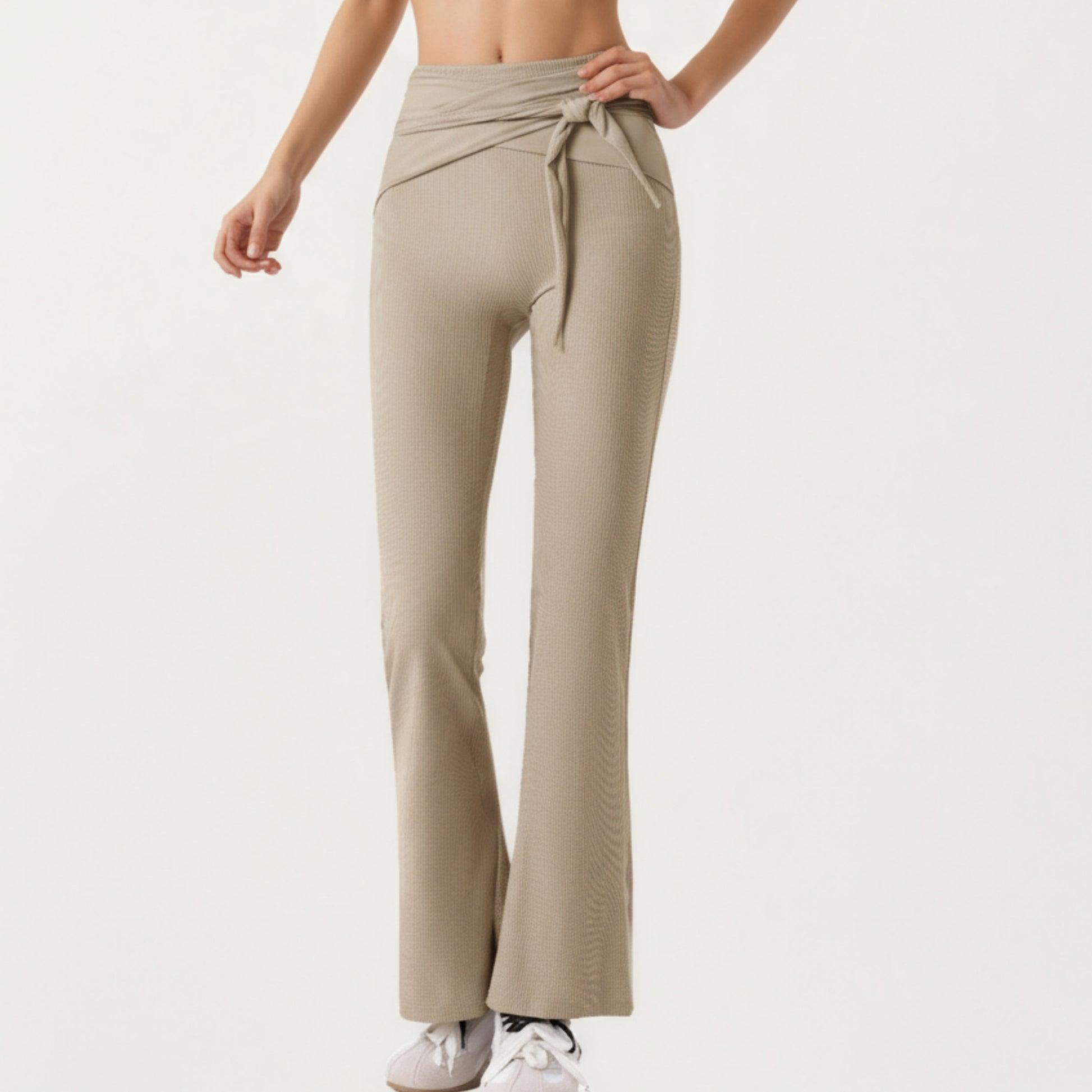 Anna-Kaci Active Women's Ribbed Knit Flare Pants with Wrap Tie Waistband and High Waist Silhouette