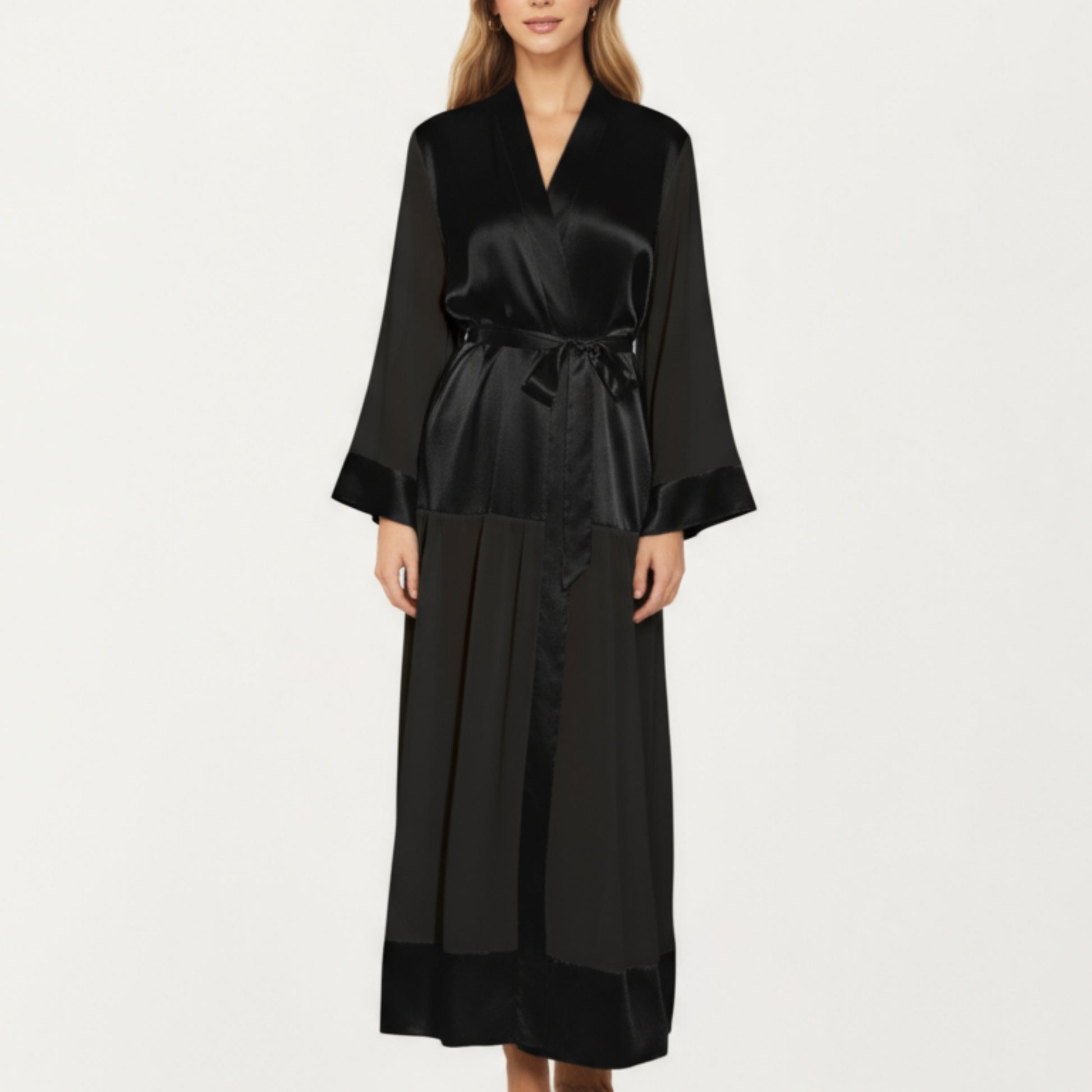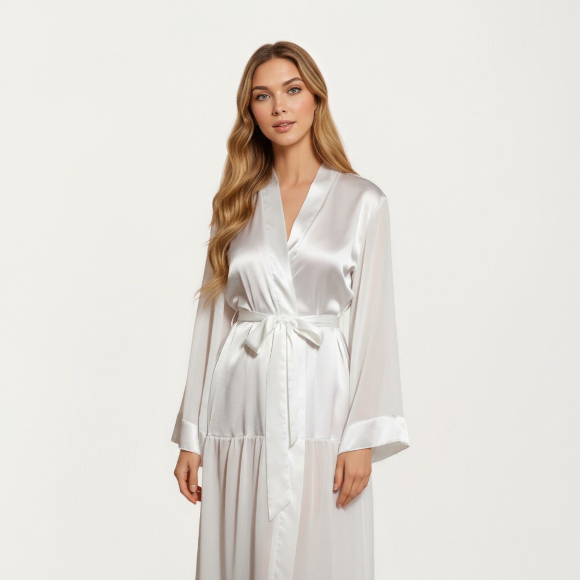 The Anna-Kaci Women's Long Satin Robe with Tie Waist Belt and Wide Cuff Sleeves combines elegance and comfort in a timeless design. Crafted from smooth, silky satin, this floor-length robe features a flattering belted waist that cinches effortlessly for a graceful silhouette. The wide cuff sleeves and soft sheen add a touch of luxury, while the lightweight drape provides comfort and sophistication for lounging or getting ready.