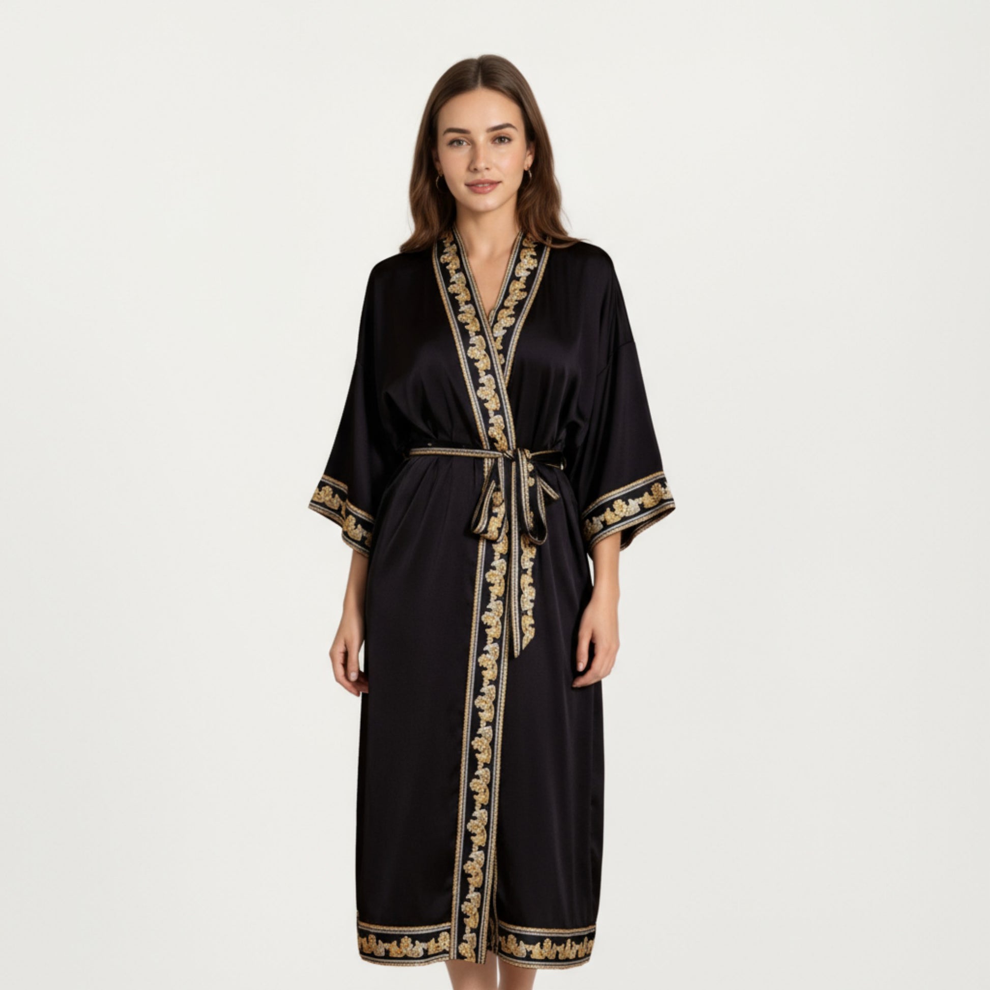 The Anna-Kaci Women's Long Satin Kimono Robe with Embroidered Trim and Wide Sleeves exudes luxury and sophistication. Designed with intricate gold embroidery along the borders and cuffs, this satin robe offers a stunning contrast against its smooth, silky base. The open-front design and wide sleeves provide effortless drape and comfort, making it perfect for layering over sleepwear or lounging in elegance.