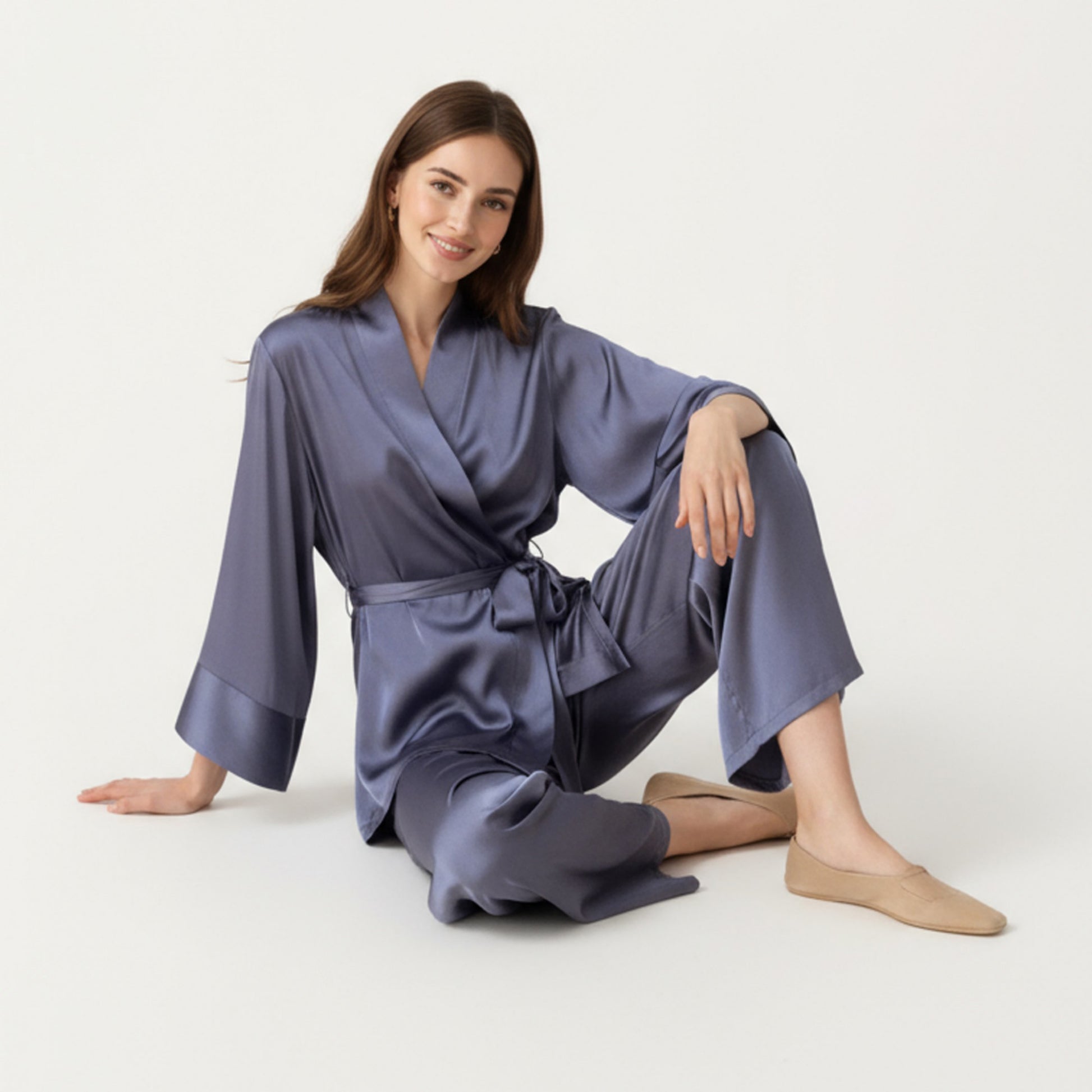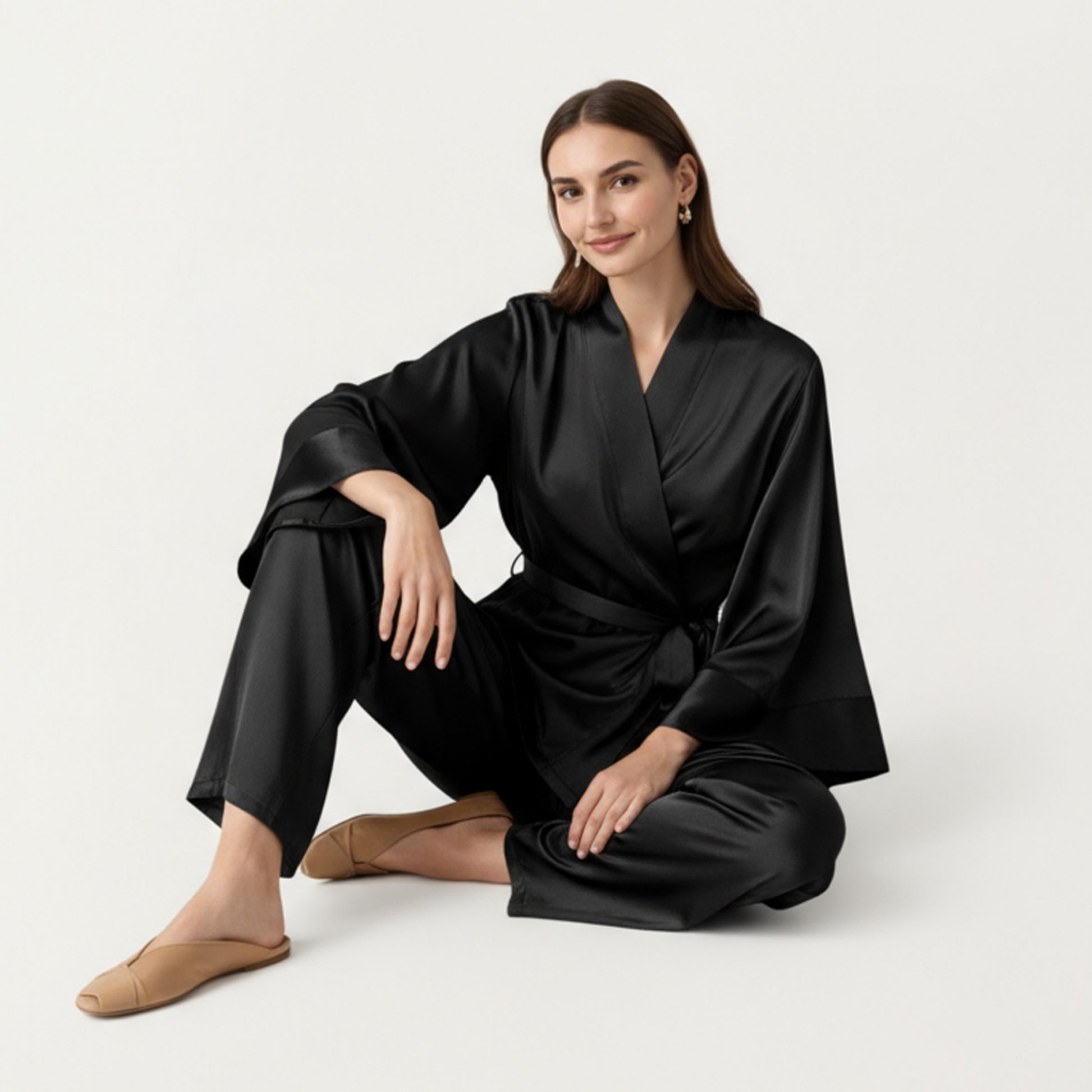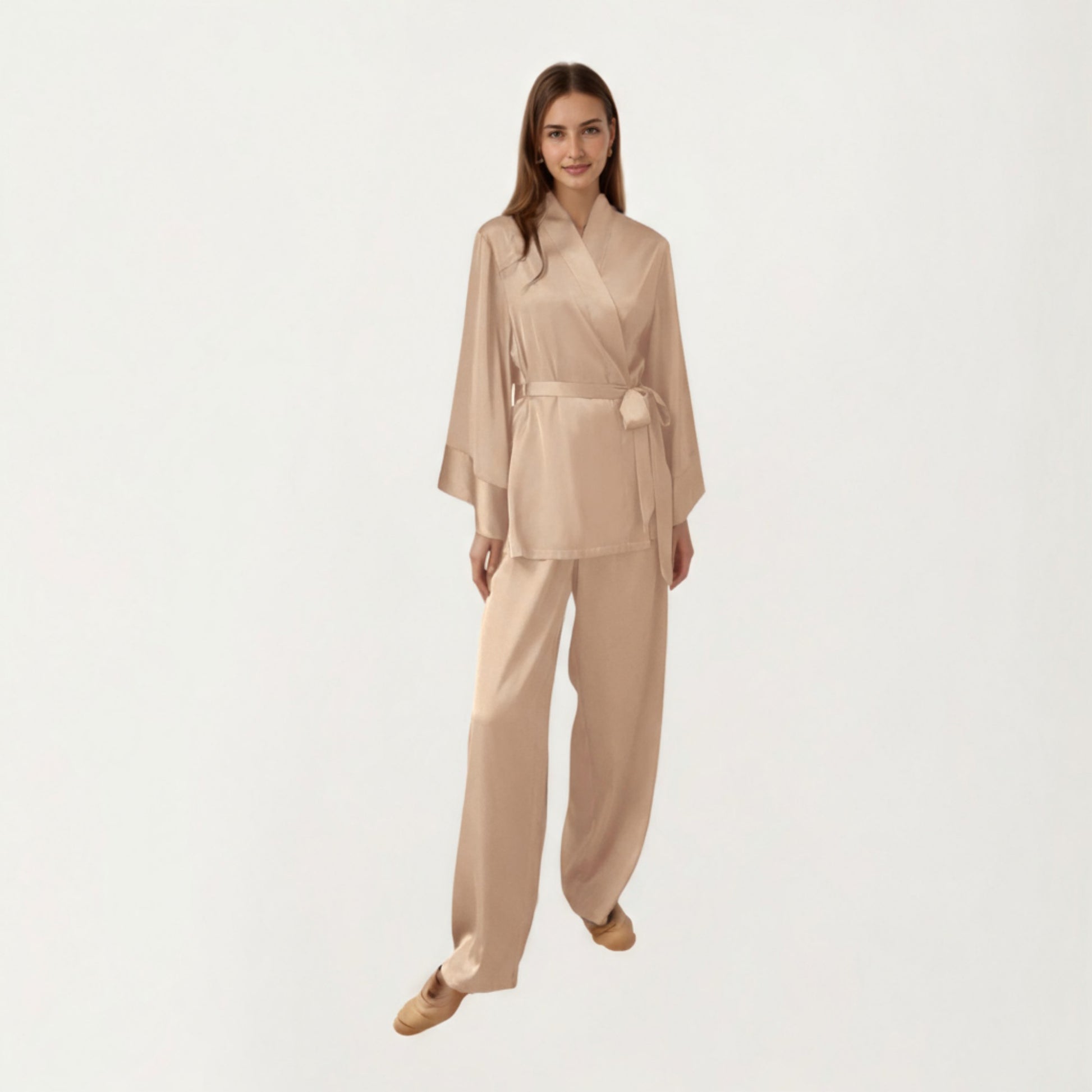 The Anna-Kaci Women's 2-Piece Satin Pajama Set with Kimono Sleeve Wrap Top and Wide-Leg Pants combines elegant design with luxurious comfort. Crafted from smooth satin fabric, this set features a wrap-style top with a self-tie waist and wide, flowing sleeves. The relaxed wide-leg pants offer an effortlessly chic silhouette, perfect for lounging in refined style.