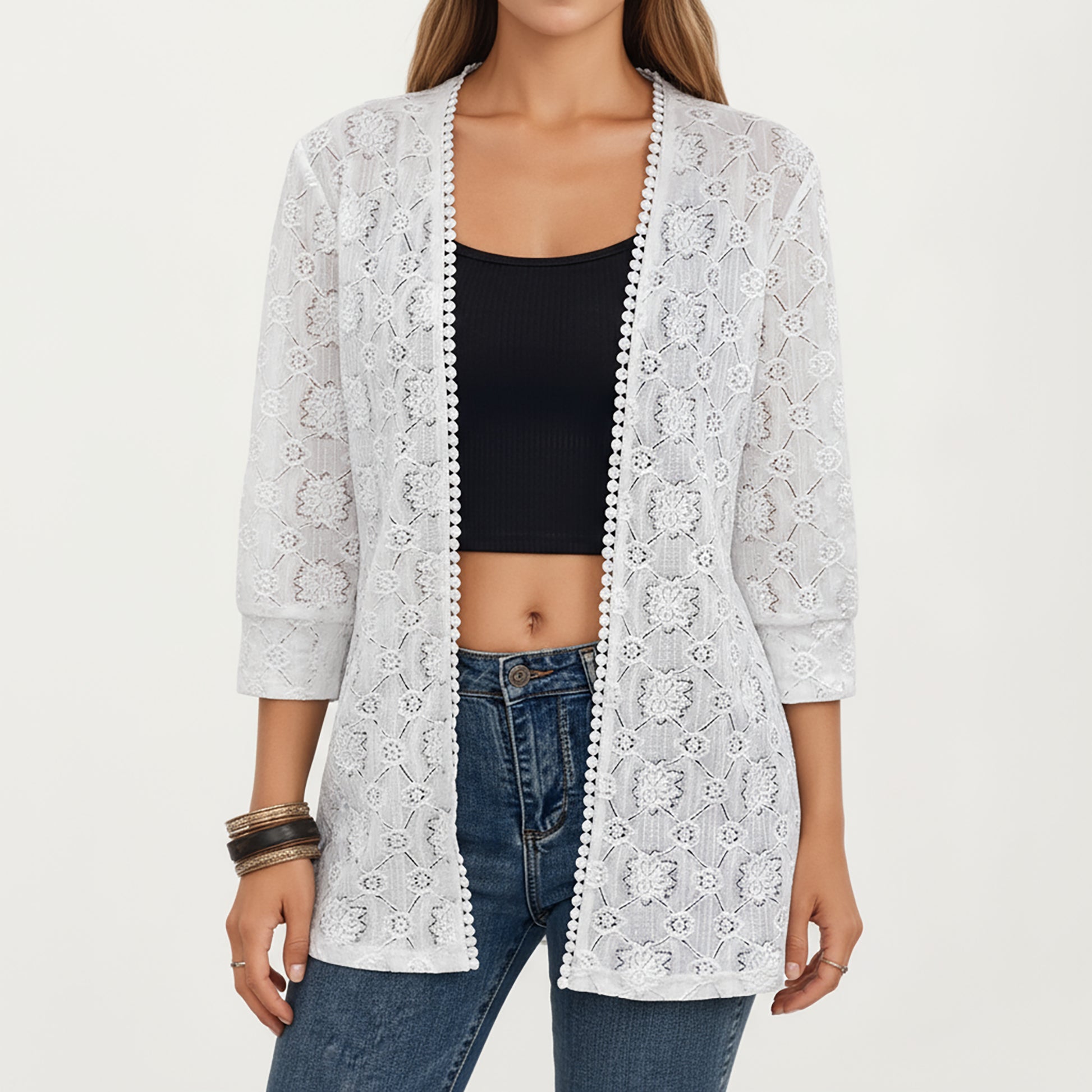The Anna-Kaci Women's 3/4 Sleeve Open Front Lace Kimono Cardigan with Floral Crochet Detailing adds a delicate touch to any outfit. Featuring an intricate floral lace design, this open-front cardigan offers a lightweight and breezy layer perfect for layering over tops, dresses, or tanks. The 3/4 sleeves and scalloped trim enhance its feminine appeal, creating a timeless look that¡¯s both versatile and effortlessly stylish.