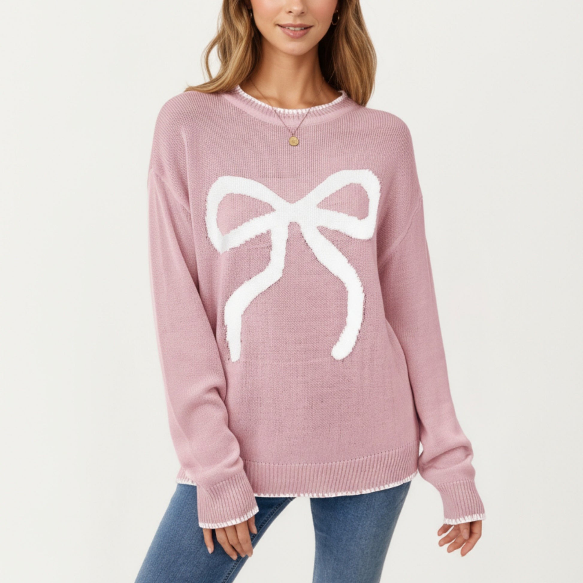 The Anna-Kaci Women's Long Sleeve Knit Sweater with Textured Bow Front Detail and Ribbed Trim combines feminine charm with cozy comfort. Featuring a large textured bow design across the front, this sweater adds a playful yet elegant touch to your casual wardrobe. The soft knit fabric ensures warmth and comfort, while the ribbed neckline, cuffs, and hem enhance durability and structure. With its relaxed fit, this sweater pairs effortlessly with jeans or skirts for a chic, easygoing look.