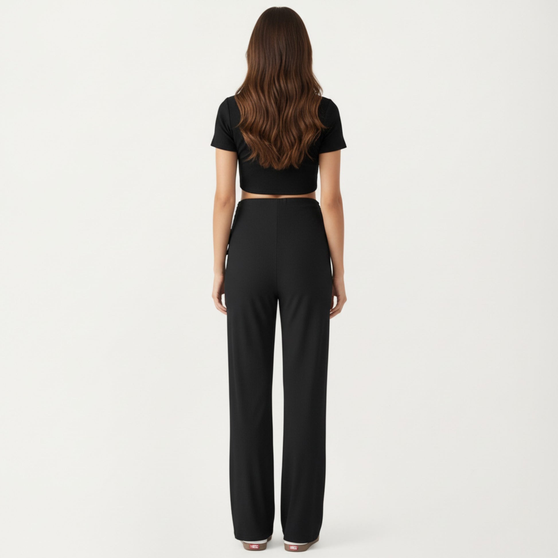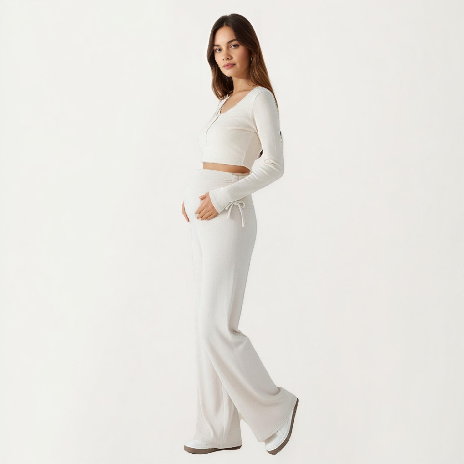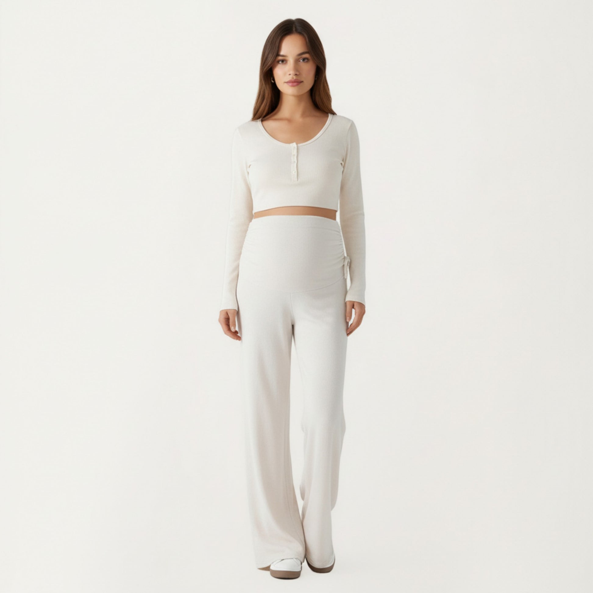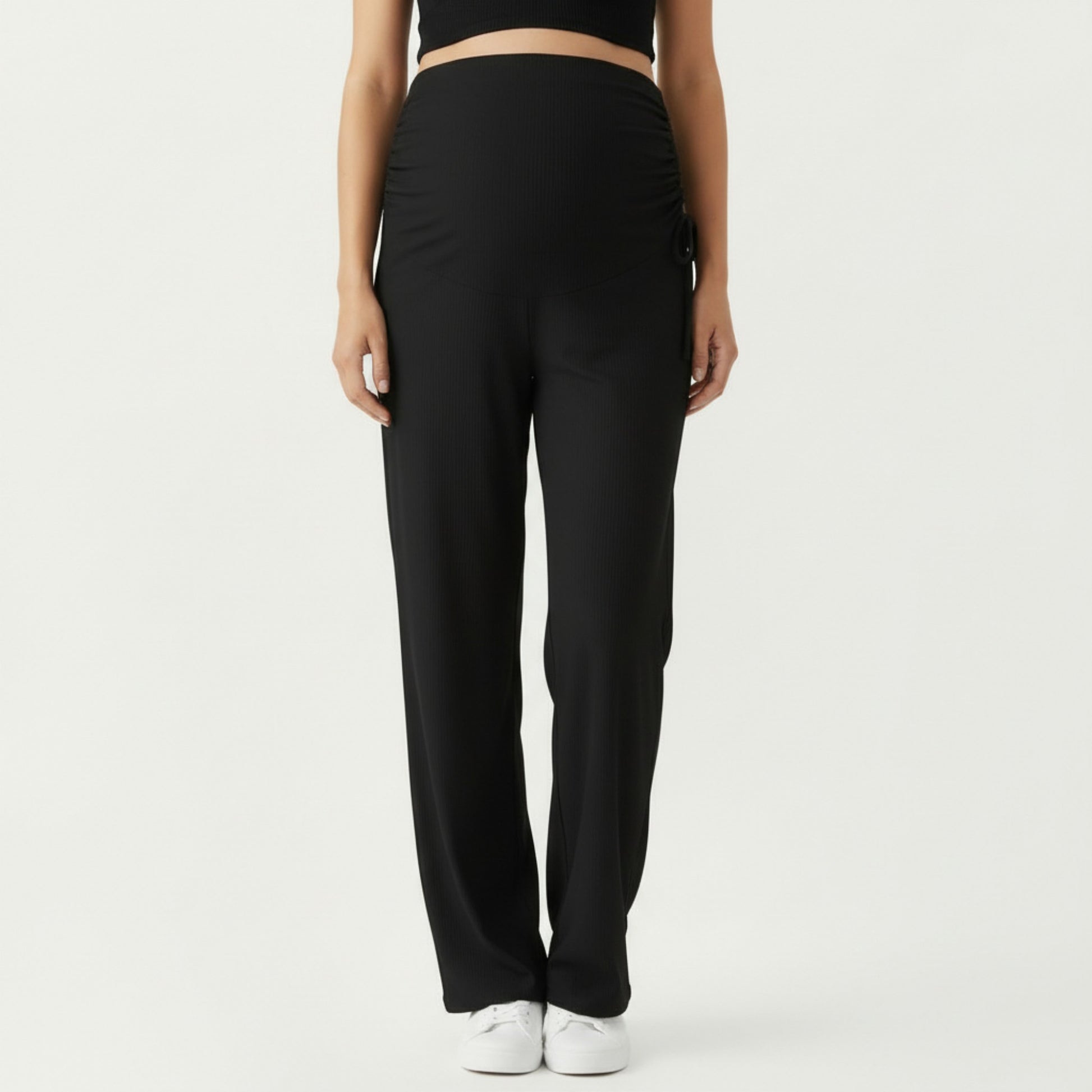 These Anna-Kaci Women¡¯s maternity pants feature a soft stretch knit fabric that provides gentle comfort and flexibility as your bump grows. The adjustable ruched waist with side ties allows a customizable fit while creating a flattering shape. A relaxed wide-leg silhouette offers breathable ease and smooth drape for everyday wear. Designed for softness and support, these pants pair effortlessly with tees, tanks, and cozy layers.