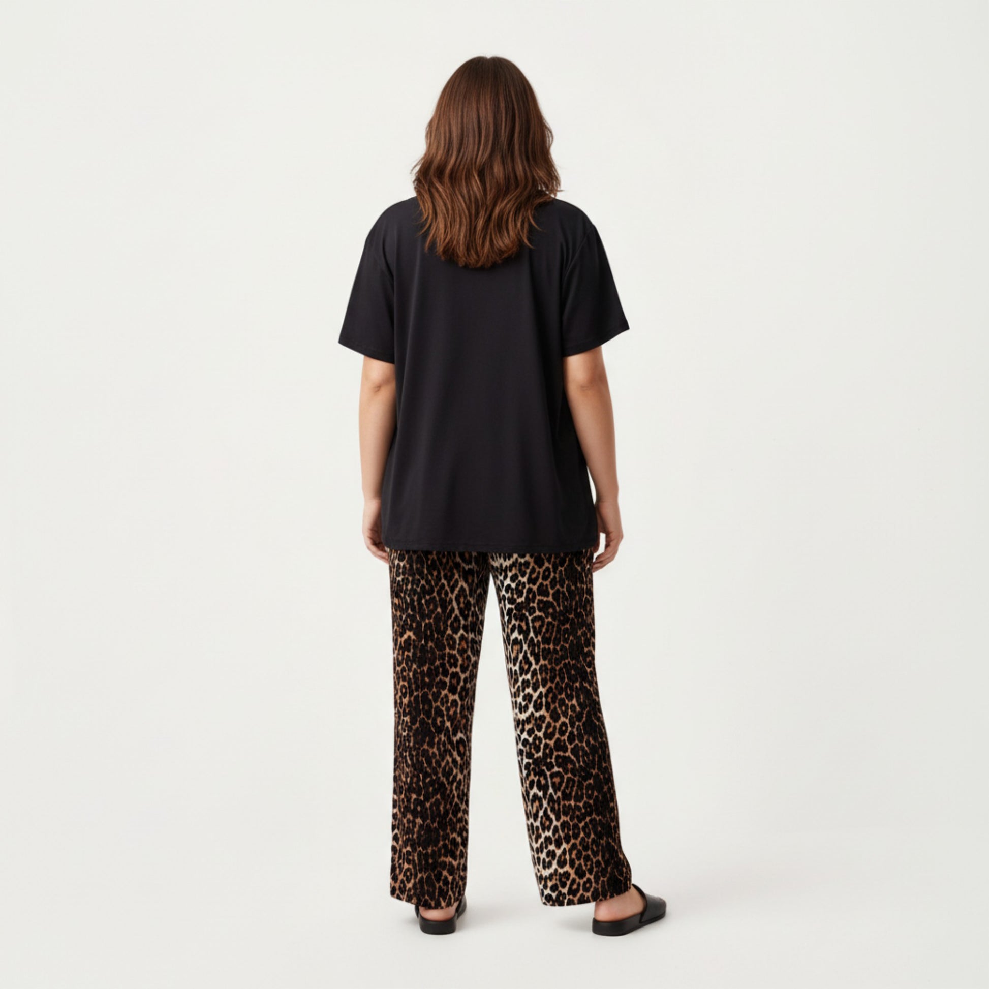 This Anna-Kaci Women¡¯s 2-Piece Set pairs a soft knit short sleeve top with bold leopard print pajama pants for a comfortable, coordinated look. The top features a smooth, lightweight drape, while the relaxed straight-leg pants offer easy movement and a flexible waistband with a decorative tie. Designed for gentle softness and breathable comfort, this set creates an effortless sleepwear style with a polished, modern feel.
