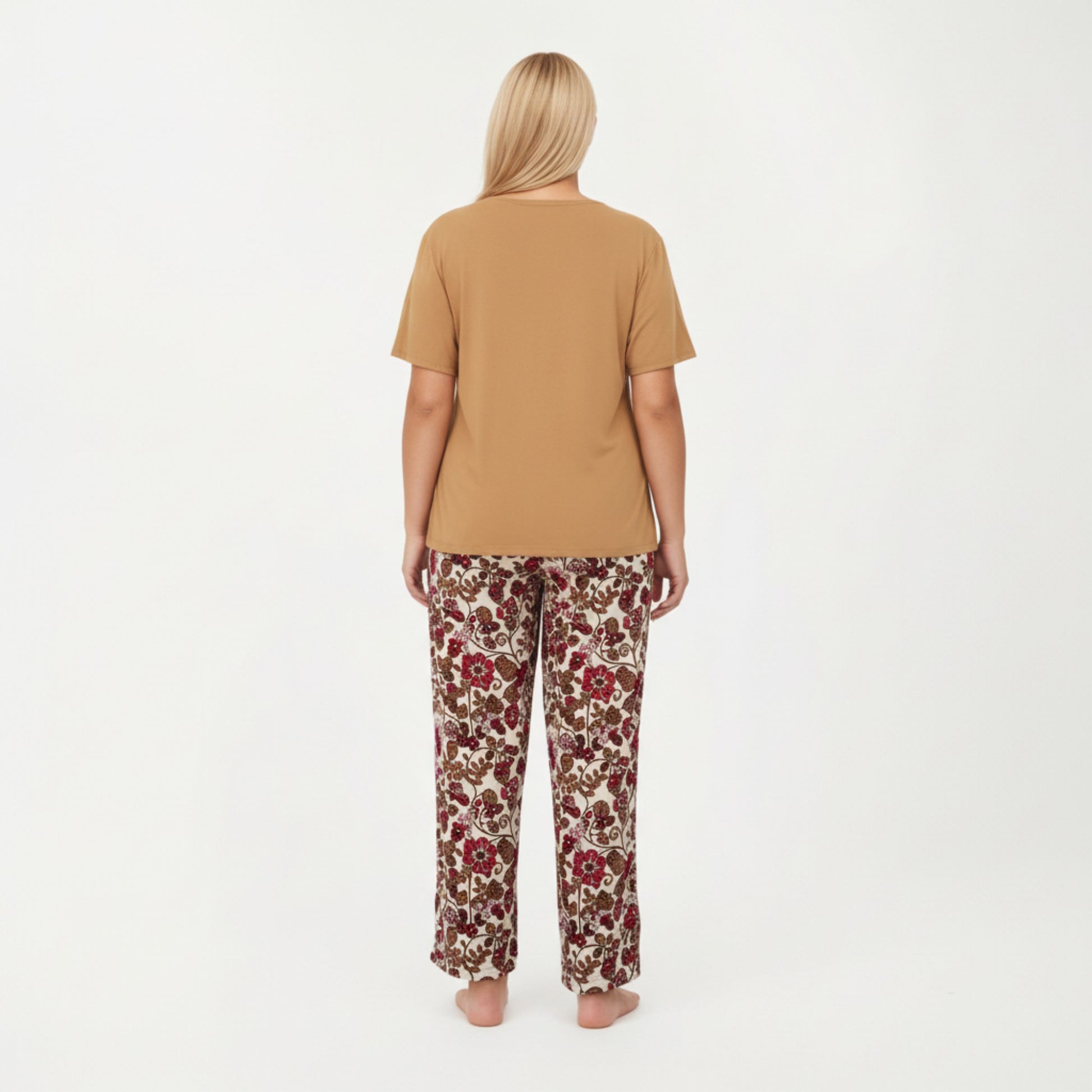 This Anna-Kaci Women¡¯s 2-Piece Set features a soft stretch knit top paired with printed wide-leg pajama pants for a comfortable, coordinated look. The short sleeve top drapes smoothly with a lightweight feel, while the pants offer a relaxed silhouette enhanced by an intricate floral print. Together, they create a breathable, easy-to-wear pajama set designed for gentle movement, softness, and all-night comfort.